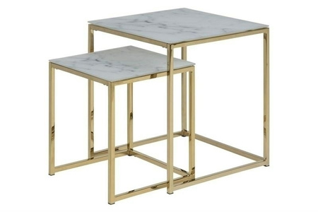 - Zestaw stolików kawowych Alisma od duńskiej marki ACTONA. Dwa praktyczne stoliki ze szklanymi blatami z marmurowym nadrukiem. Blaty umieszczono na metalowych złotych podstawach. Dzięki możliwości schowania mniejszego stolika pod większym, oszczędzamy miej