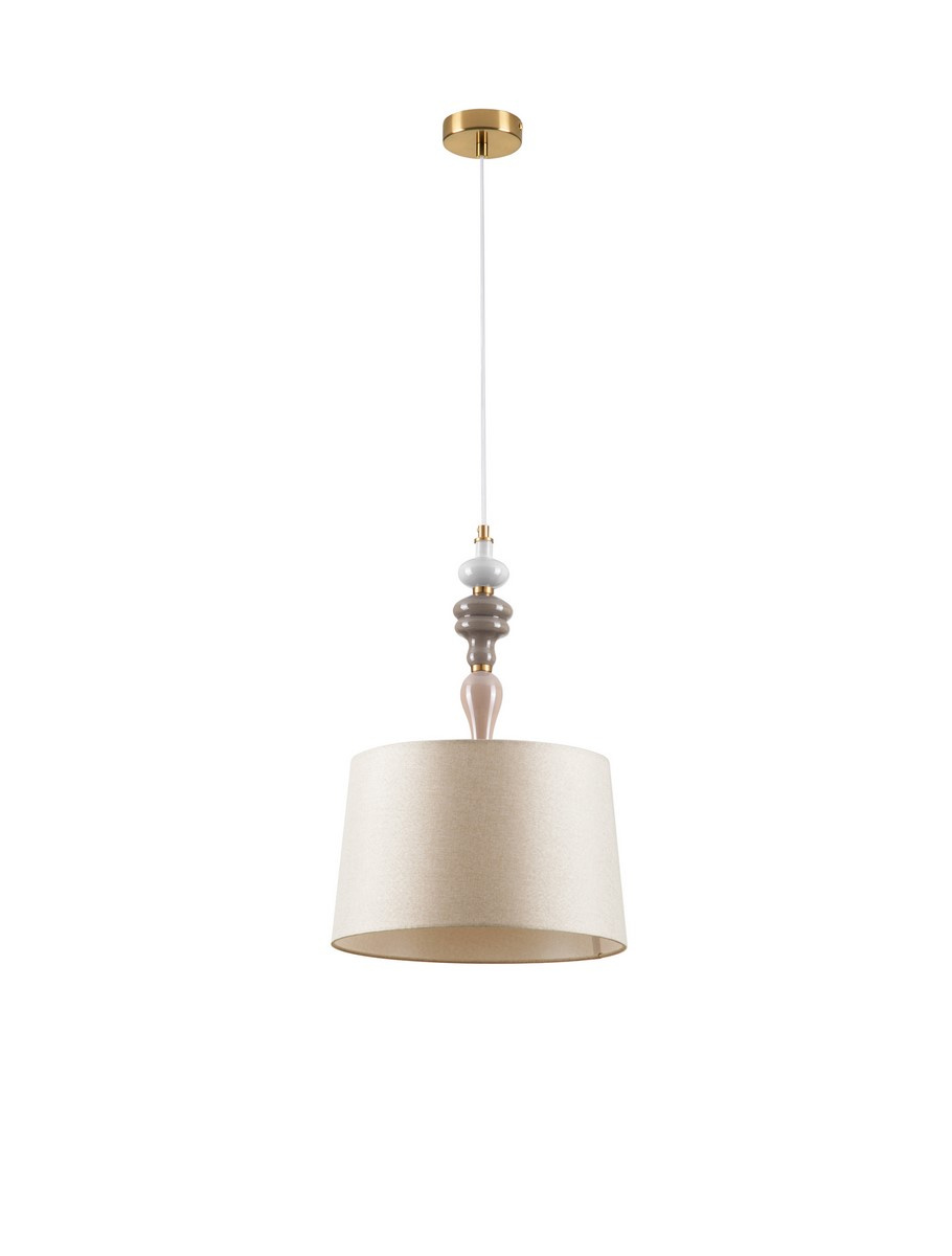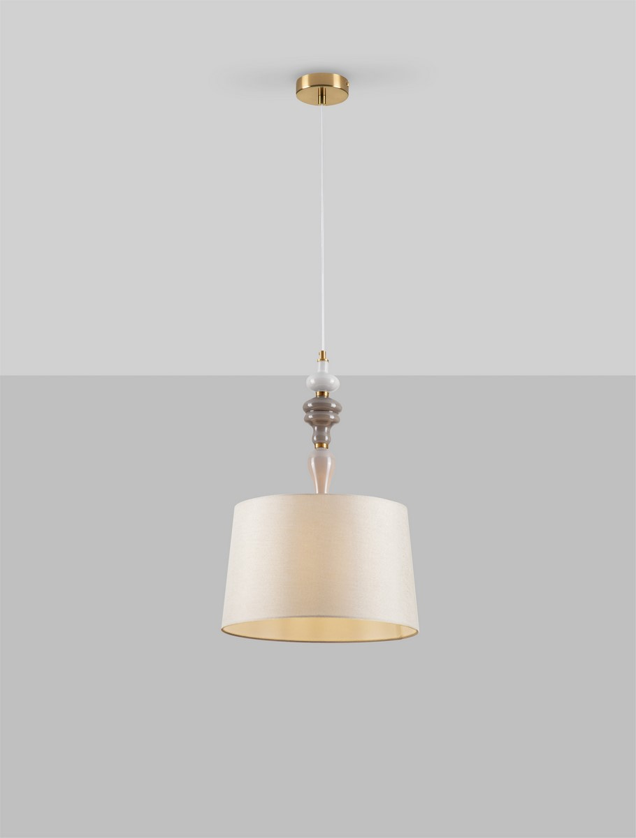 - ALEM - Lampa wisząca od Luces Exclusivas. Wykonana z wysokiej jakości metalu, ceramiki oraz tkaniny, ma wysokość 150 cm. Jej klasyczny design idealnie wpasowuje się we wnętrza typu kuchni czy też jadalni. Lampa w odcieniach beżu, szerości i bieli. Zawiesz