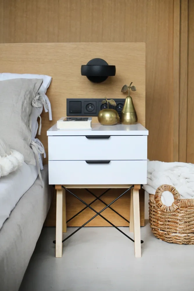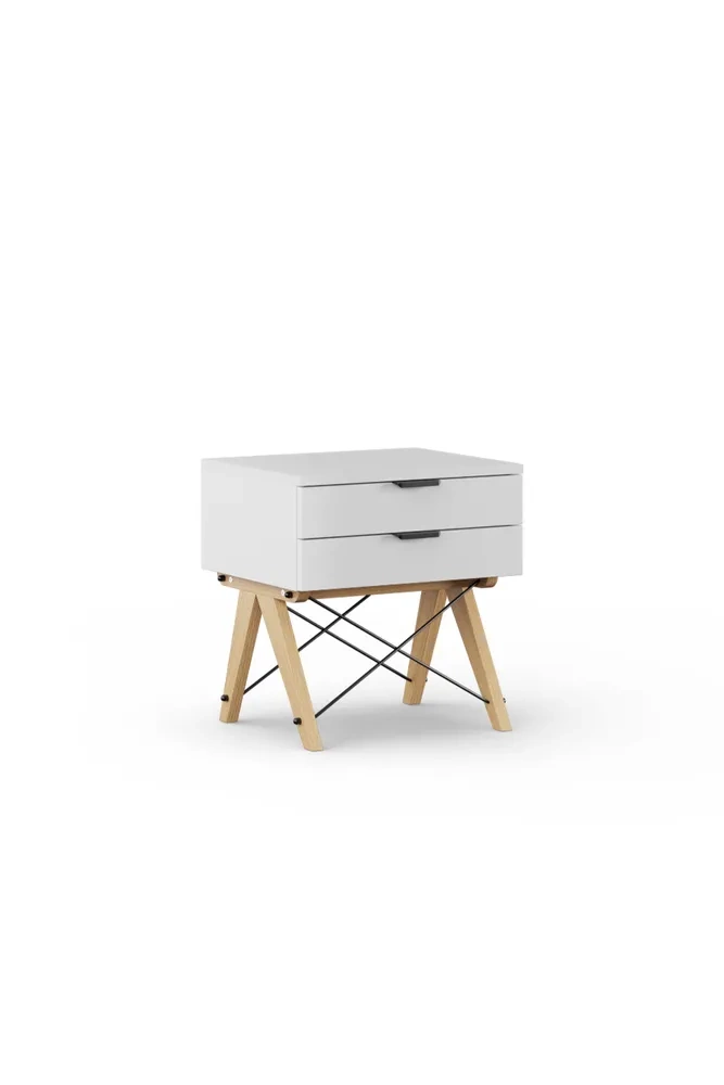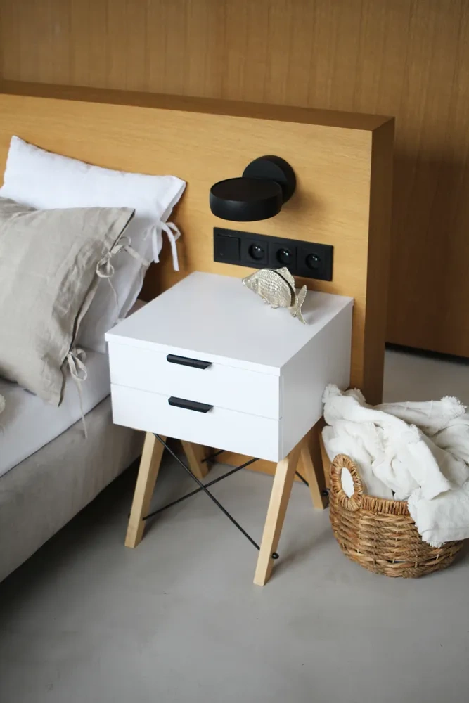 W tej ofercie szafka nocna dostępna jest w uniwersalnym białym kolorze, który perfekcyjnie dopełniają naturalne drewniane, bukowe nóżki. Dodatki w postaci drucików spinających i uchwytów PLAIN utrzymane zostały w czarnej kolorystyce. Taka szafka nocna będzie uniwersalnym meblem do każdej sypialni.