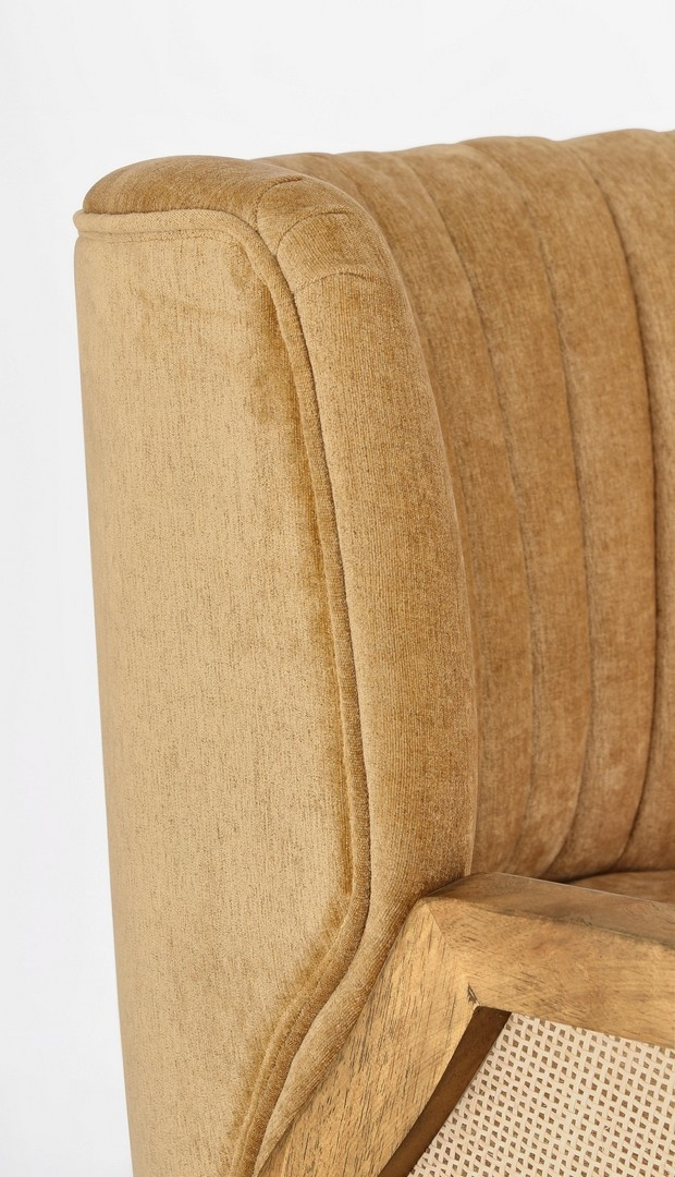 Podłokietniki wykonane z rattanu wprowadzają subtelną lekkość i naturalny akcent, zapewniając jednocześnie wygodę podczas użytkowania.