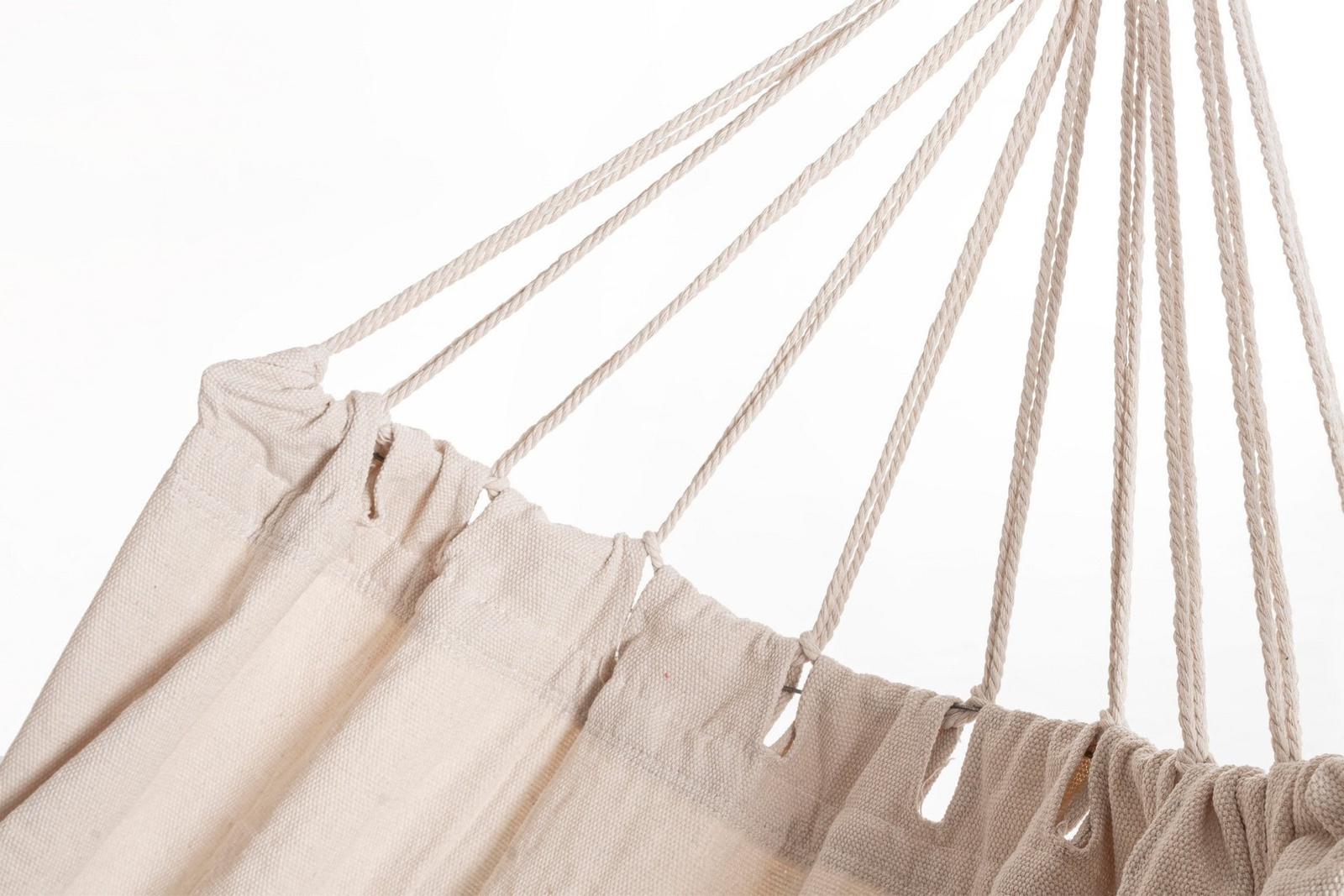 • BIZZOTTO hamak wiszący ELDORIS biały Znakomita strefa relaksu, idealna do ogrodu lub na taras, zachęcająca do wypoczynku. Wygodne i trwałe siedzisko z tkaniny polibawełnianej łączy naturalną miękkość bawełny z wytrzymałością nowoczesnych włókien. Biały ko