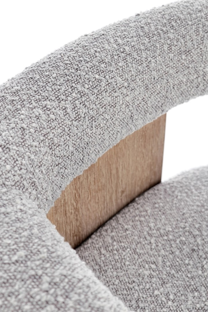 Pokrycie z tkaniny poliestrowej o dekoracyjnym efekcie bouclé w szarym kolorze nadaje meblowi przytulny i stylowy wygląd, a wypełnienie z pianki poliuretanowej o odpowiednio dobranej gęstości zapewnia wysoki komfort użytkowania.