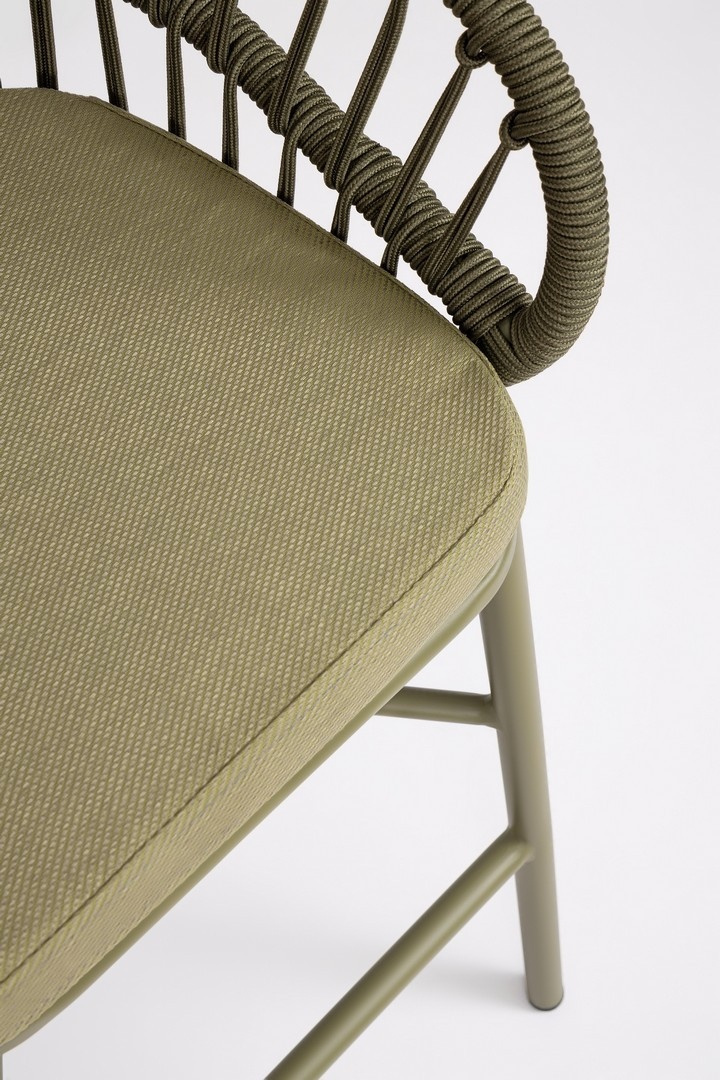 Oparcie zostało wykonane z plecionych, wodoodpornych lin poliestrowych, które gwarantują komfort oraz stylowy wygląd.