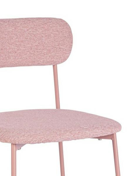 Tapicerka z miękkiej tkaniny w subtelnym różu zapewnia wygodę, a zaokrąglone linie siedziska i oparcia wprowadzają wizualną lekkość.