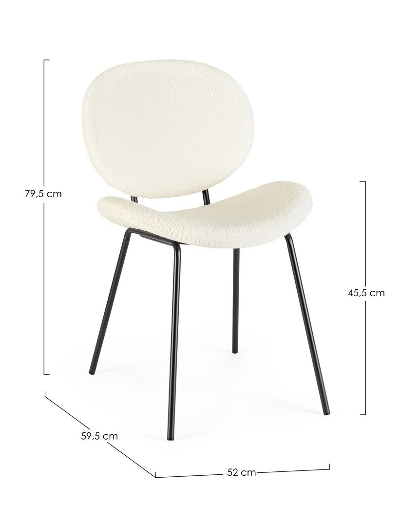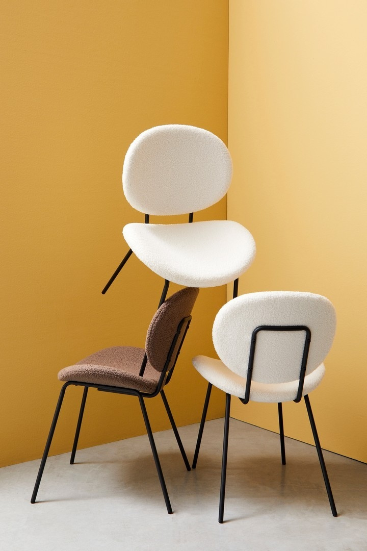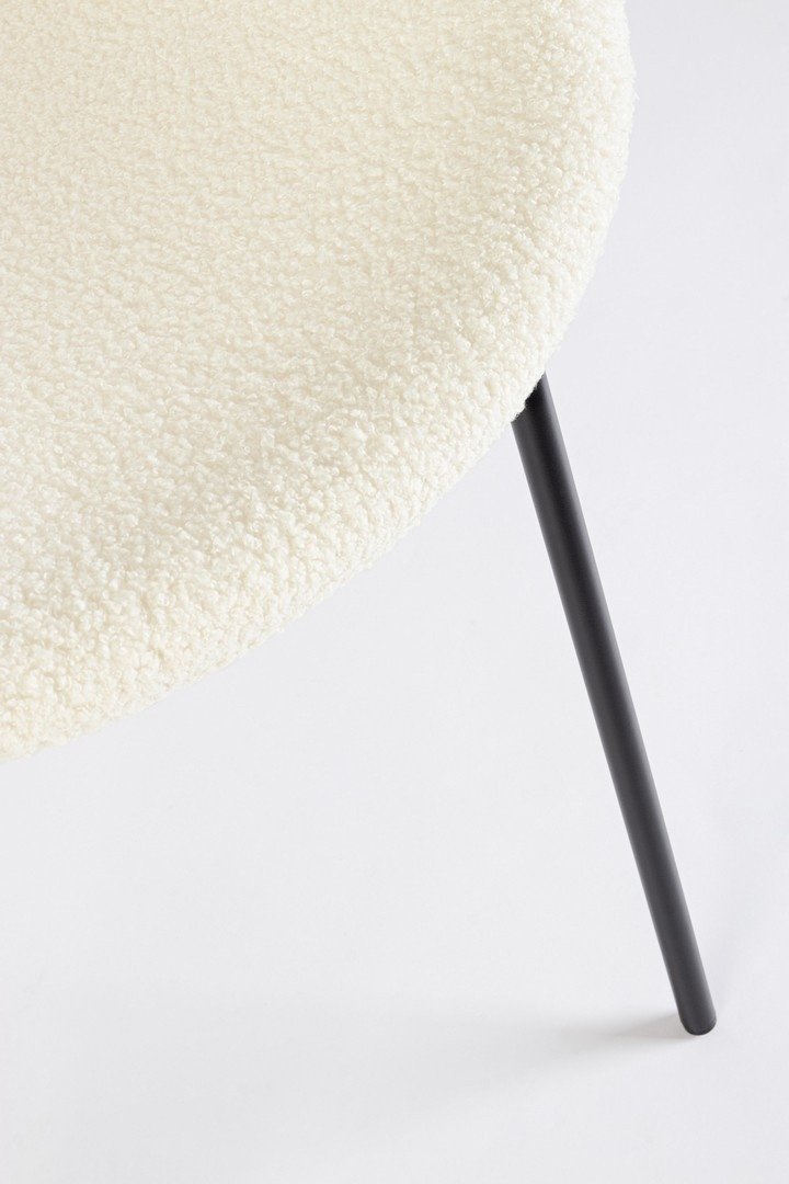 Siedzisko i oparcie wykończone miękką tkaniną poliestrową o unikalnej strukturze bouclé, która nadaje ciepły charakter oraz wyjątkową teksturę.