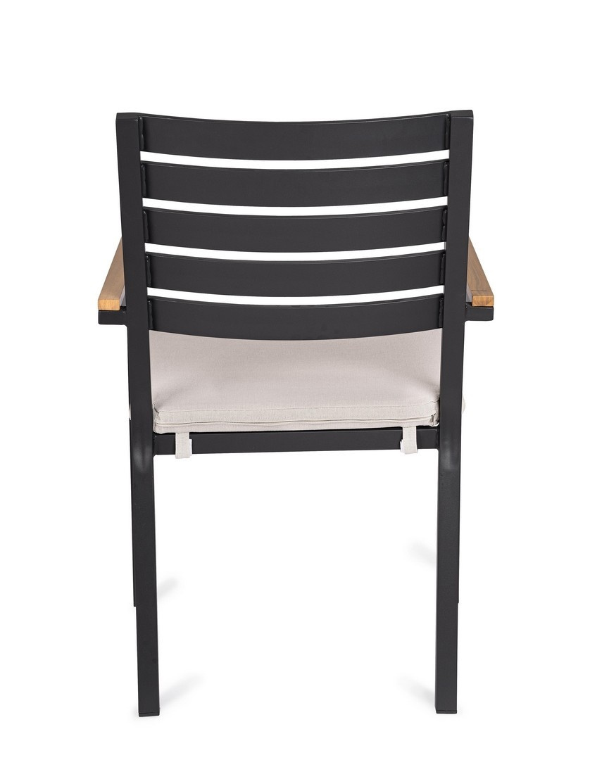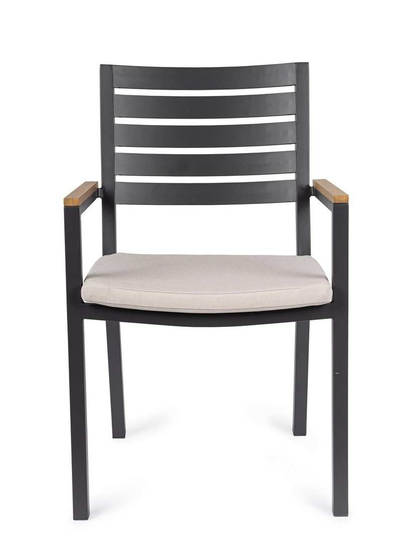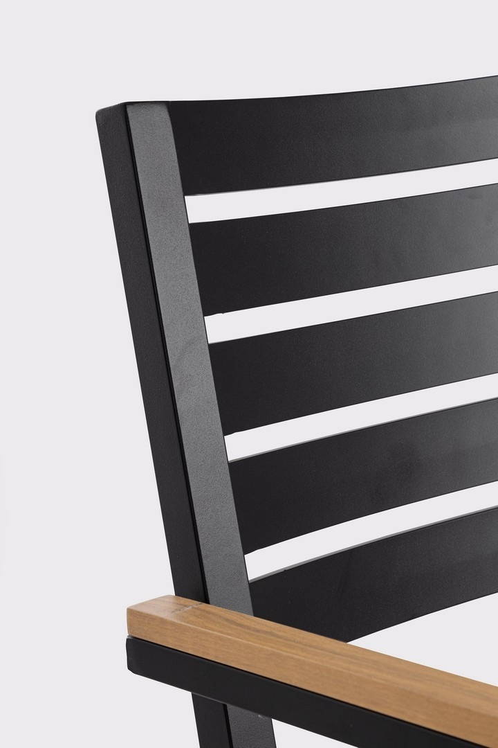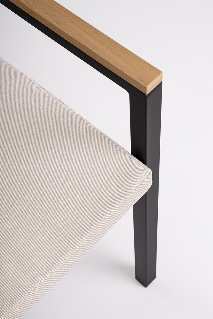 Podłokietniki z aluminiowymi wstawkami w wykończeniu imitującym drewno łączą nowoczesną trwałość z estetyką naturalnego materiału, dodając meblowi przytulnego wyglądu. Antracytowy kolor jest bardzo elegancki i uniwersalny, pasuje do nowoczesnych, minimalistycznych i industrialnych wnętrz.