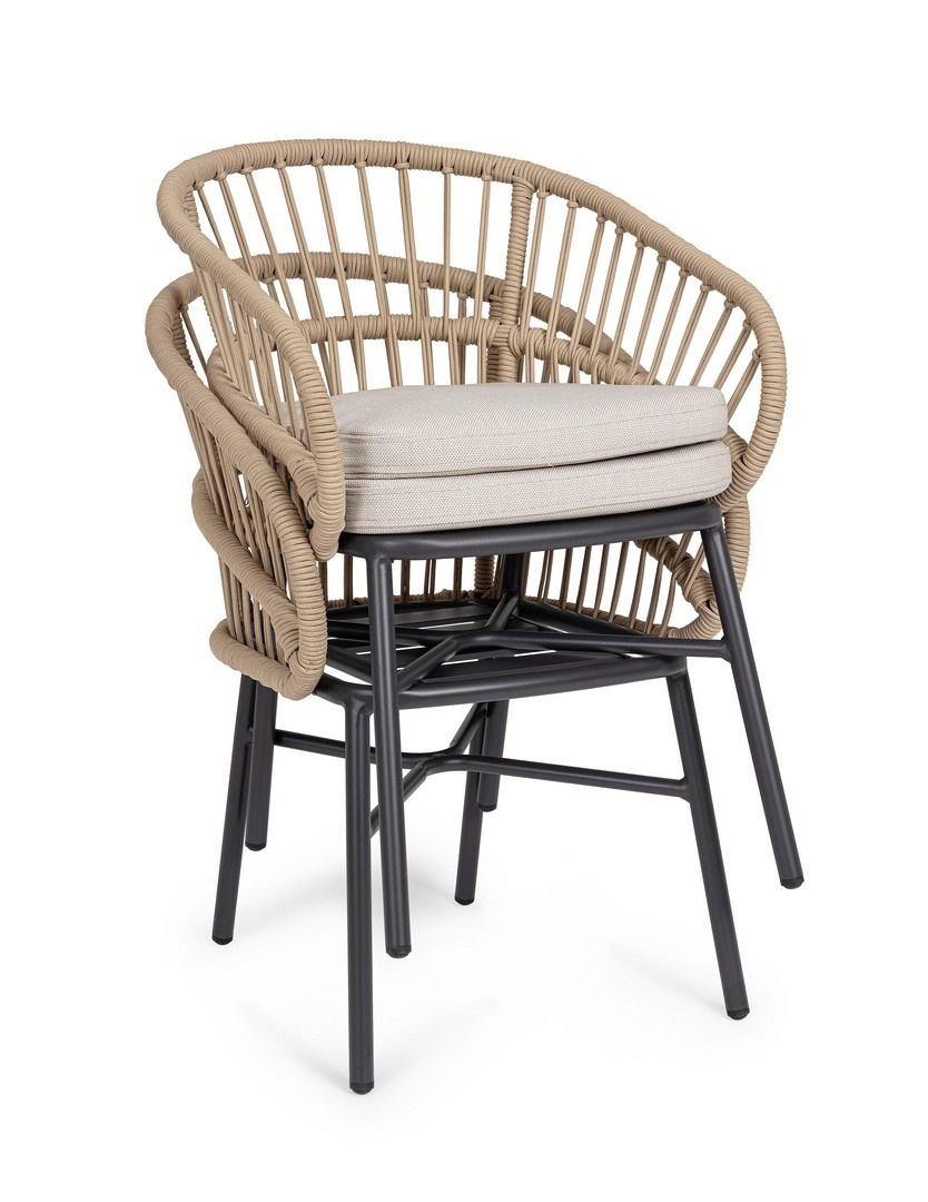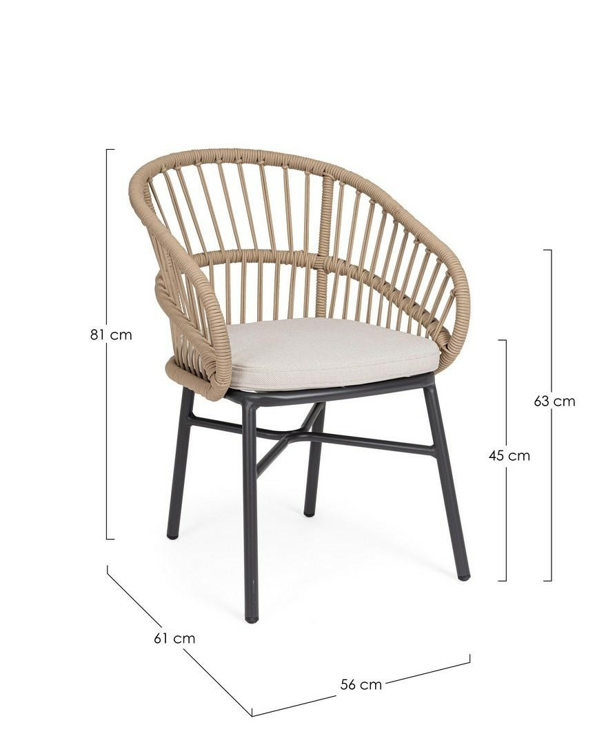 BIZZOTTO krzesło ogrodowe ODIVELAS beżowe. Stylowa i nowoczesna opcja do aranżacji przestrzeni zewnętrznych, która łączy elegancję z funkcjonalnością. Konstrukcja wykonana z malowanego proszkowo aluminium zapewnia trwałość i odporność na warunki atmosferyczne. Oparcie krzesła tkane z wysokiej jakości tkaniny łączy elegancję z funkcjonalnością, zapewniając wygodę i trwałość, a jego precyzyjnie zaprojektowana struktura nie tylko podkreśla nowoczesny design, ale również gwarantuje komfort użytkowania przez długi czas. Poduszka siedziska z pokrowcem z wodoodpornej tkaniny olefinowej zapewnia wygodę i łatwość w utrzymaniu czystości, dzięki swojej odporności na wilgoć. Dodatkowym atutem jest funkcja sztaplowania krzeseł, która ułatwia ich przechowywanie i pozwala zaoszczędzić cenną przestrzeń. Odivelas to kolekcja, która wprowadzi nową jakość do Twojego ogrodu. Wymiary: wys. 81 cm / szer. 56 cm / gł. 61 cm Waga brutto: 4,8 kg.
