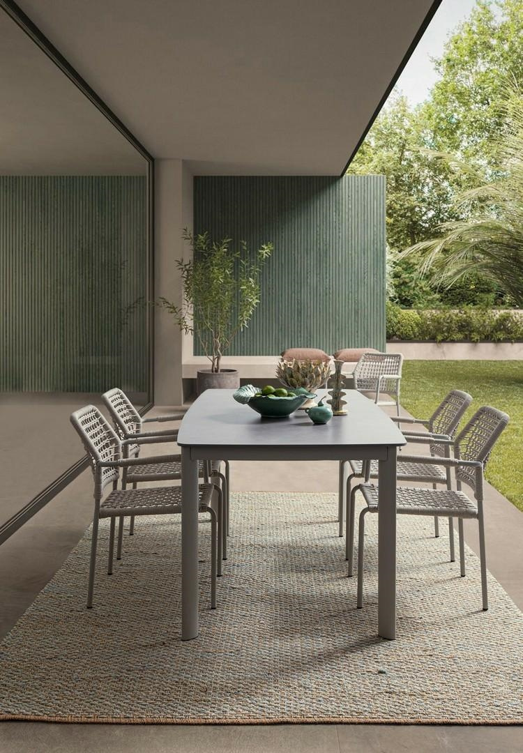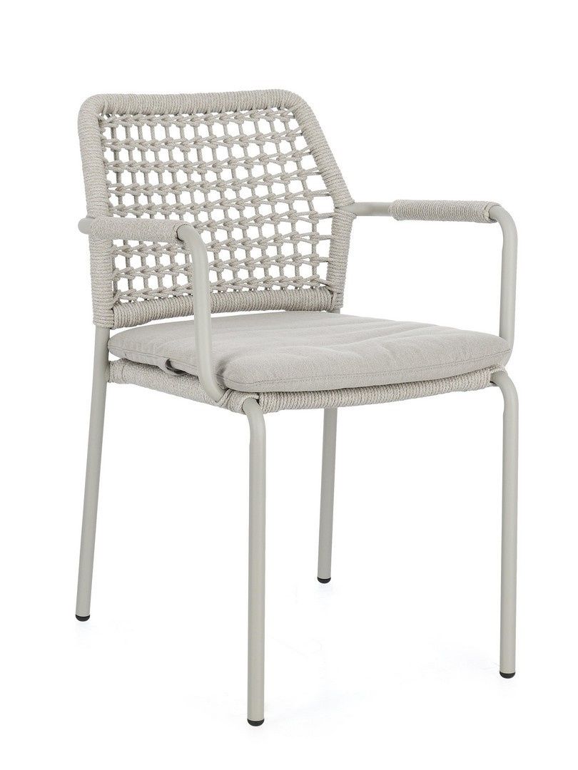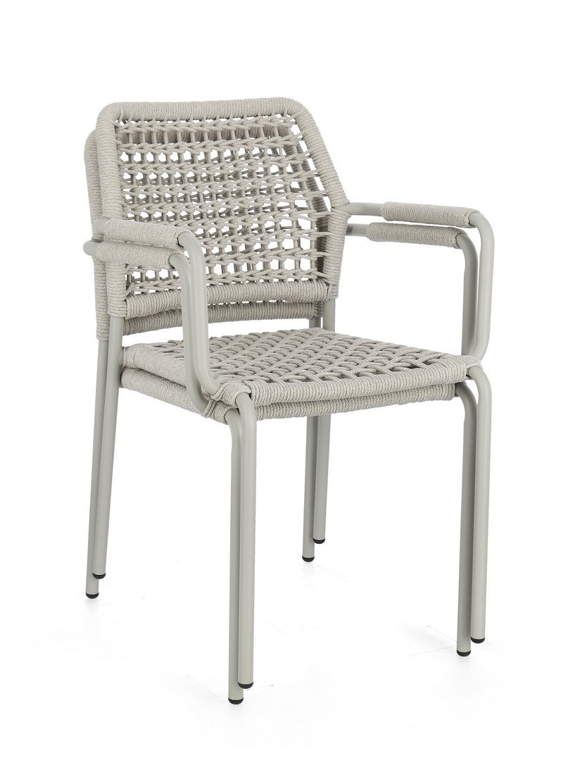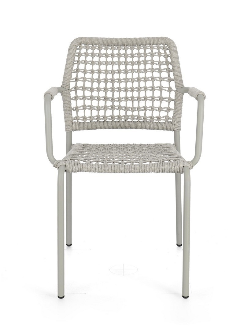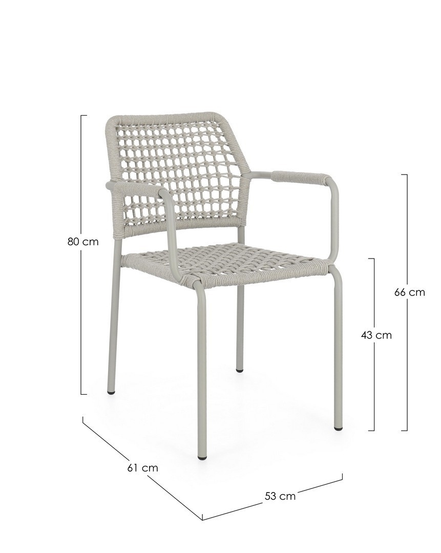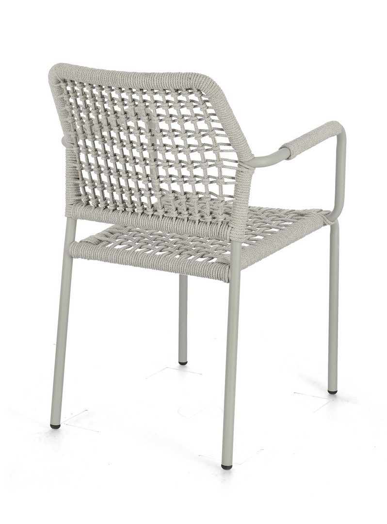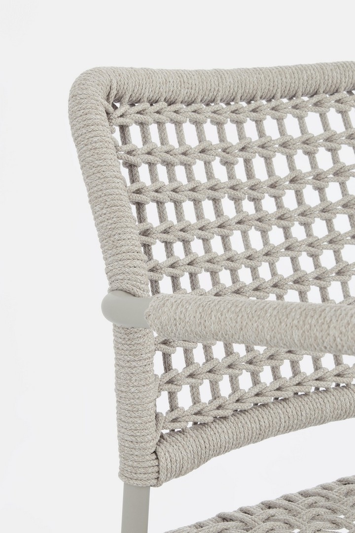 Siedzisko i oparcie wykonano z wytrzymałej plecionki poliestrowej, przystosowanej do użytku zewnętrznego, szara plecionka harmonijnie komponuje się z jasnoszarą ramą, tworząc nowoczesne i spójne zestawienie kolorystyczne.