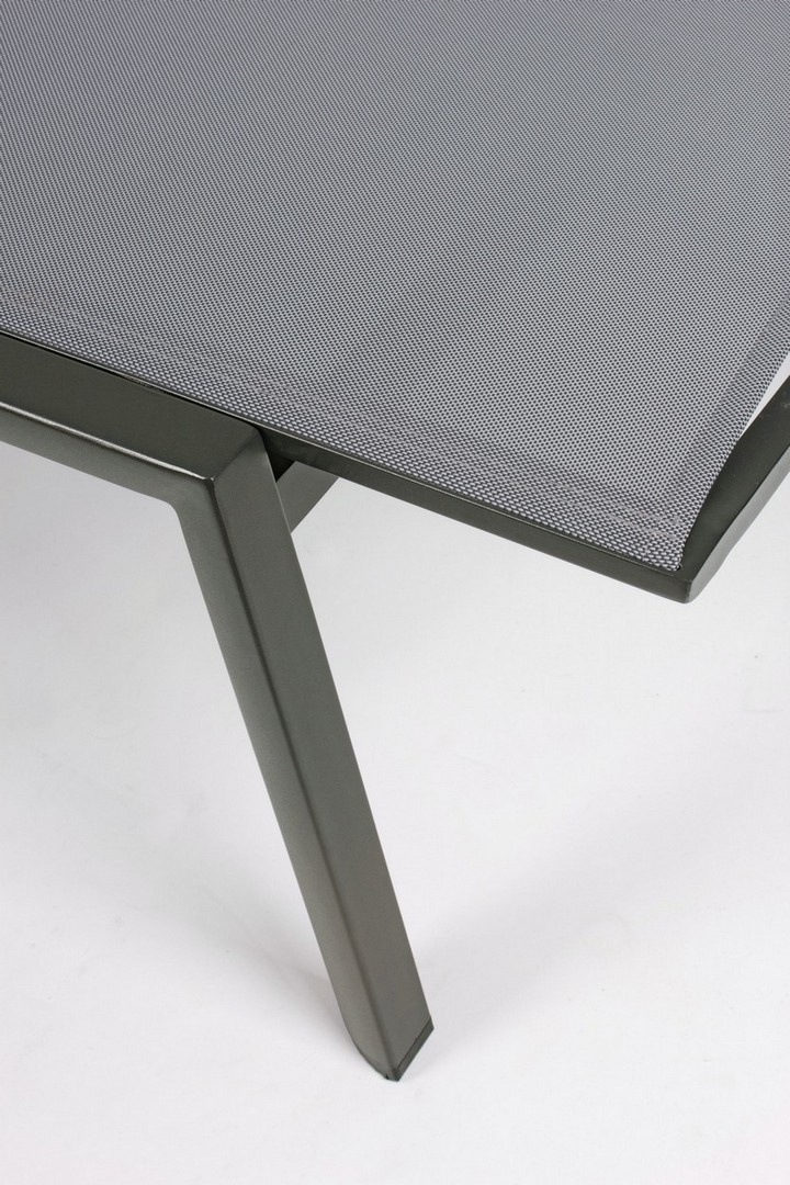 Siedzisko i oparcie z tkaniny textilene, odpornej na działanie słońca i deszczu, gwarantują wygodę i trwałość, idealną do użytku na zewnątrz.