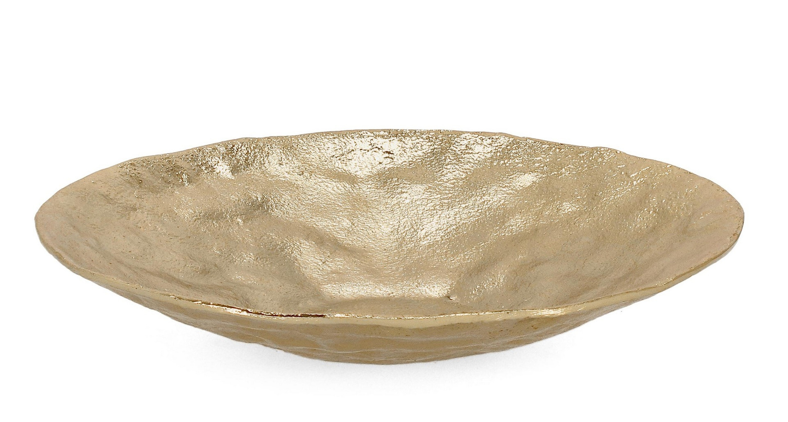BIZZOTTO misa dekoracyjna INDHUR 31 złota. Zachwycający i funkcjonalny dodatek, który przyciąga wzrok. Ręcznie wykonana misa z aluminium zachwyca oryginalną formą i delikatnym połyskiem. Złoto doskonale współgra ze stylem glamour, klasycznym i nowoczesnym, wnosząc do wnętrz elegancję i szykowny połysk. Doskonale nadaje się do ekspozycji ozdób, przechowywania drobiazgów lub tworzenia efektownych aranżacji na stole, komodzie czy konsoli. Łączy praktyczne zastosowanie z dekoracyjnym charakterem, nadając przestrzeni unikalny wyraz. Wymiary: wys. 6 cm / szer. 31 cm / gł. 31 cm Waga brutto: 0,82 kg.