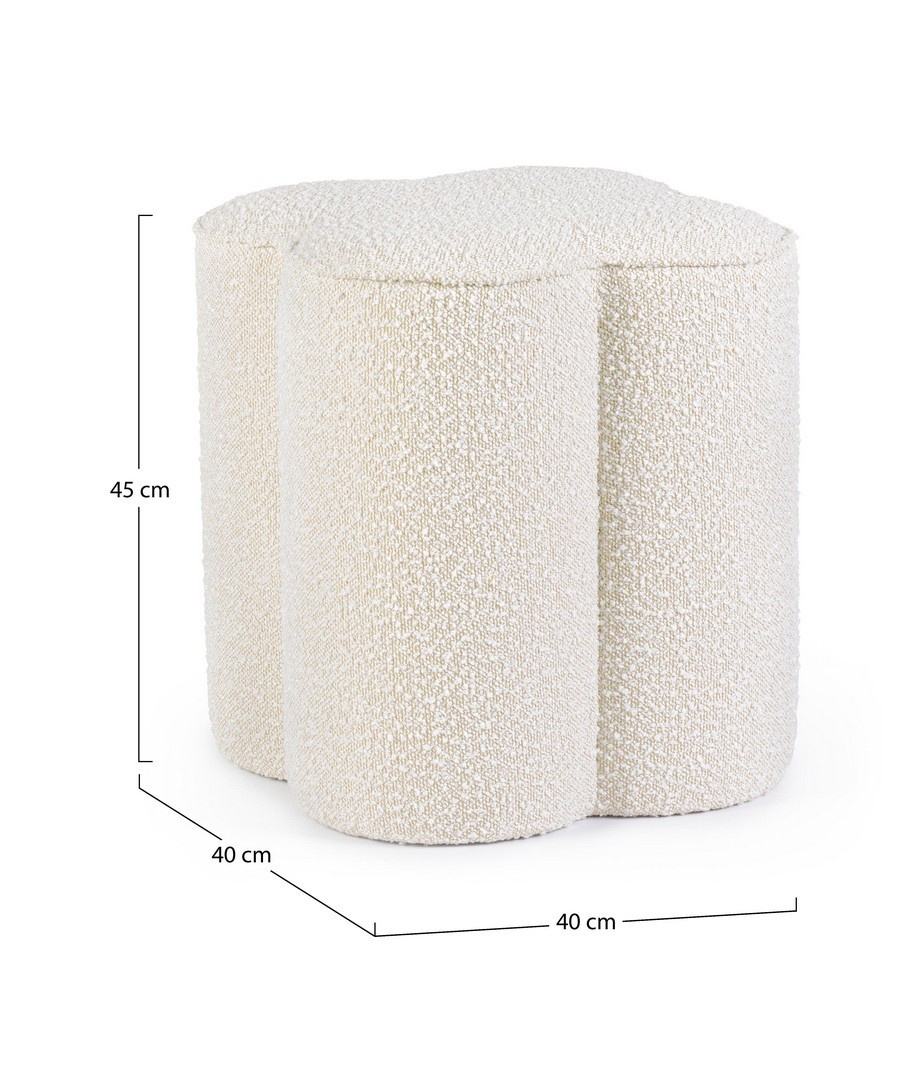 BIZZOTTO pufa COINTA beżowa. Kompaktowa i przytulna pufa, która łączy elegancki kształt z perfekcyjnie dopracowanym wykończeniem. Stabilna konstrukcja oparta na ramie z drewna sosnowego i wytrzymałego materiału gwarantuje trwałość oraz komfort użytkowania. Tapicerowana tkaniną o charakterystycznej fakturze boucle, zachwyca miękkością i wyjątkowym wyglądem. Beżowy kolor dodaje wnętrzu przytulności, naturalnej elegancji i ponadczasowego stylu. Dostępna także w wariancie szarym. Wymiary: wys. 45 cm / szer. 40 cm / gł. 40 cm Waga brutto: 5,4 kg.