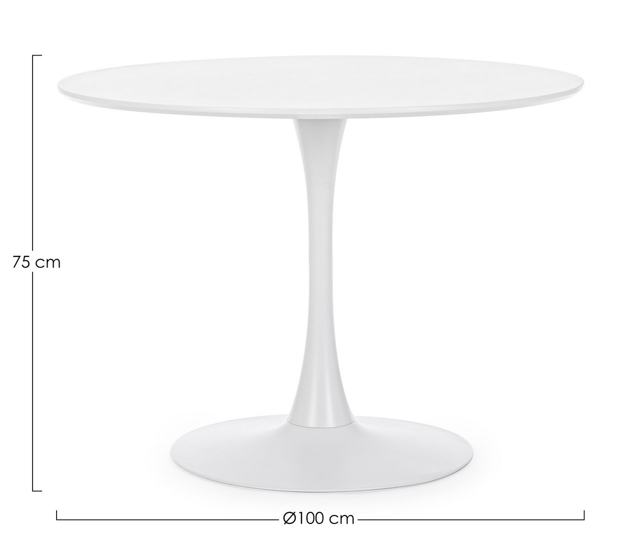 - BIZZOTTO stół jadalniany BLOOM 100 biały. Prosta, współczesna forma w połączeniu z eleganckim, minimalistycznym stylem. Okrągły blat został wykonany z płyty MDF i pokryty warstwą poliuretanu, co zapewnia mu gładką i trwałą powierzchnię. Podstawa zbudowana