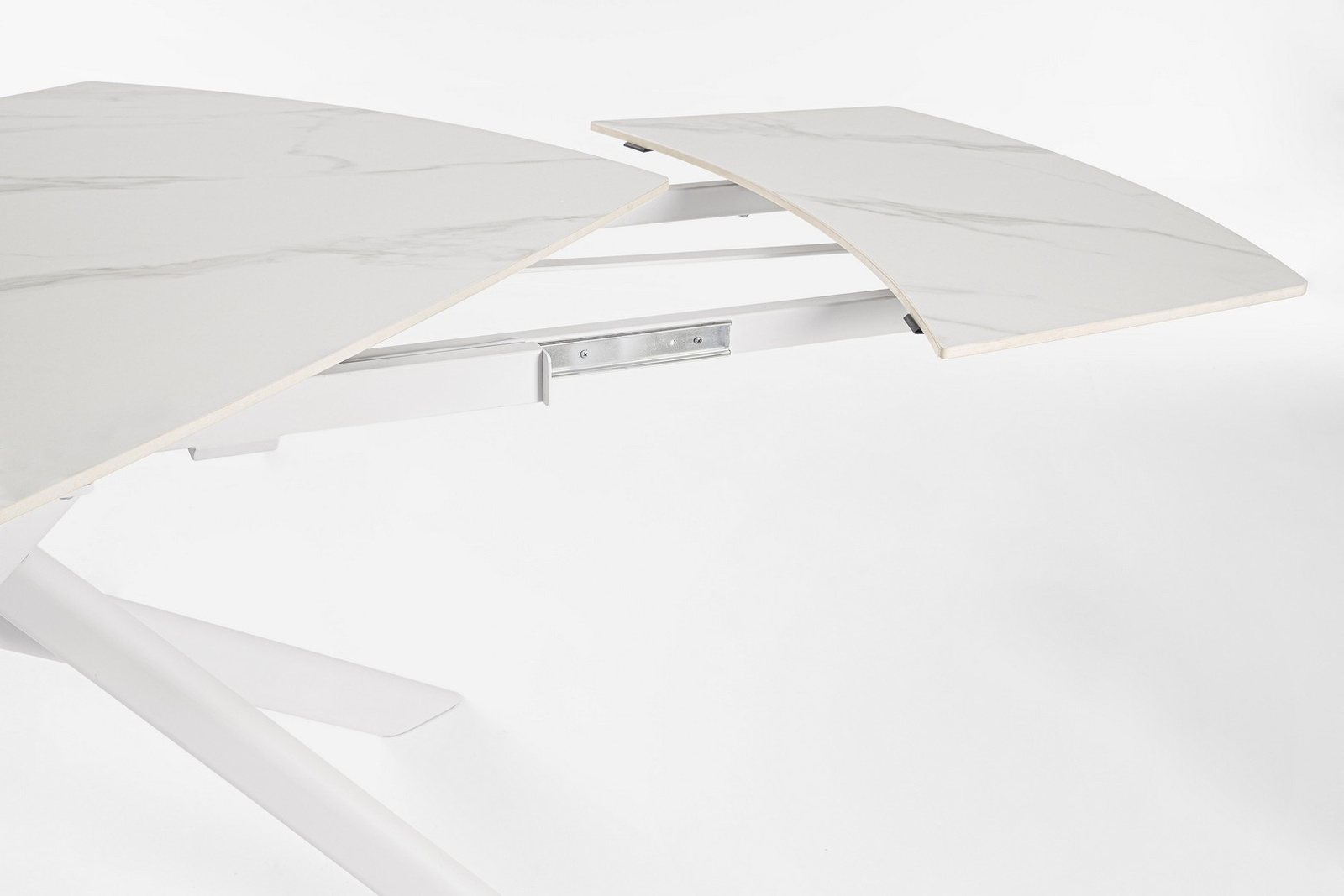 Stół JOAKIM posiada praktyczny mechanizm rozkładania, w którym blat rozsuwany na boki odsłania ukrytą wkładkę, umożliwiając szybkie i wygodne powiększenie powierzchni.