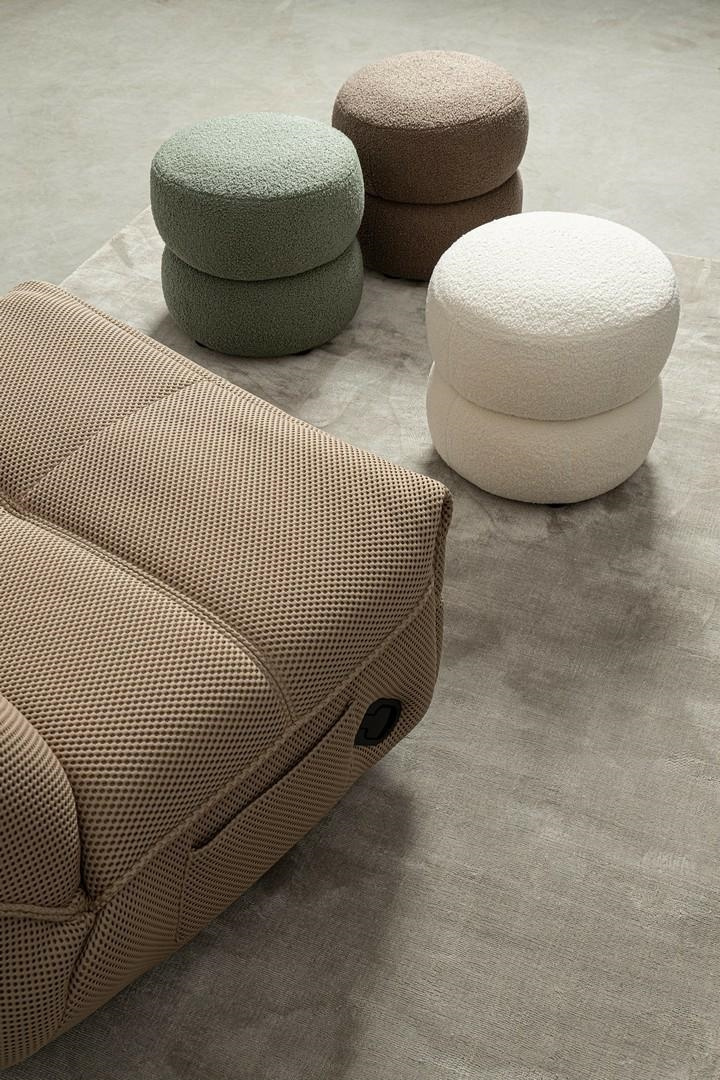 Siedzisko, pokryte tkaniną z efektem bouclé, łączy estetykę z funkcjonalnością, oferując unikalną teksturę, która jest miękka i przyjemna w dotyku.