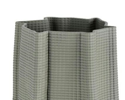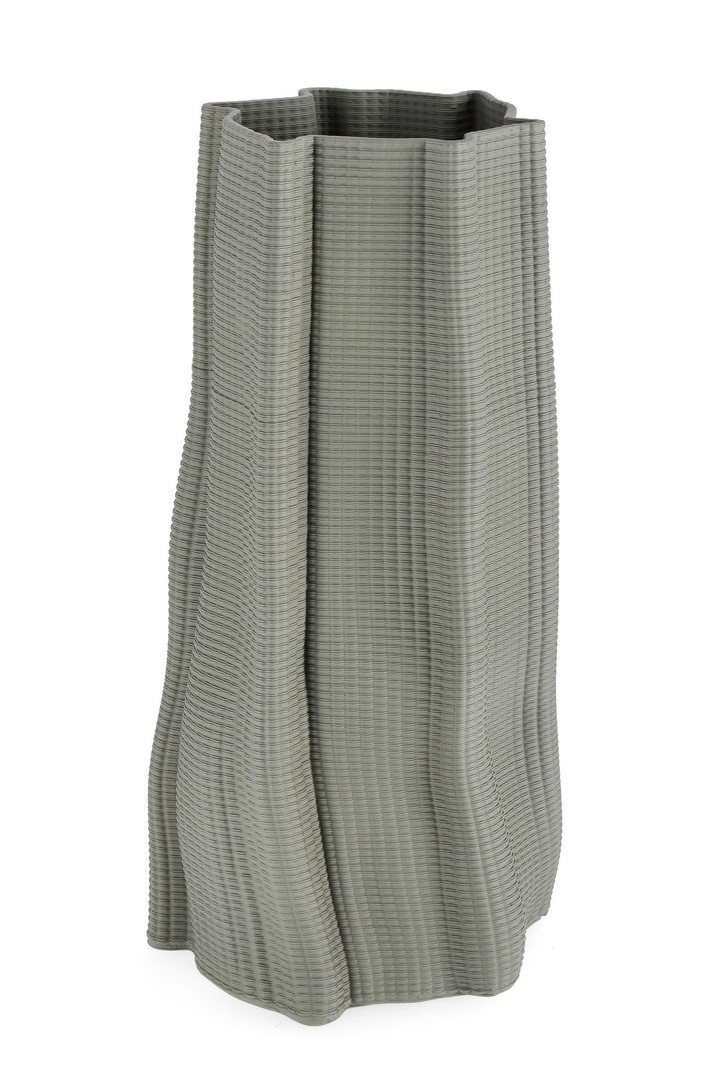 BIZZOTTO wazon REIKO 44 zielony. Elegancki wazon o oryginalnej formie, doskonale komponujący się z nowoczesnym wystrojem wnętrz. Cylindryczny kształt z pofalowanymi ściankami i falistą górną krawędzią wyróżnia go i nadaje mu organiczny, rzeźbiarski charakter. Stworzony z ceramiki w technologii druku 3D, zachwyca dokładnym wykończeniem i delikatną, warstwową fakturą. Stonowany odcień zieleni nadaje całości naturalny charakter, dobrze komponując się z różnorodnymi stylami. Wodoodporne wnętrze pozwala na wykorzystanie wazonu zarówno do suchych, jak i świeżych bukietów. Każdy egzemplarz jest unikatowy, a delikatne różnice w strukturze podkreślają jego rękodzielniczy, artystyczny charakter. Wymiary: wys. 44 cm / szer. 21 cm / gł. 21 cm Waga brutto: 2,67 kg.