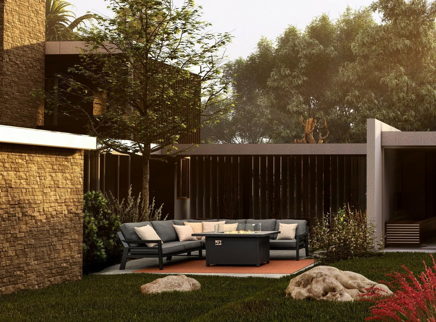 Najważniejszym elementem jest elegancki stół z kominkiem gazowym (osłonięty hartowanym szkłem), który dodaje nie tylko ciepła, ale i wyjątkowego klimatu.