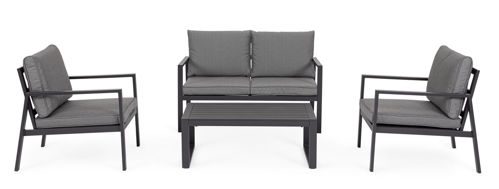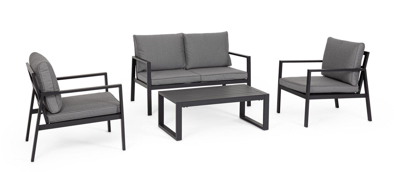 - BIZZOTTO zestaw ogrodowy HILDE szary. Świetny wybór dla osób ceniących zarówno estetykę, jak i praktyczne rozwiązania. Solidne aluminium, odporne na działanie czynników atmosferycznych, nadaje konstrukcji nowoczesny charakter i gwarantuje niezawodność w k