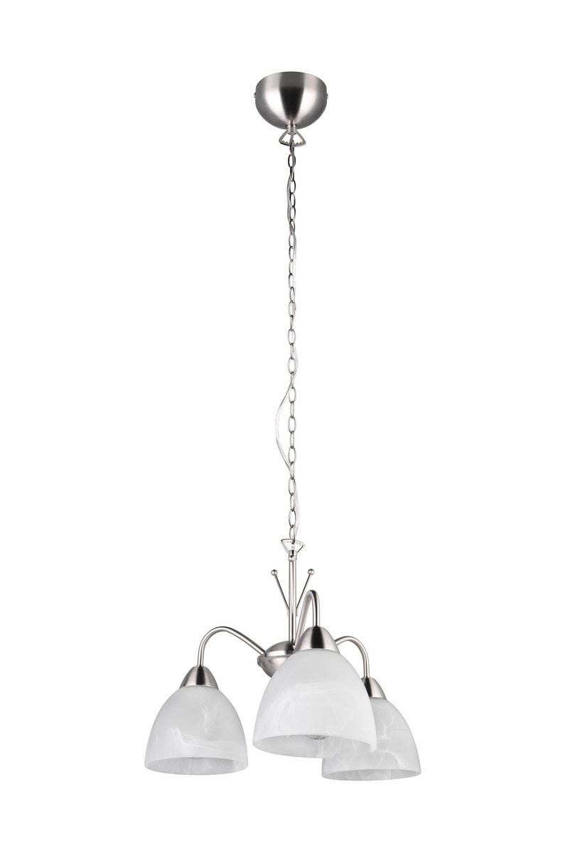 - Klasyczny żyrandol Dobby w kolorze nikiel mat z alabastrowymi kloszami idealnie wpasuję się niemal każde wnętrze.