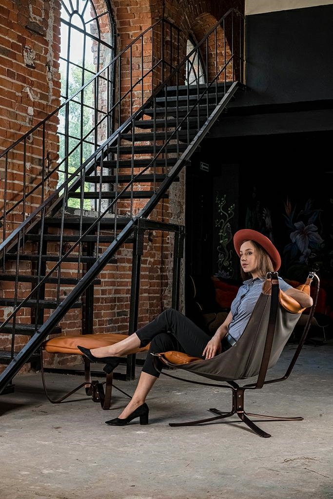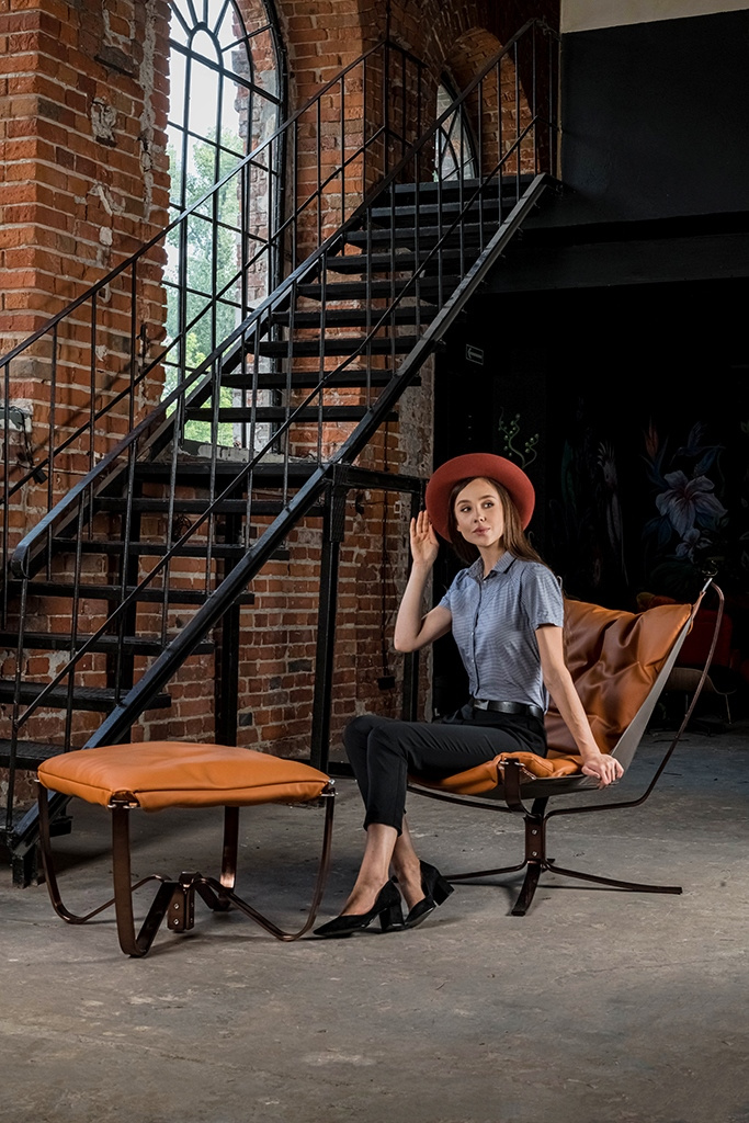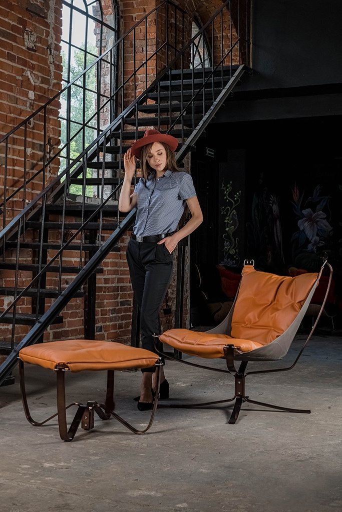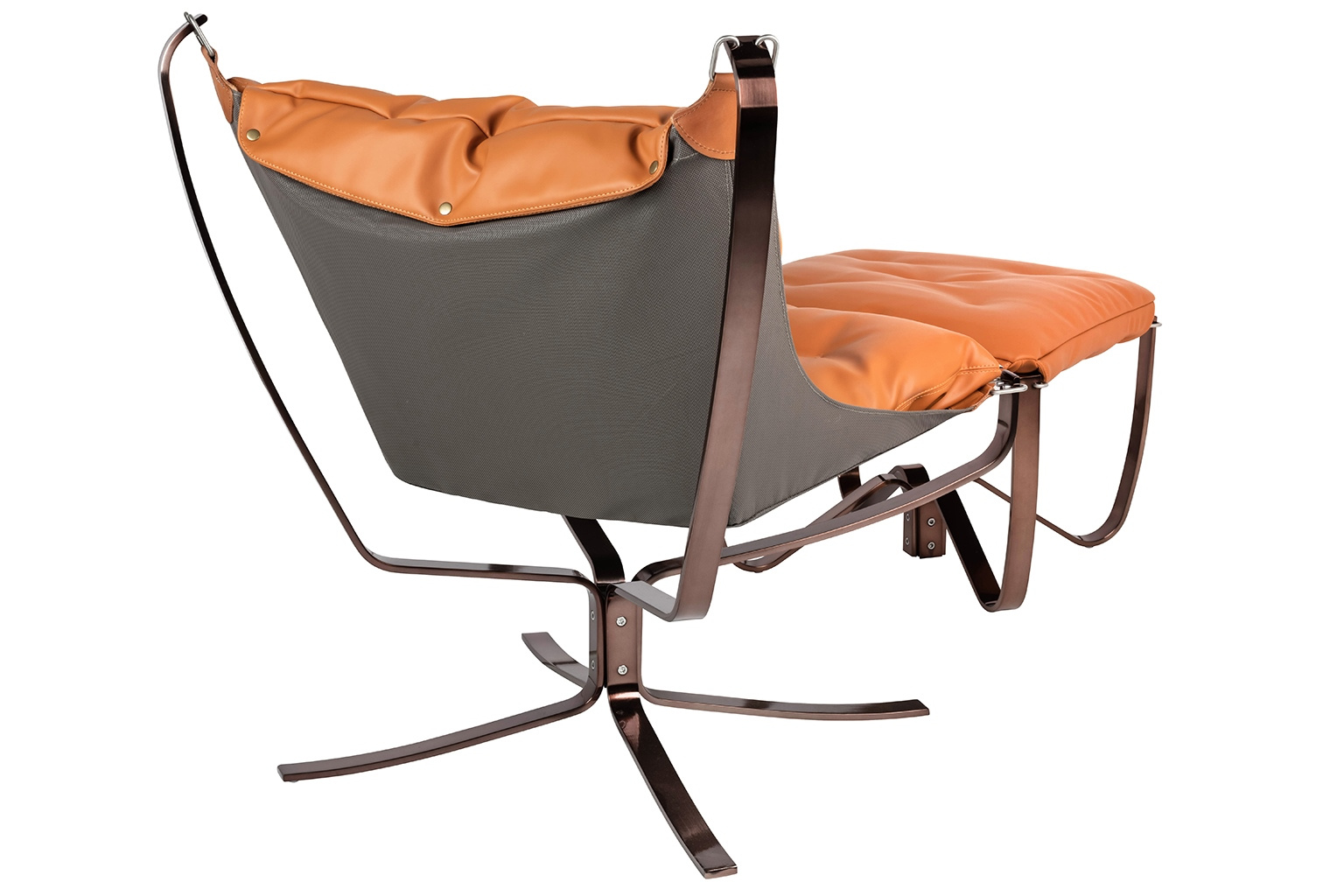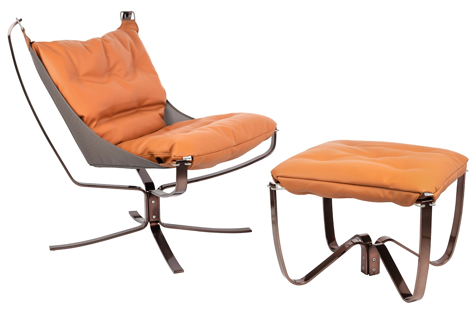 - Fotel ARNI LOW z podnóżkiem. Nowoczesna propozycja dla miłośników oryginalnych kształtów. Miękka poduszka wykonana z ekoskóry w kolorze pomarańczowym połączona z oparciem wykonanym z siatki zawieszona na metalowym stelażu przypomina designerski hamak. Kon