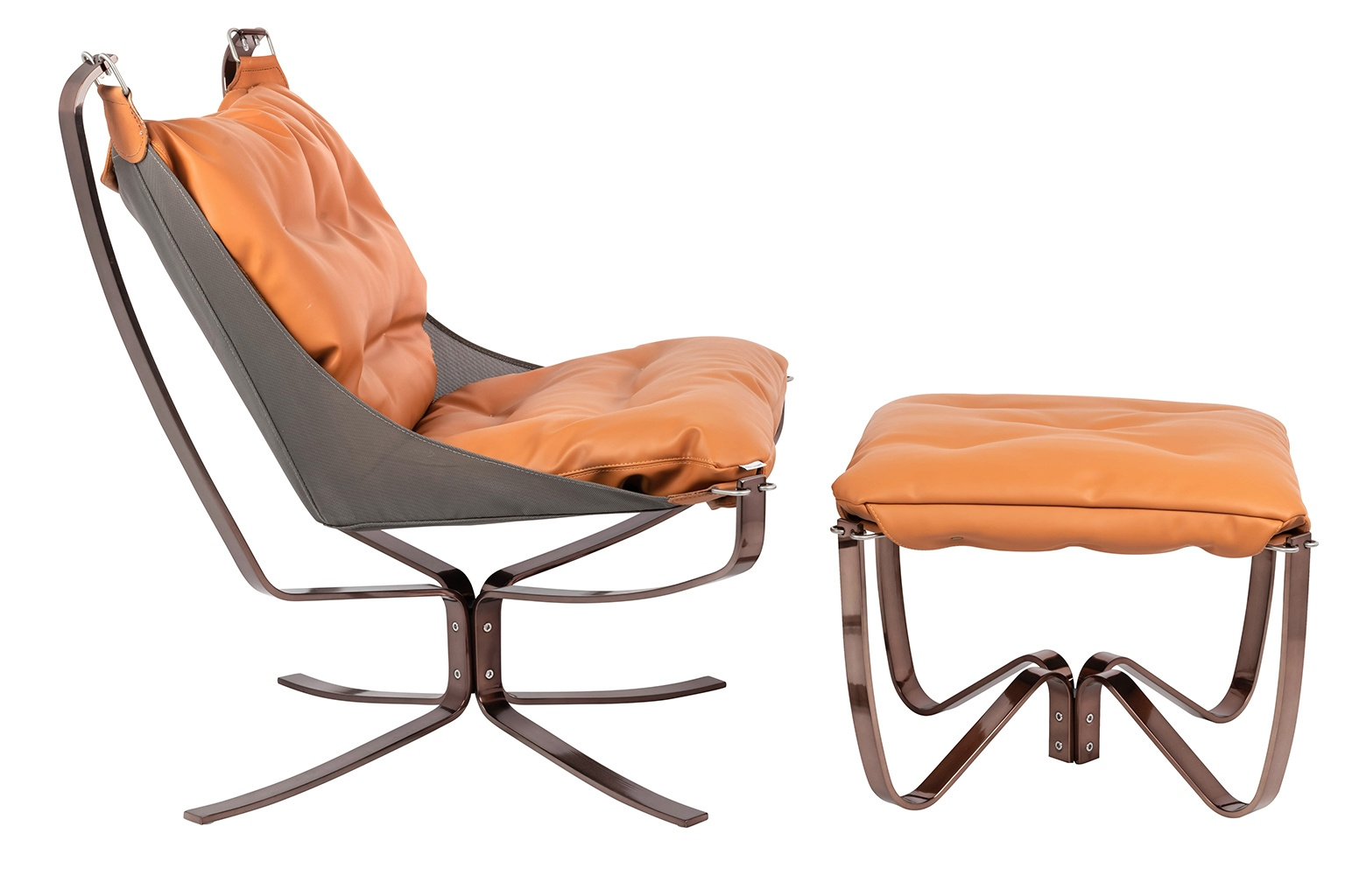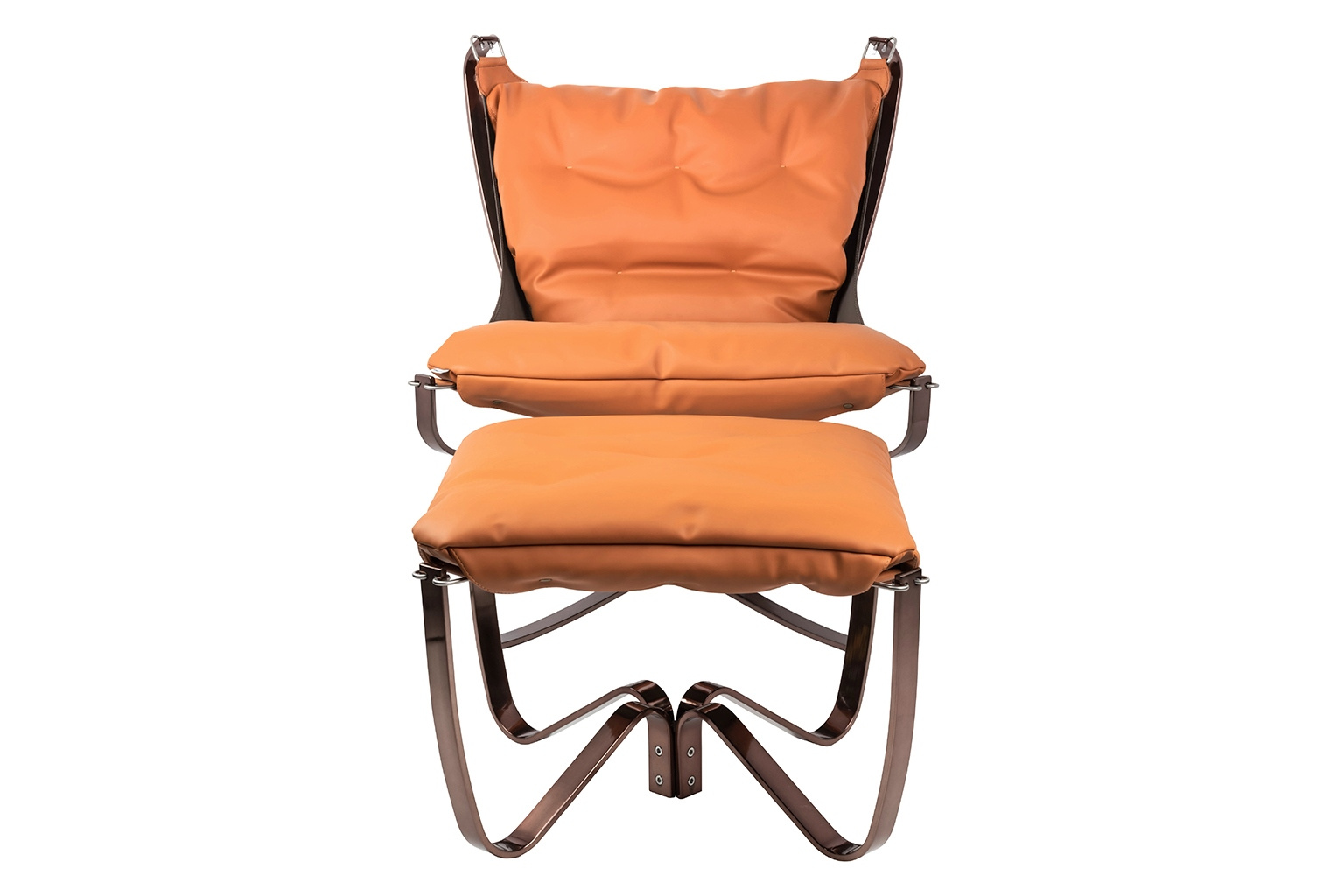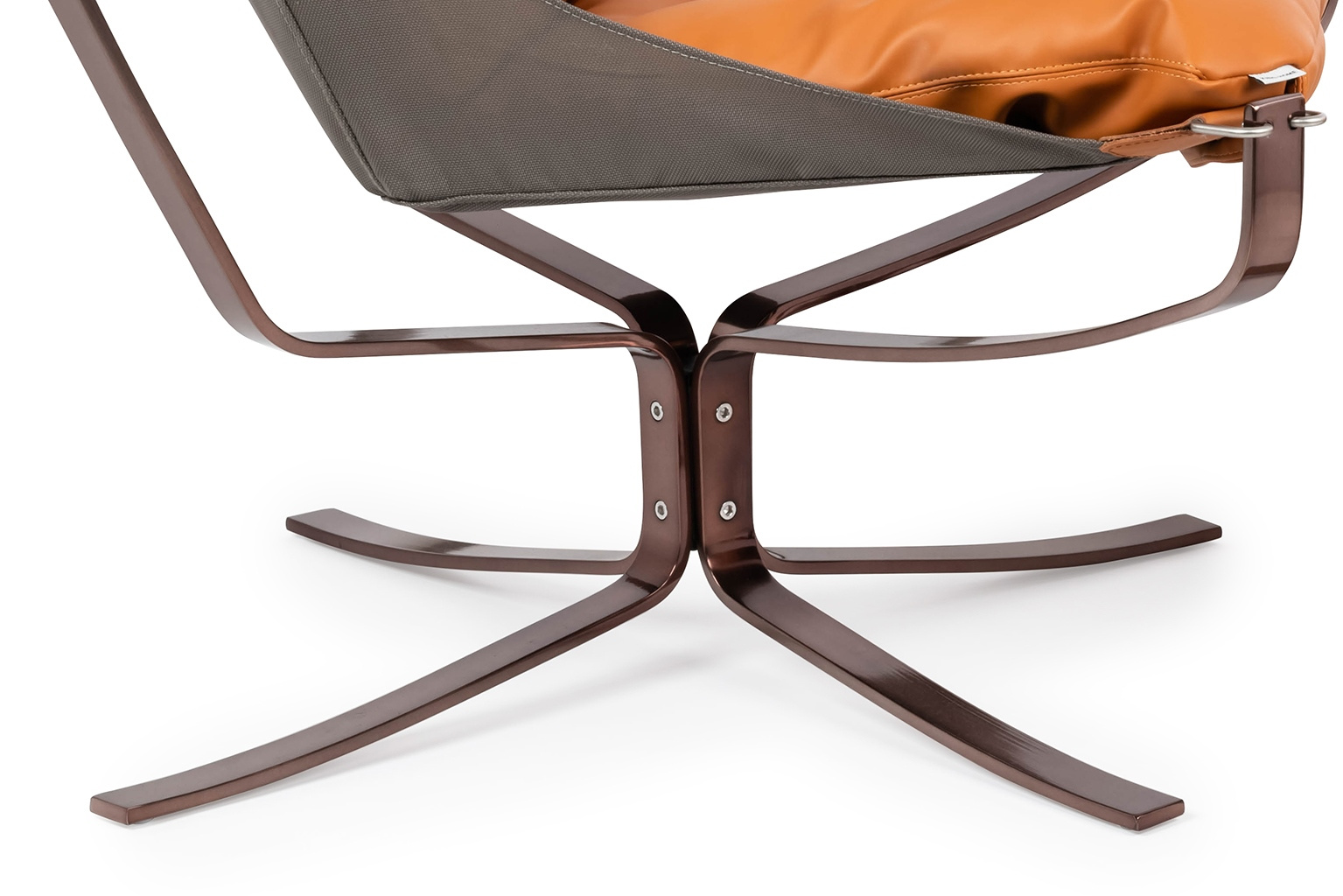 - Fotel ARNI LOW z podnóżkiem pomarańczowy - ekoskóra, miedz. Nowoczesna propozycja dla miłośników niebanalnych form i oryginalnych kształtów. Całość, osadzona na metalowym stelażu, przywodzi na myśl nowoczesny, designerski hamak, łącząc lekkość formy z wyj