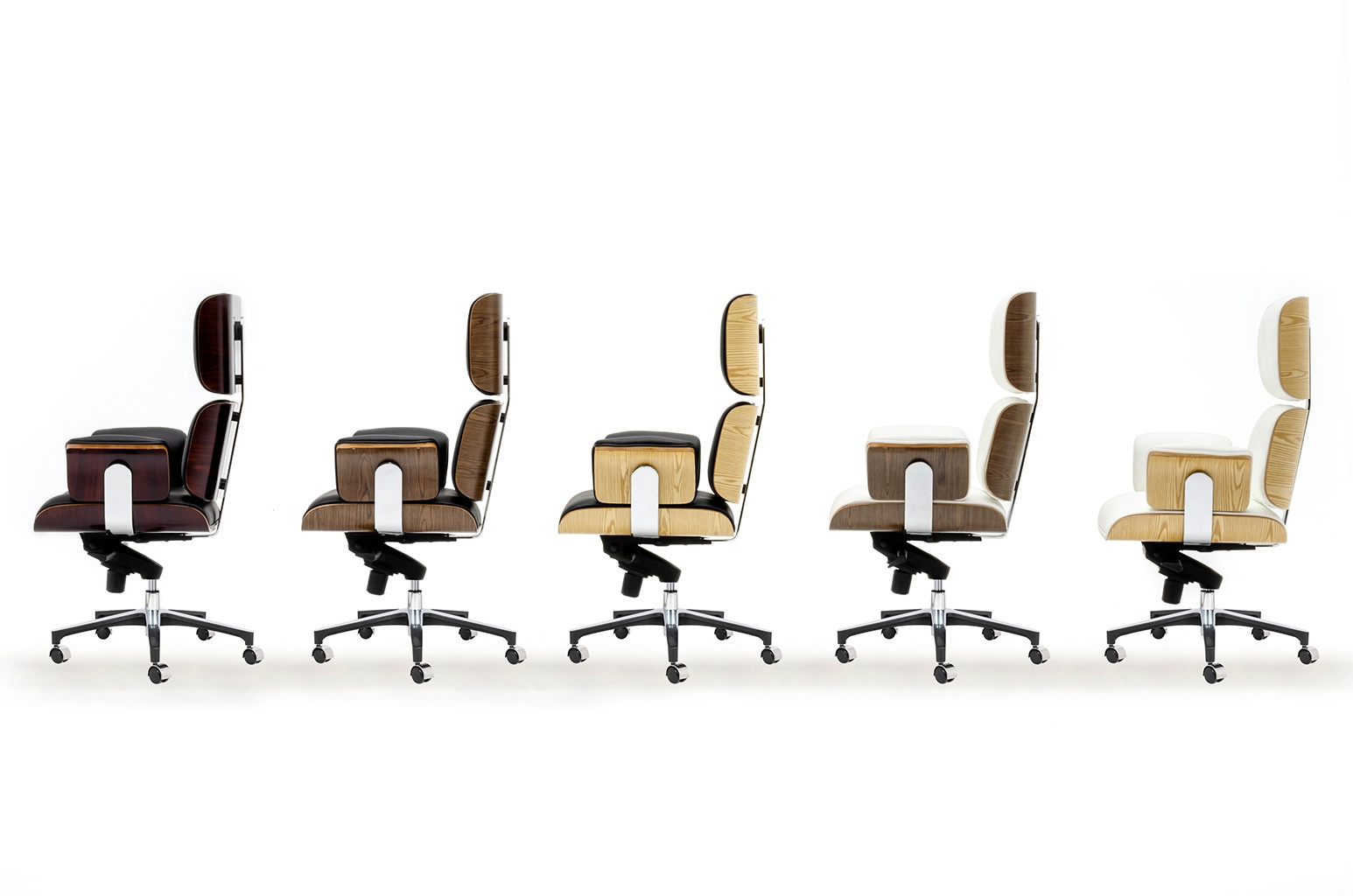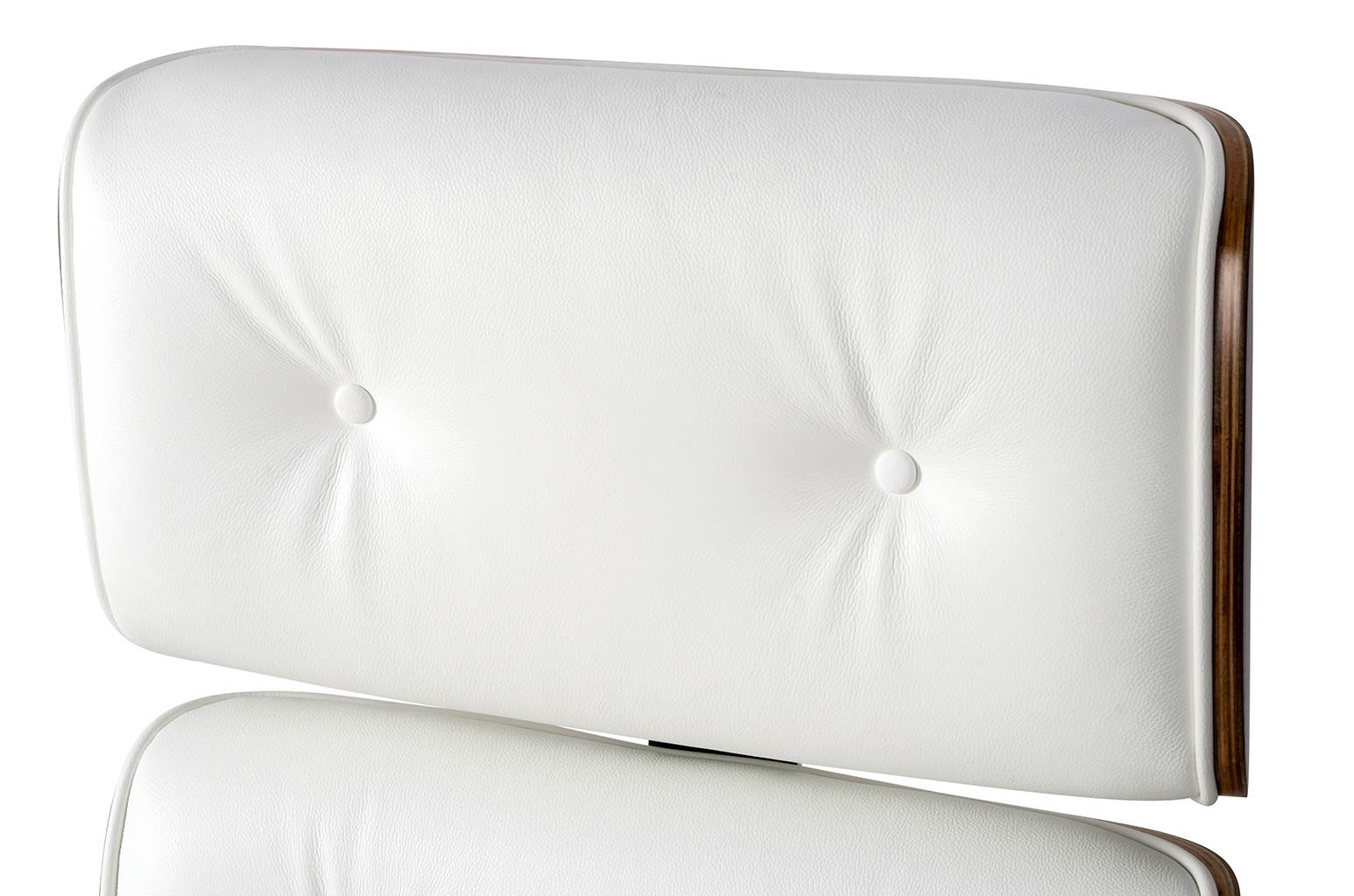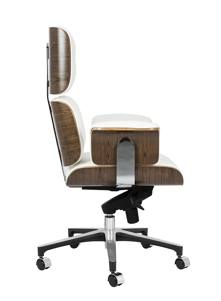 - Fotel biurowy LOUNGE BUSINESS biały z orzechowym drewnem. Siedzisko, oparcie oraz podłokietniki tapicerowane są włoską skórą naturalną w kolorze białym. Korpus fotela został wykonany z giętego na ciepło drewna w kolorze orzechowym o grubości 55 mm. Podsta