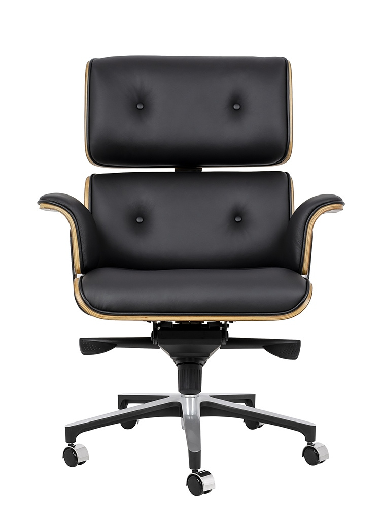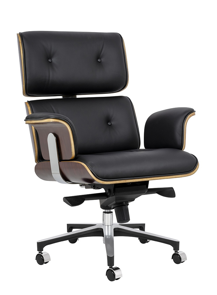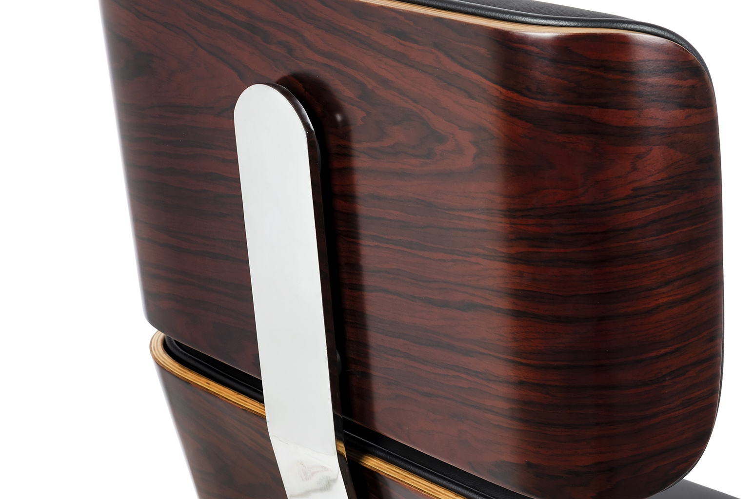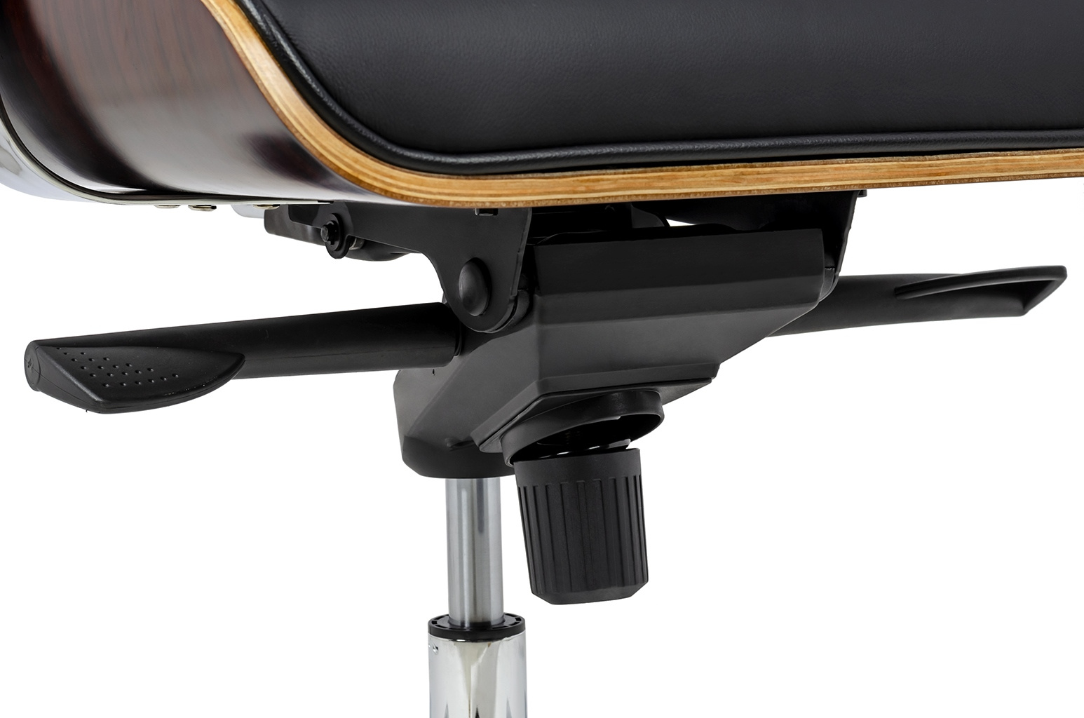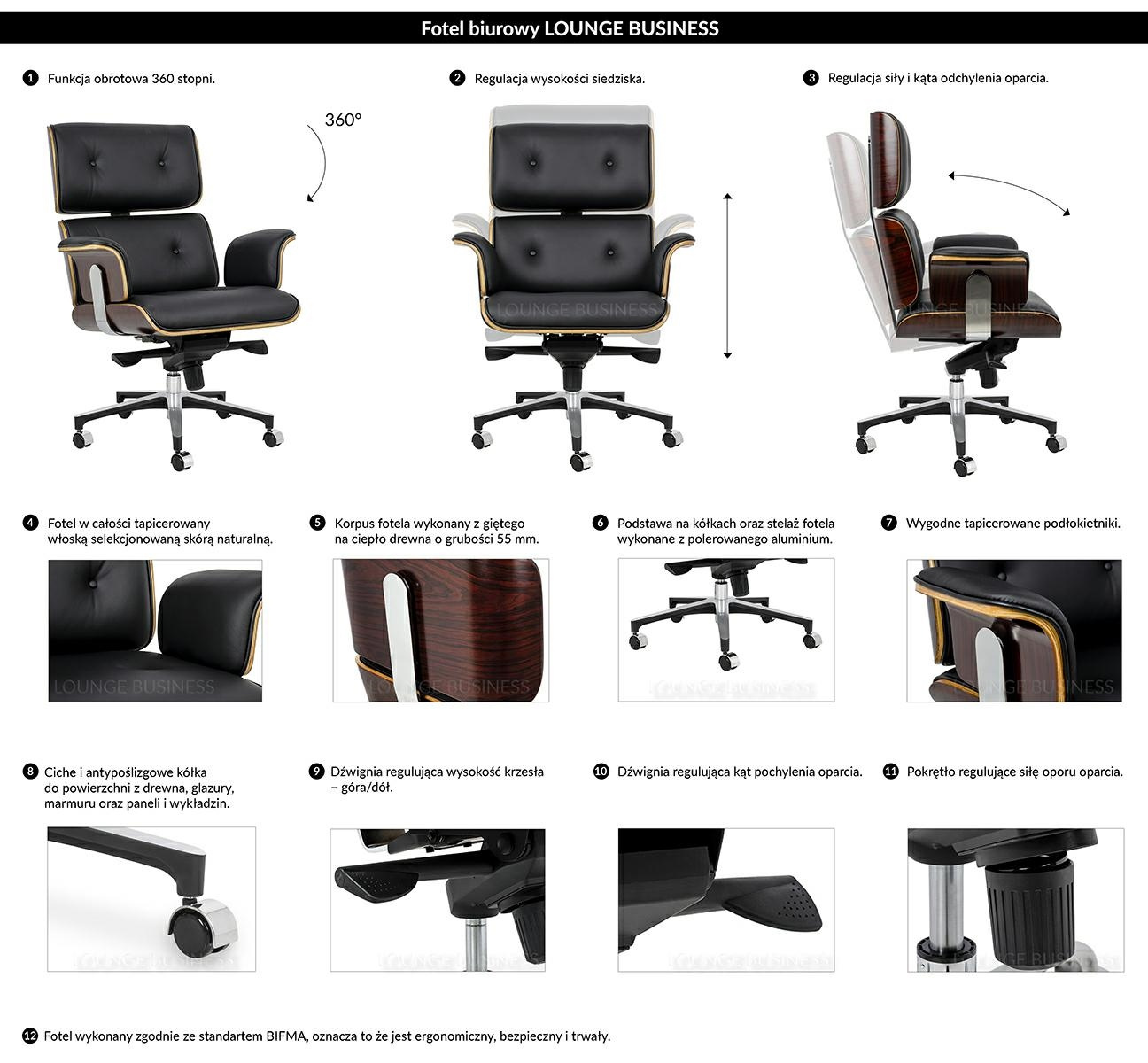 - Fotel biurowy LOUNGE BUSINESS czarny z różanym drewnem. Siedzisko, oparcie oraz podłokietniki tapicerowane są włoską skórą naturalną w kolorze czarnym. Korpus fotela został wykonany z giętego na ciepło drewna w kolorze różanym o grubości 55 mm. Podstawa o
