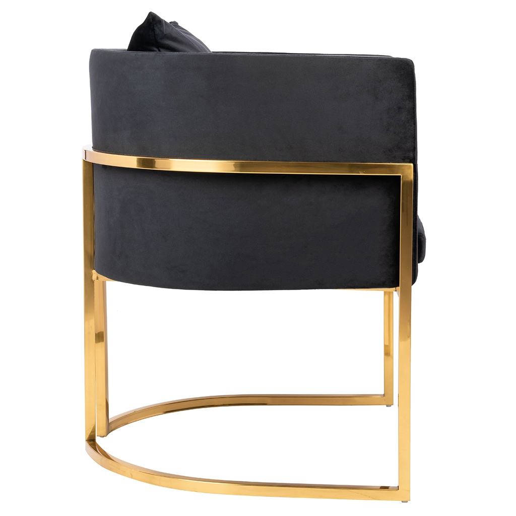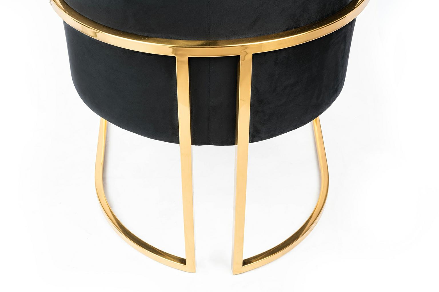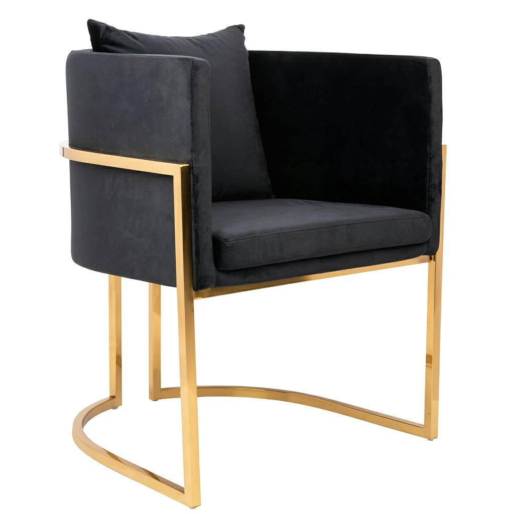 - Fotel CHLOE. Siedzisko oraz poduszka tapicerowane są aksamitnym welurem w kolorze czarnym. Metalowa podstawa w kolorze złotym podkreśla nowoczesny styl fotela. Możliwość personalizacji obicia oraz wyjątkowy design sprawia, że Chloe doskonale odnajdzie się