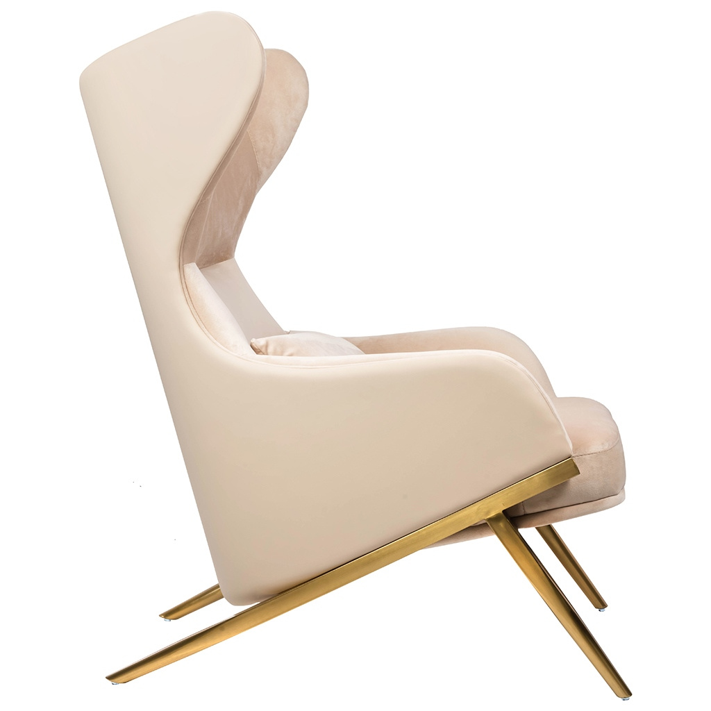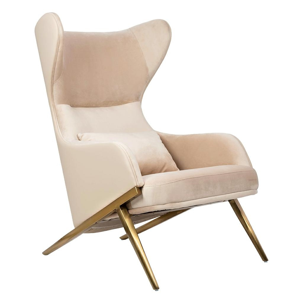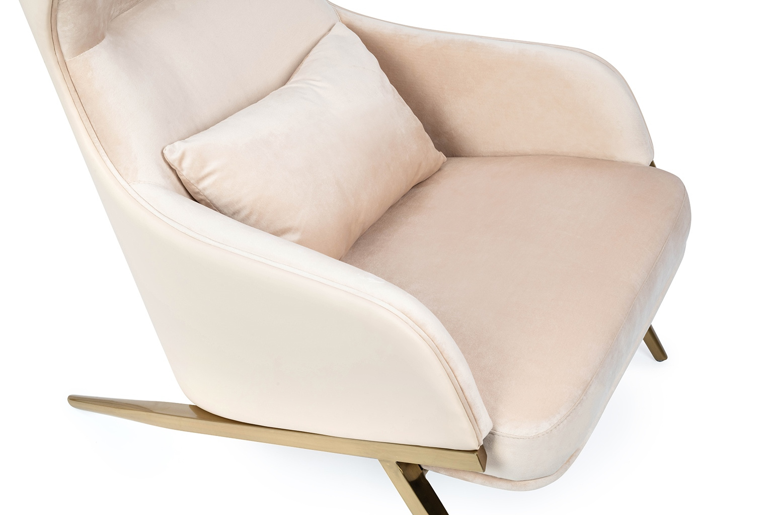 - Fotel HAMPTON. Siedzisko oraz poduszka tapicerowane są aksamitnym welurem w kolorze beżowym. Tył fotela został obszyty beżową ekoskórą. Metalowa podstawa o ciekawym kształcie w kolorze złotym podkreśla nowoczesny charakter fotela. Możliwość personalizacji