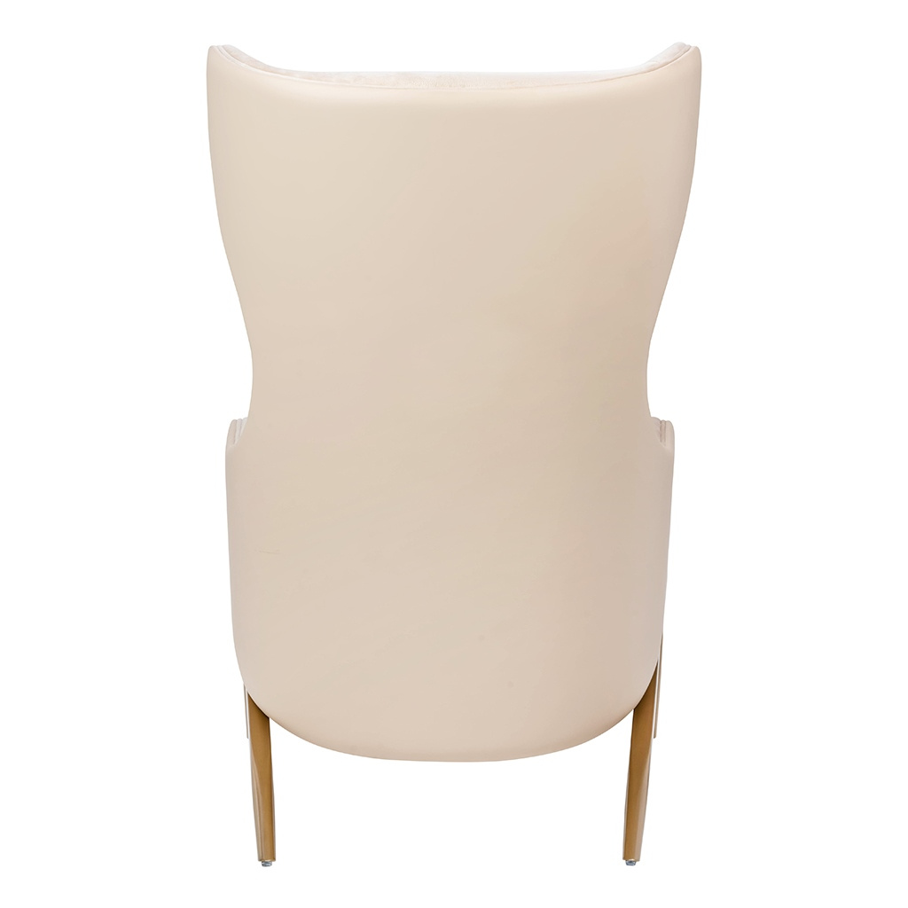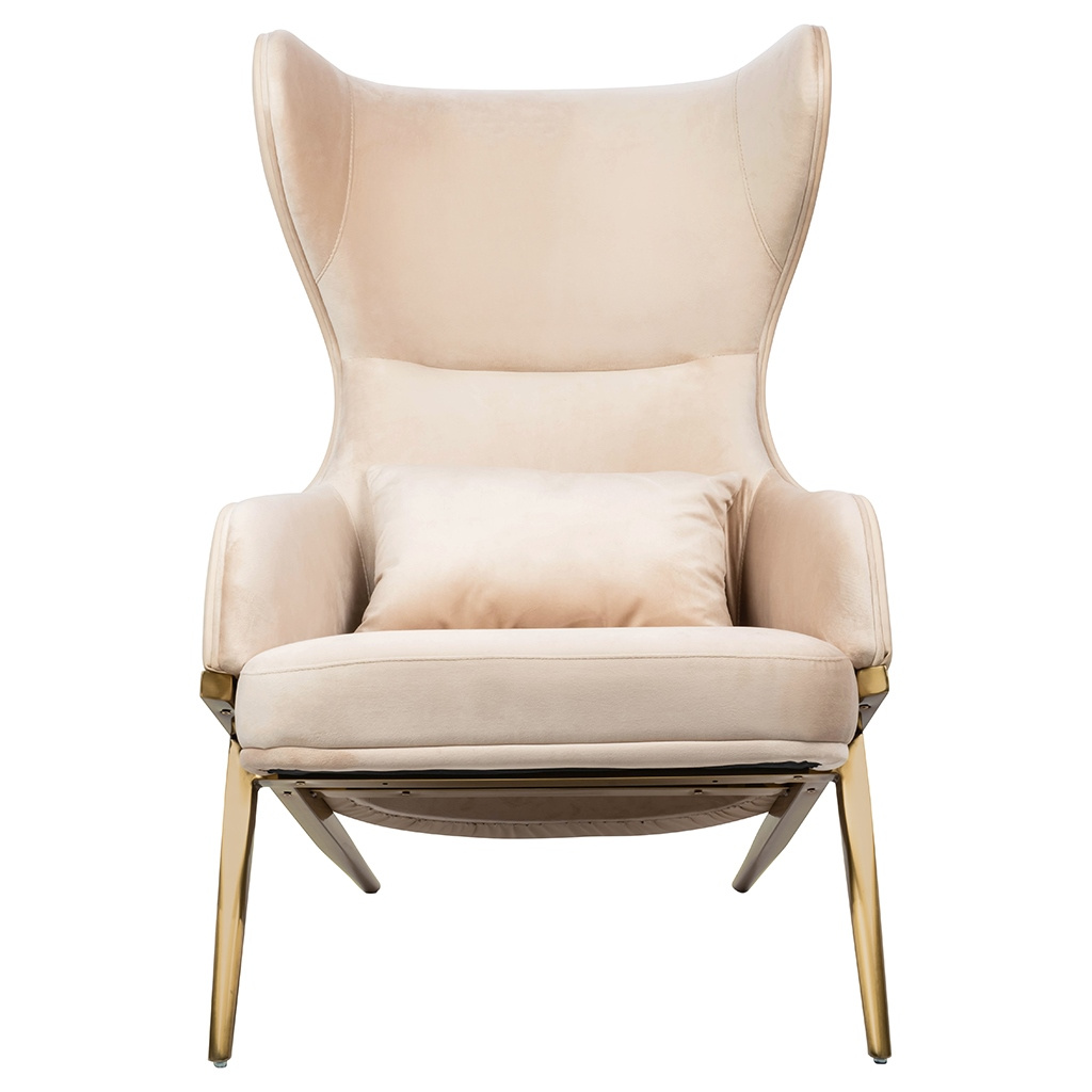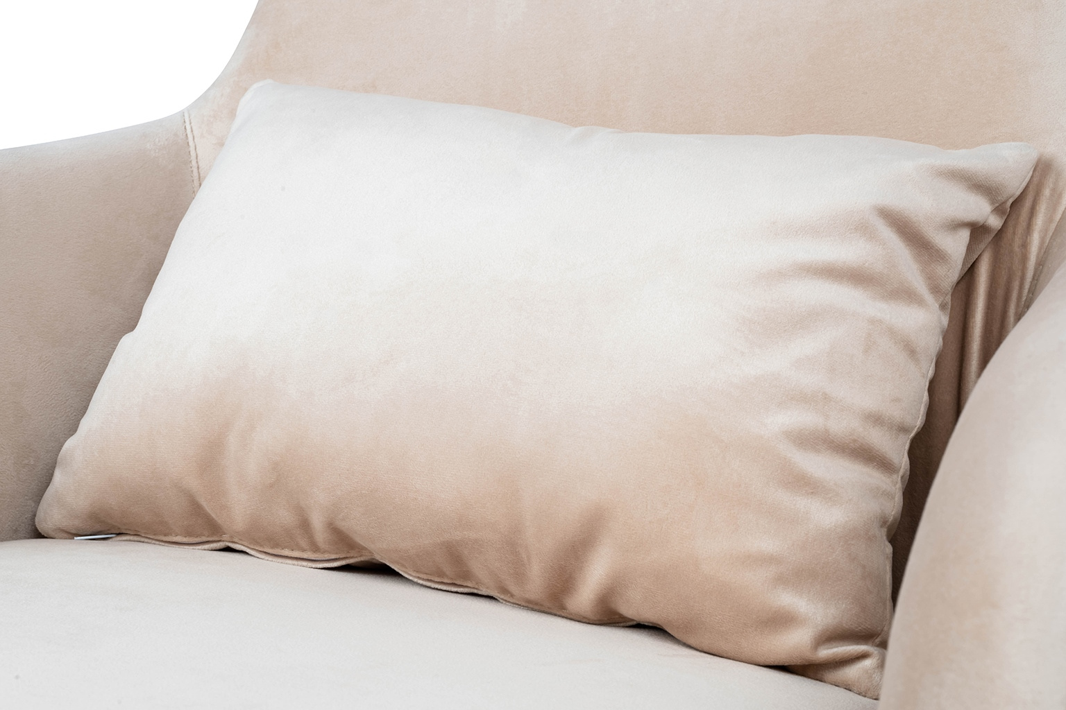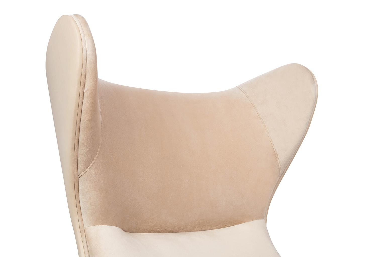 - Fotel HAMPTON. Siedzisko oraz poduszka tapicerowane są aksamitnym welurem w kolorze beżowym. Tył fotela został obszyty beżową ekoskórą. Metalowa podstawa o ciekawym kształcie w kolorze złotym podkreśla nowoczesny charakter fotela. Możliwość personalizacji