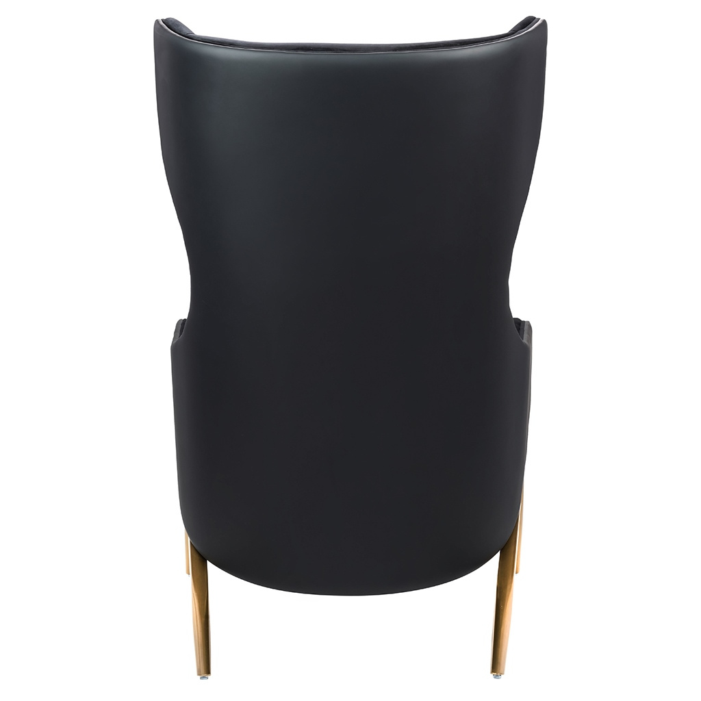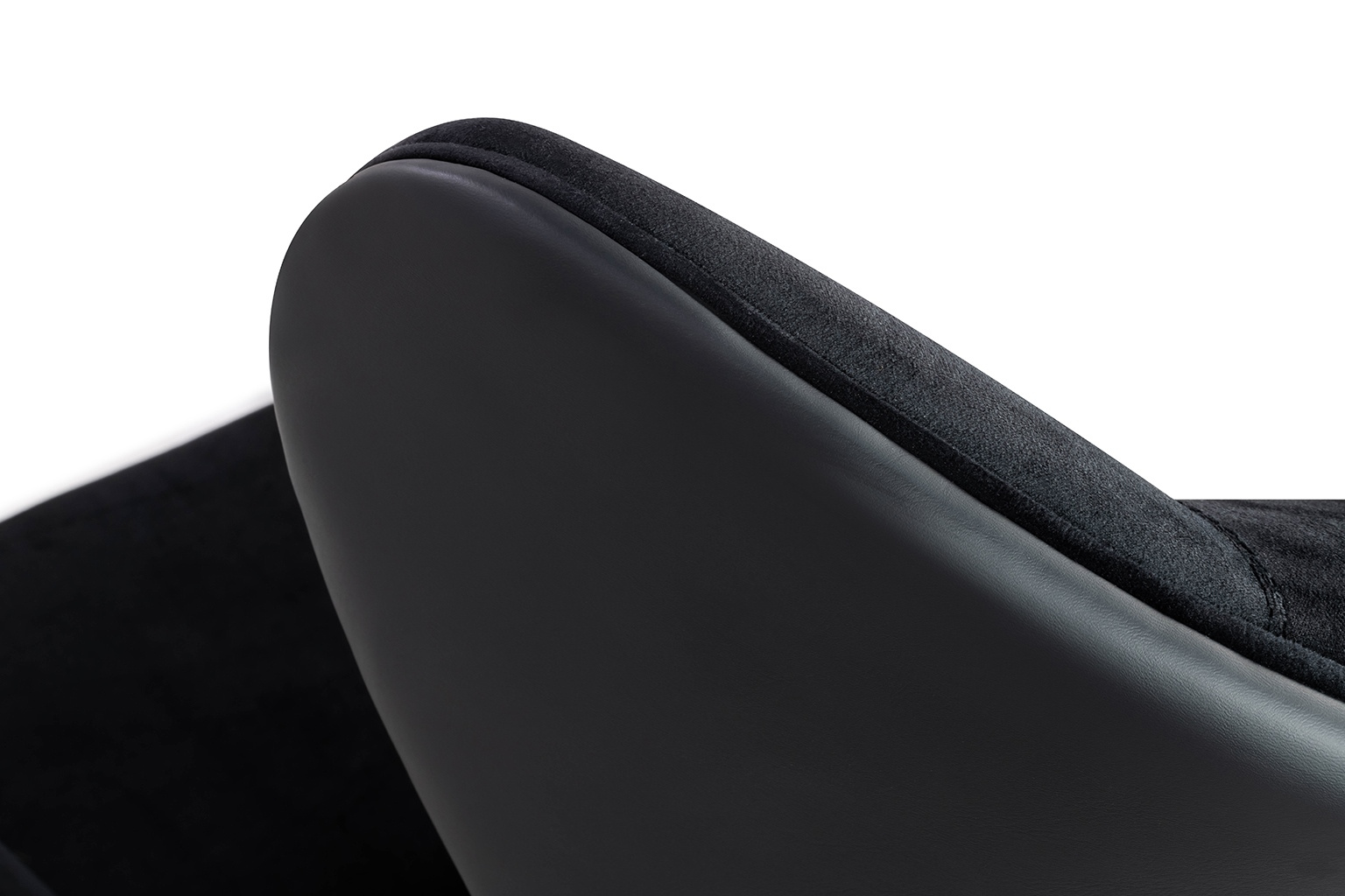 - Fotel HAMPTON. Siedzisko oraz poduszka tapicerowane są aksamitnym welurem w kolorze czarnym. Tył fotela został obszyty czarną ekoskórą. Metalowa podstawa o ciekawym kształcie w kolorze złotym podkreśla nowoczesny charakter fotela. Możliwość personalizacji