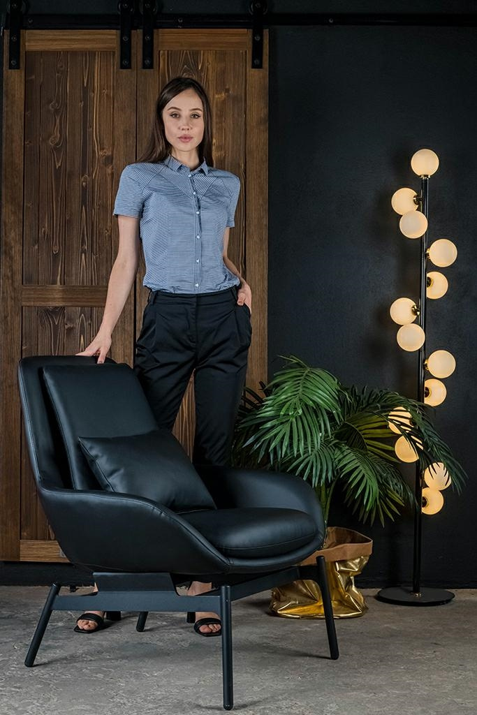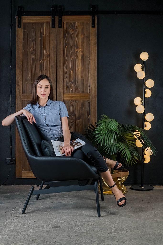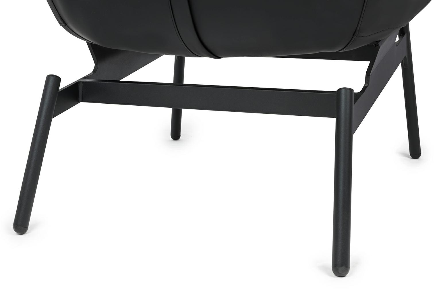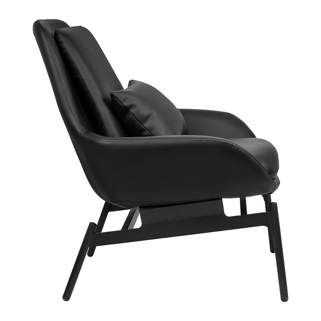 - Fotel LAZY. Siedzisko oraz dekoracyjne poduszki w całości tapicerowane są czarną ekoskórą. Szeroka metalowa podstawa lakierowana na kolor czarny sprawia, że konstrukcja fotela jest niezwykle stabilna, co zapewnia wygodę i komfort. Głębokość siedziska może