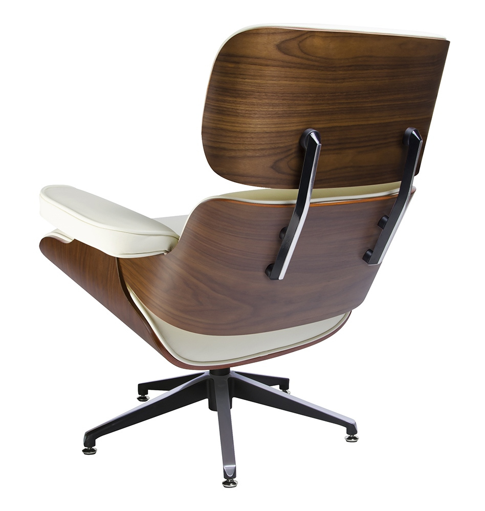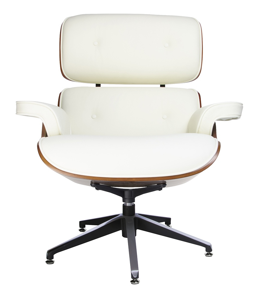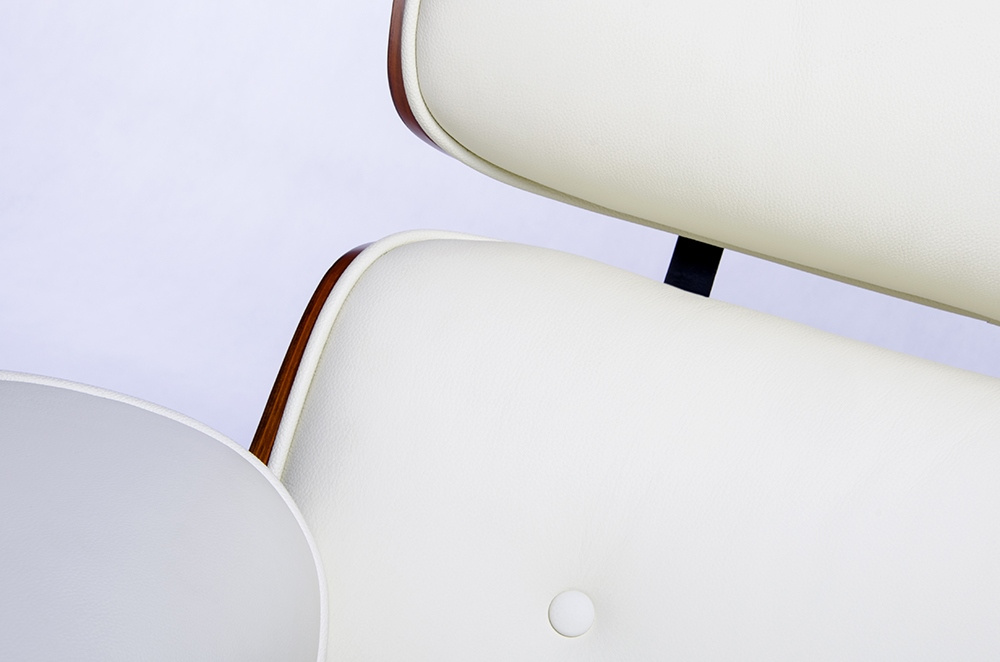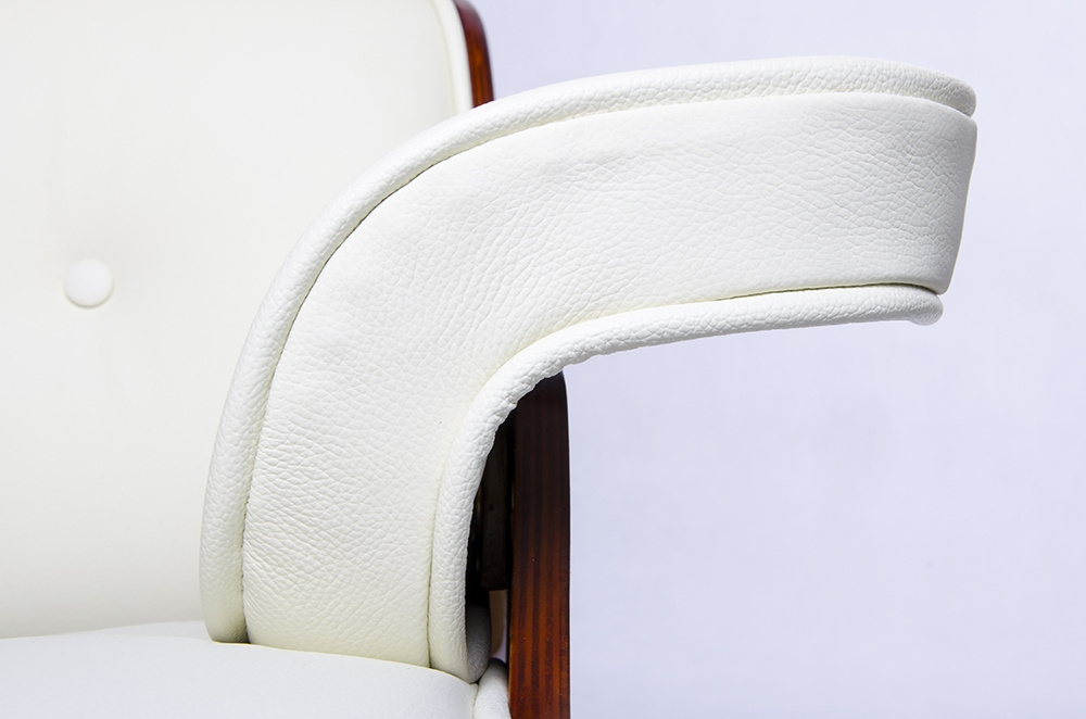 - Fotel LOUNGE biały z orzechowym drewnem. Siedzisko, oparcie oraz podłokietniki tapicerowane są skórą naturalną w kolorze białym. Korpus fotela został wykonany z giętego na ciepło drewna w kolorze jasny rzech. Podstawa oraz elementy metalowe wykonane zosta
