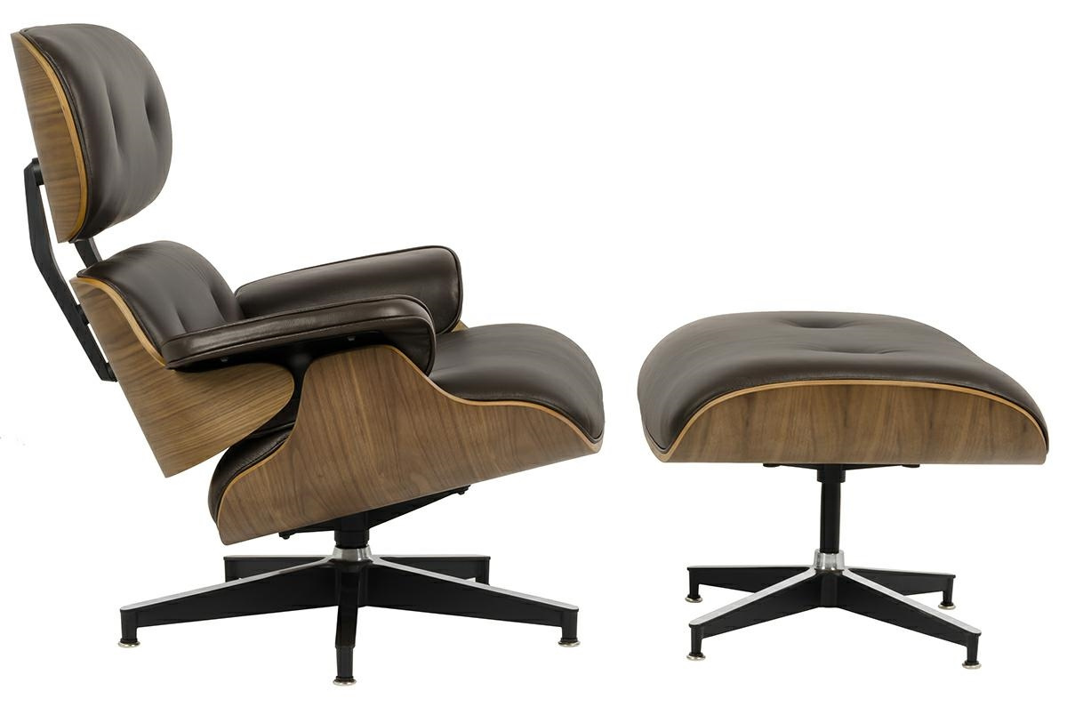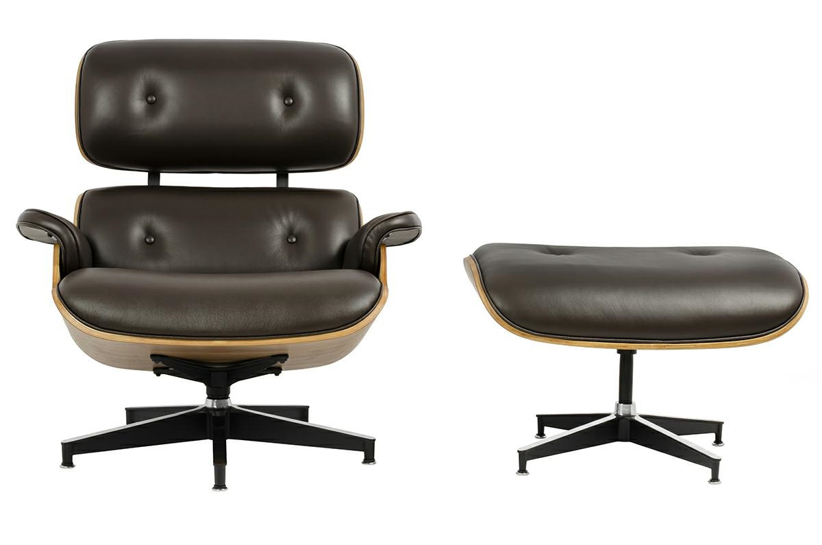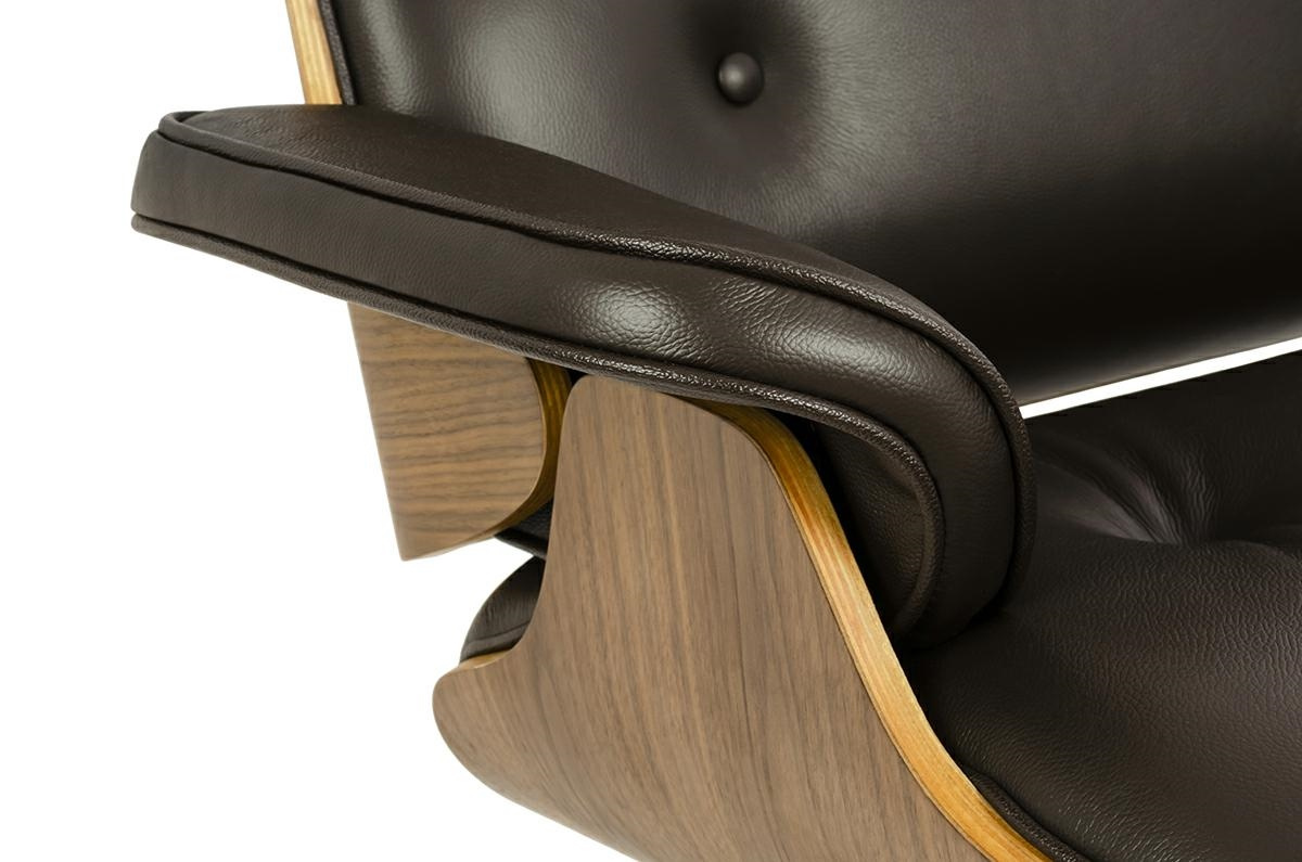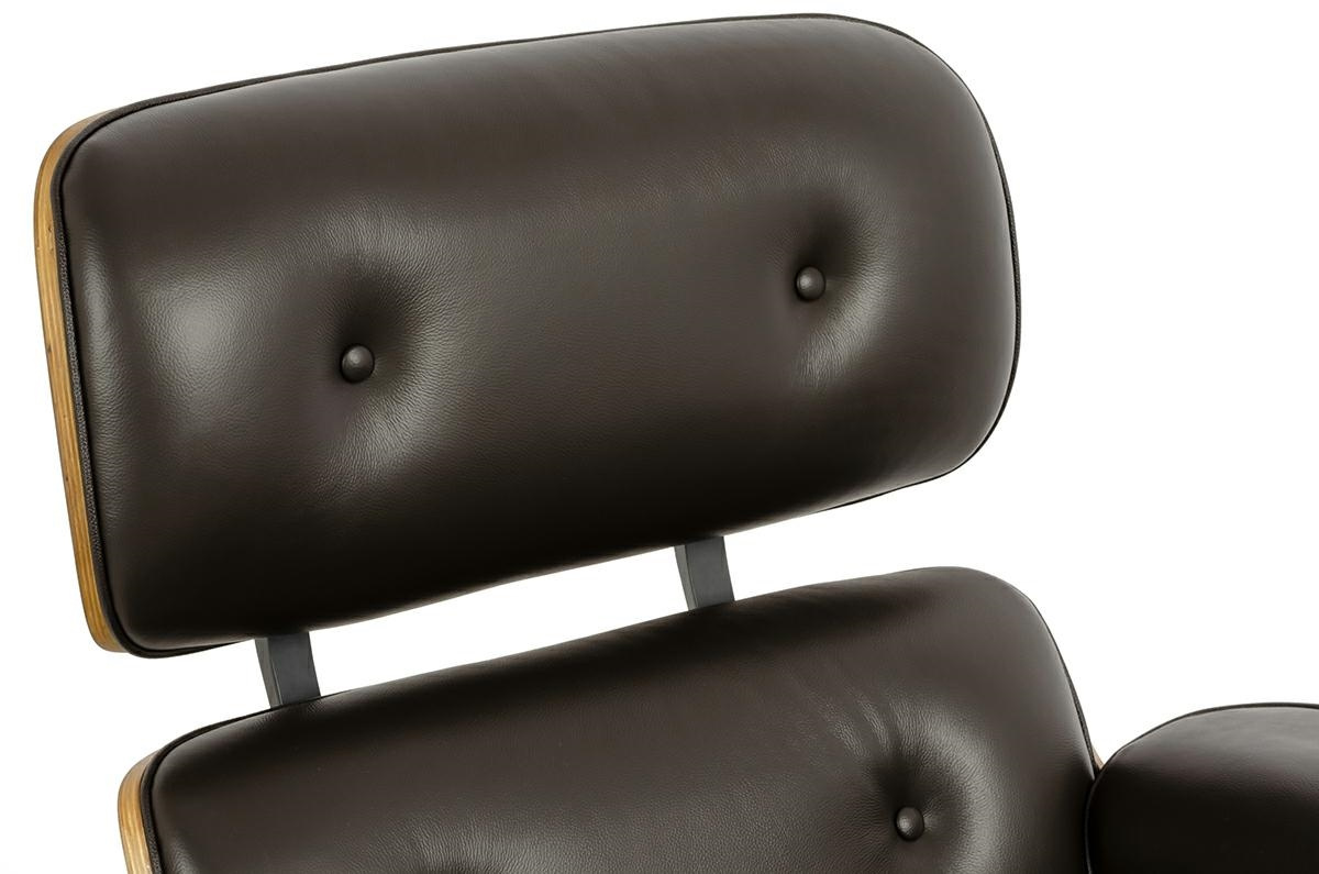 - Fotel LOUNGE HM PREMIUM SZEROKI brązowy z podnóżkiem z orzechowym drewnem. Cały fotel wraz z podnóżkiem tapicerowane są naturalną włoską skórą w kolorze brązowym. Zarówno korpus fotela jak i podnóżka został wykonany z giętego na ciepło drewna w kolorze or