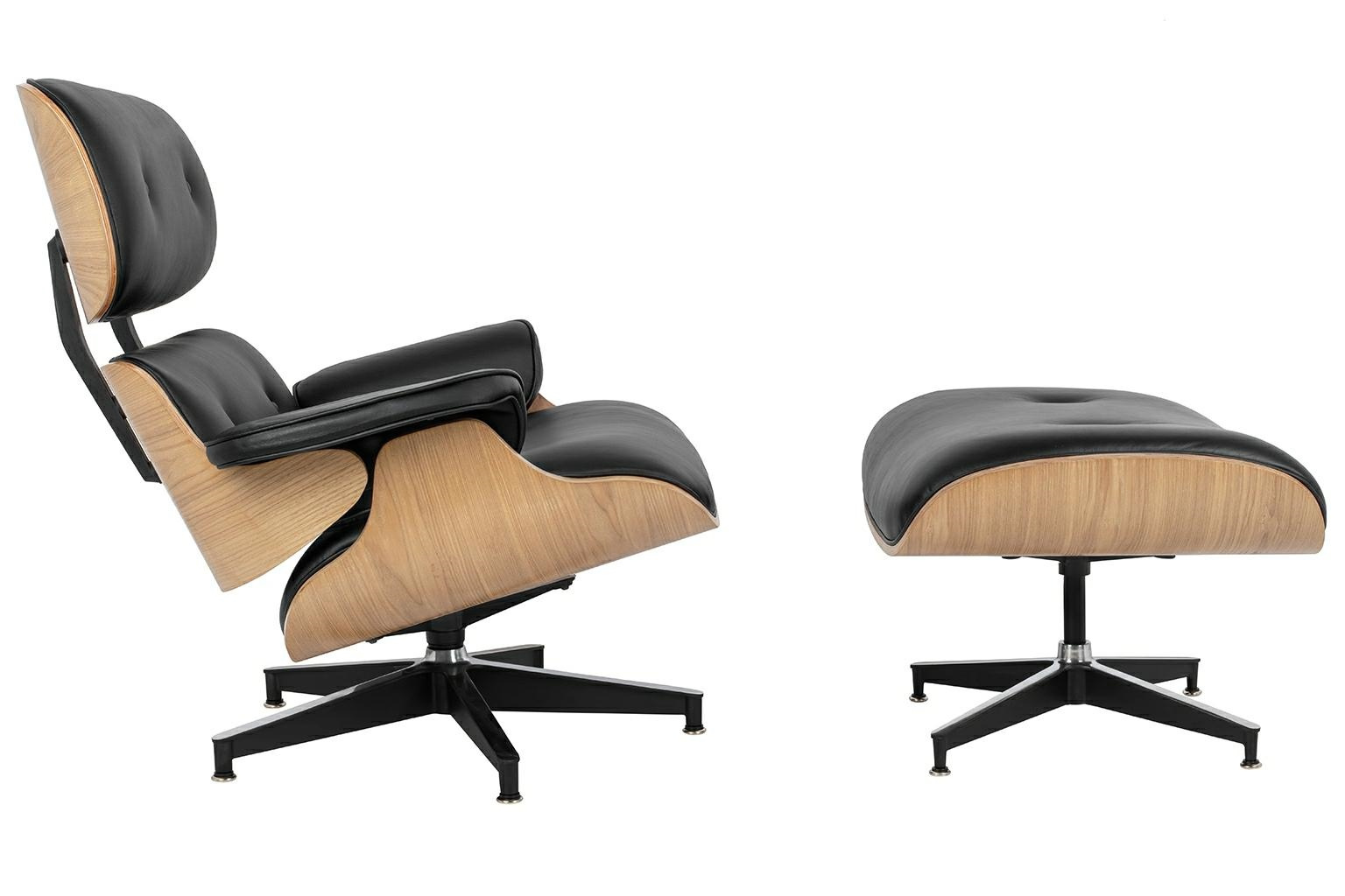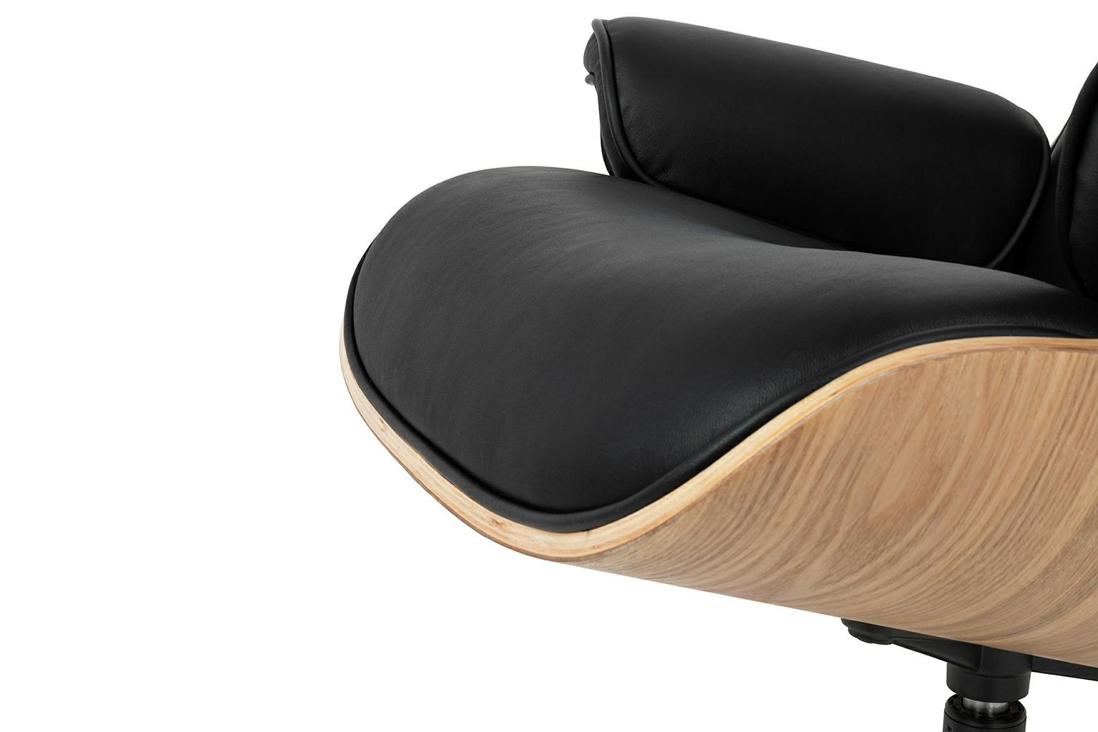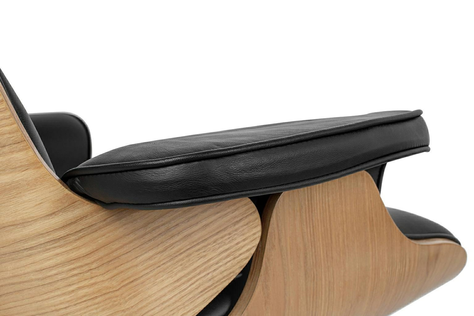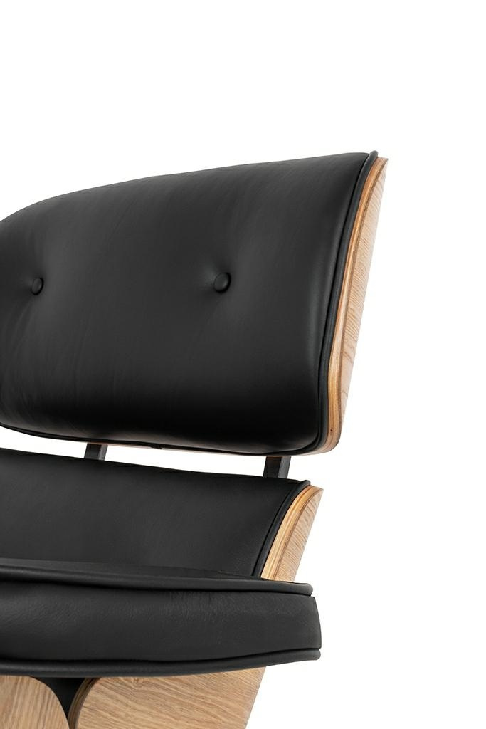 - Fotel LOUNGE HM czarny z podnóżkiem z jesionowym drewnem. Cały fotel wraz z podnóżkiem tapicerowane są naturalną włoską skórą w kolorze czarnym. Zarówno korpus fotela jak i podnóżka został wykonany z giętej sklejki fornirowanej drewnem jesionowym. Podstaw