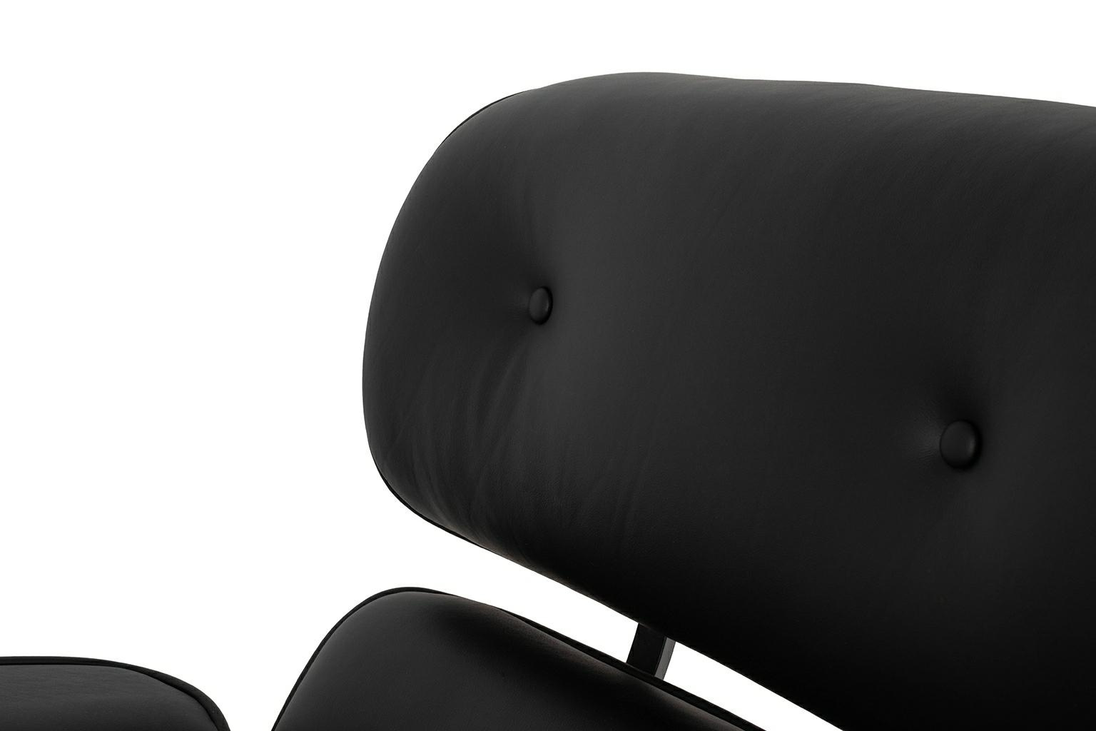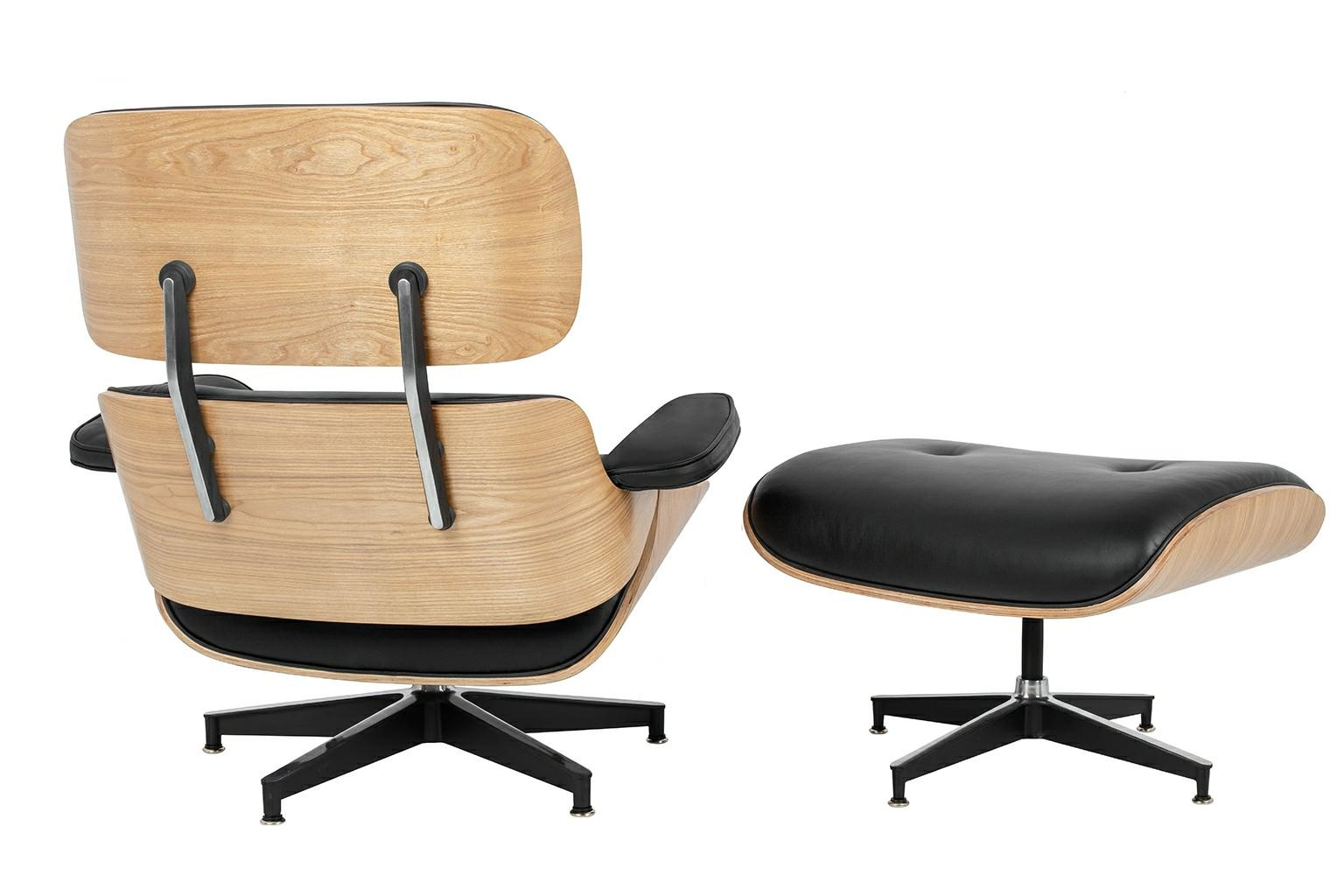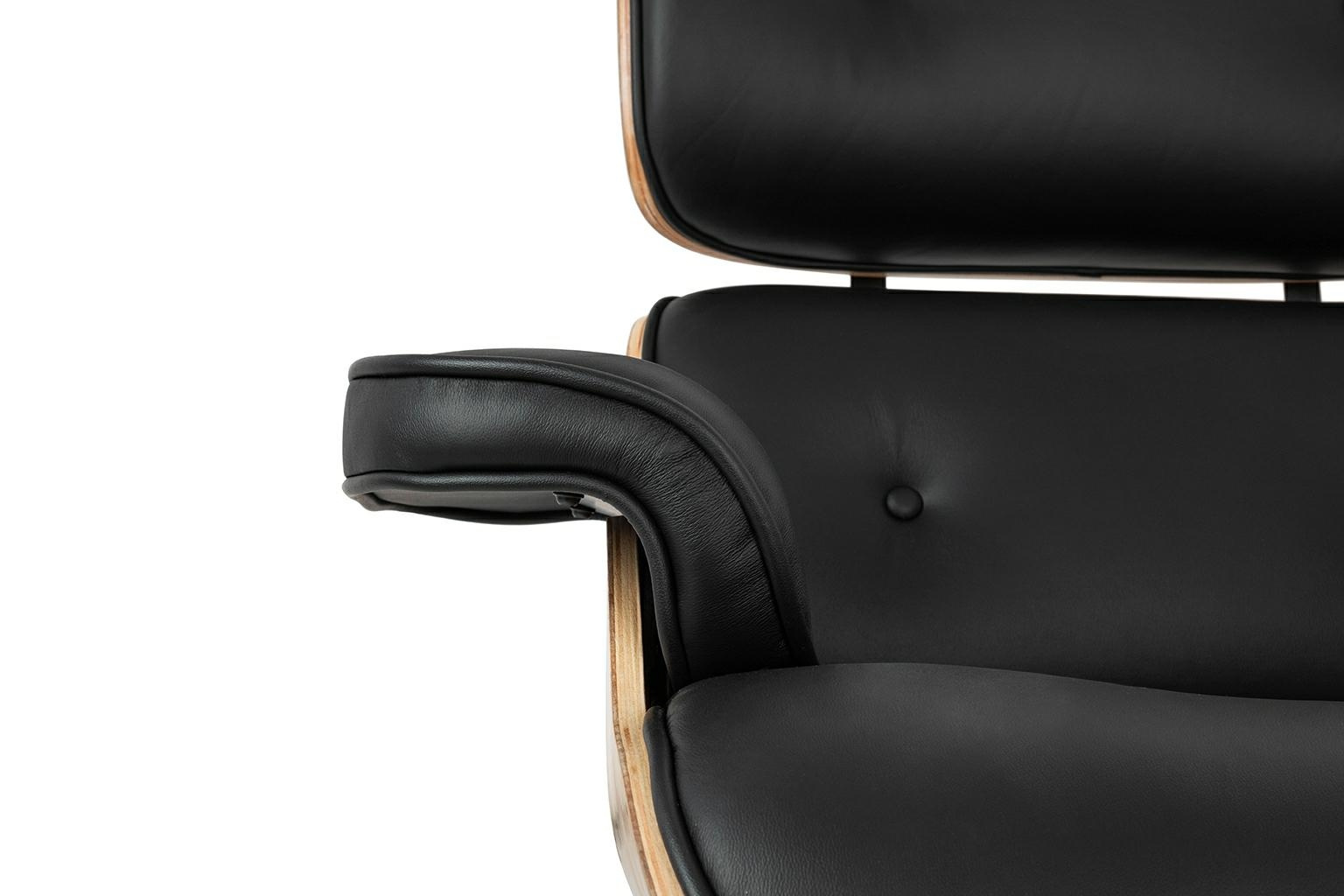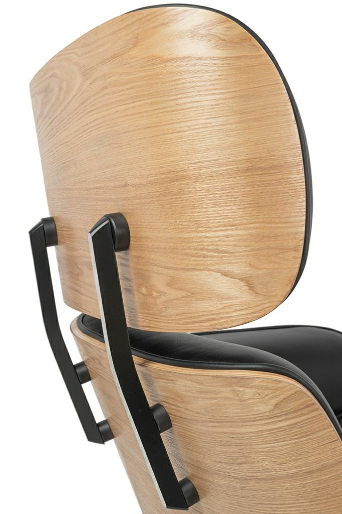 - Fotel LOUNGE HM czarny z podnóżkiem z jesionowym drewnem. Cały fotel wraz z podnóżkiem tapicerowane są naturalną włoską skórą w kolorze czarnym. Zarówno korpus fotela jak i podnóżka został wykonany z giętej sklejki fornirowanej drewnem jesionowym. Podstaw