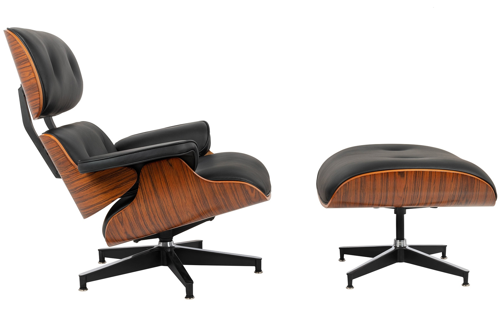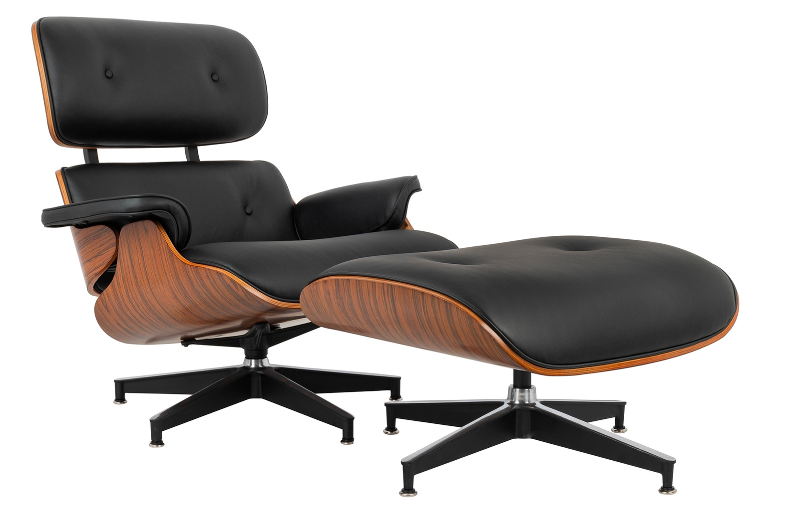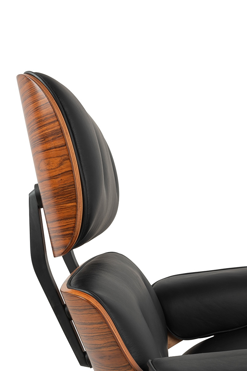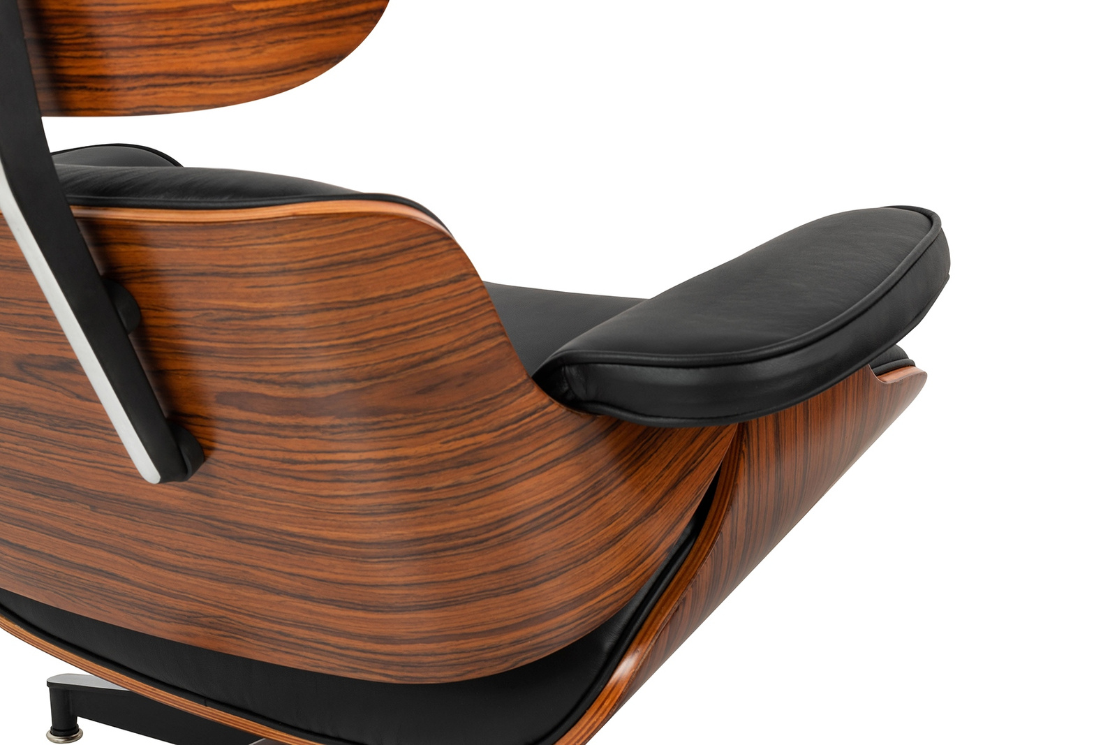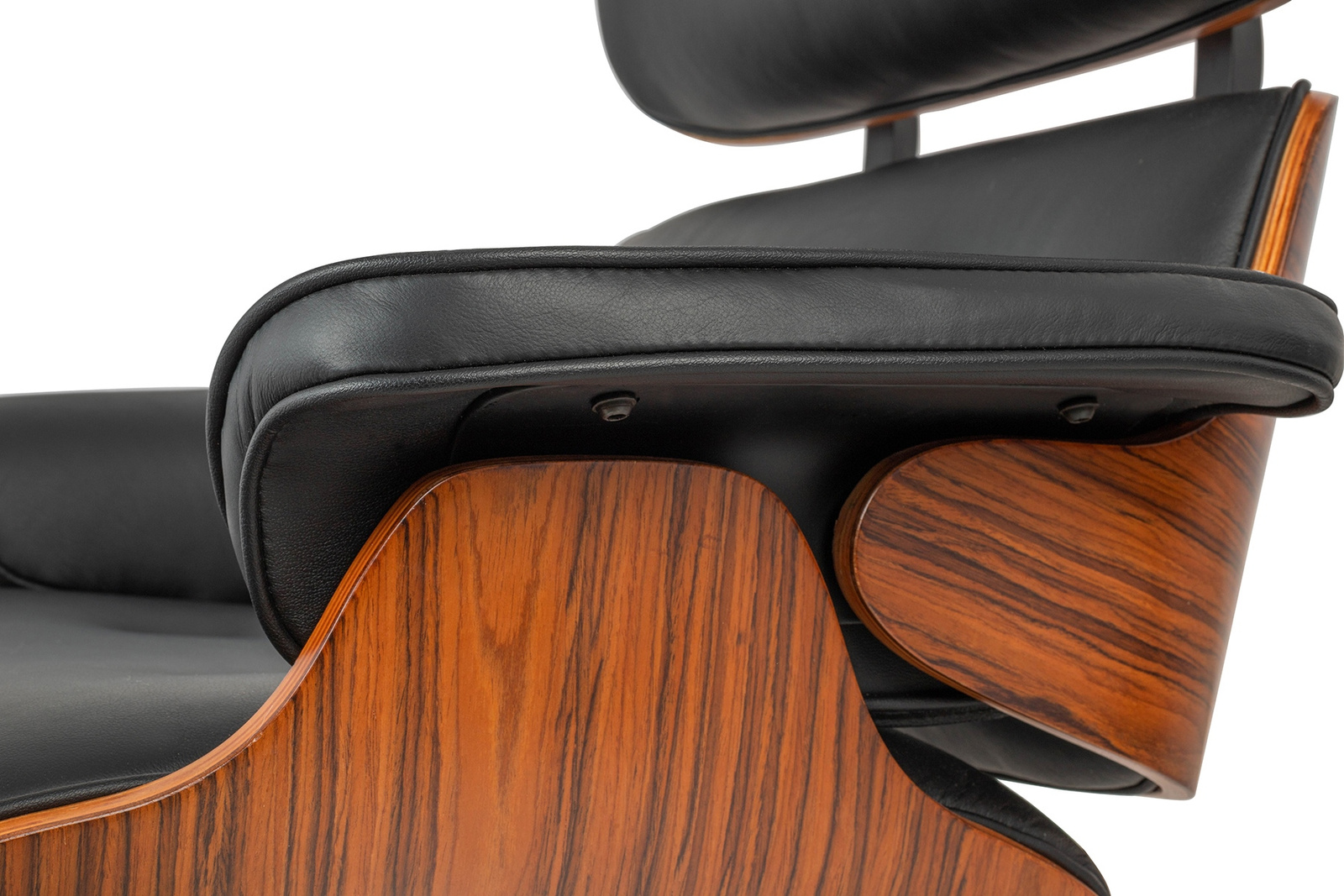 - Fotel LOUNGE HM PREMIUM SZEROKI czarny z podnóżkiem z różanym drewnem. Cały fotel wraz z podnóżkiem tapicerowane są naturalną włoską skórą w kolorze czarnym. Zarówno korpus fotela jak i podnóżka został wykonany z giętej sklejki fornirowanej drewnem różany