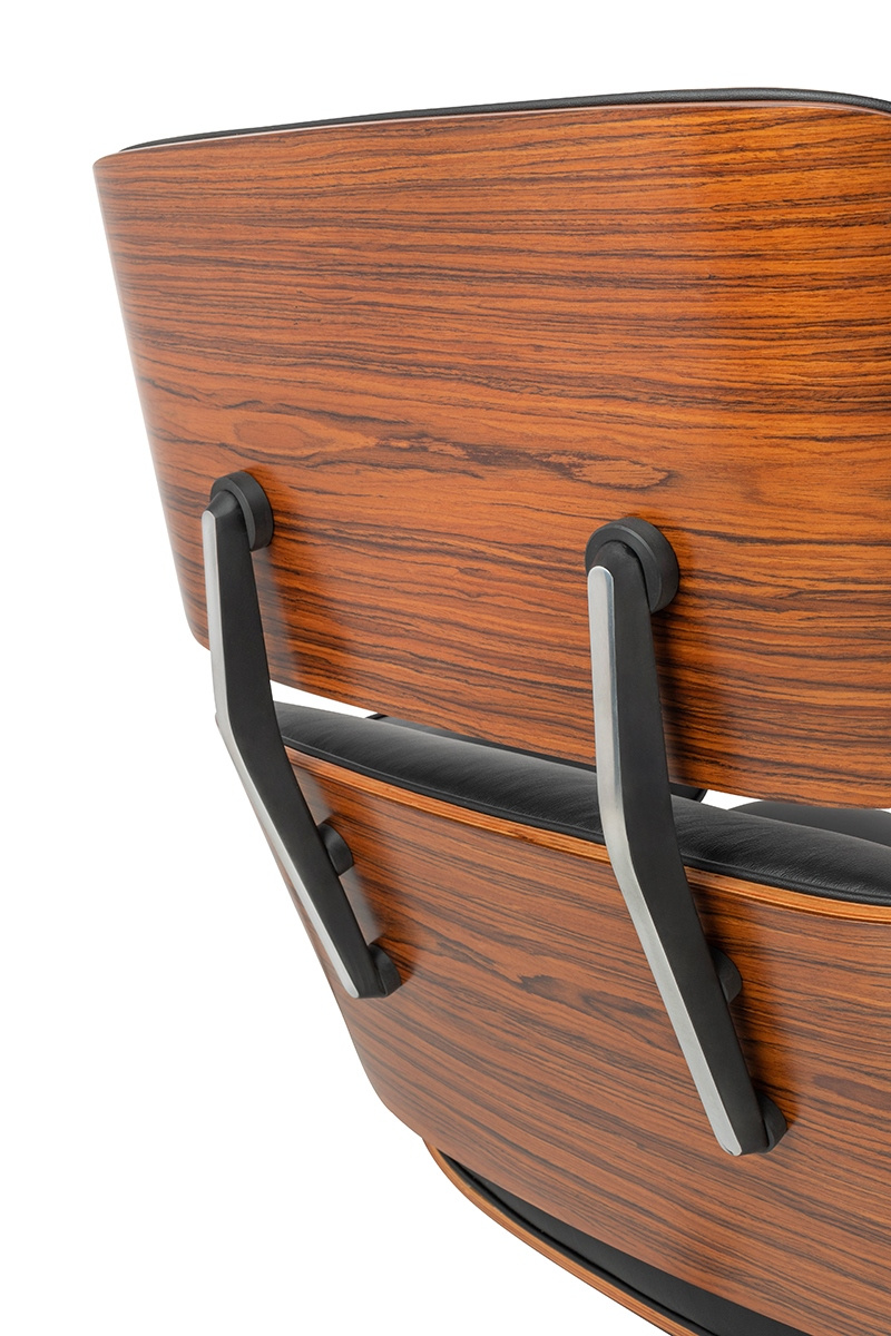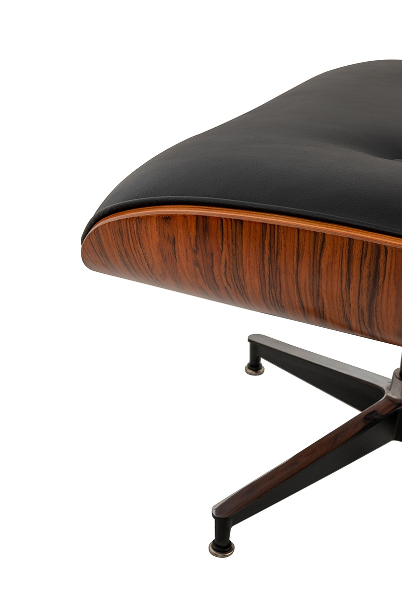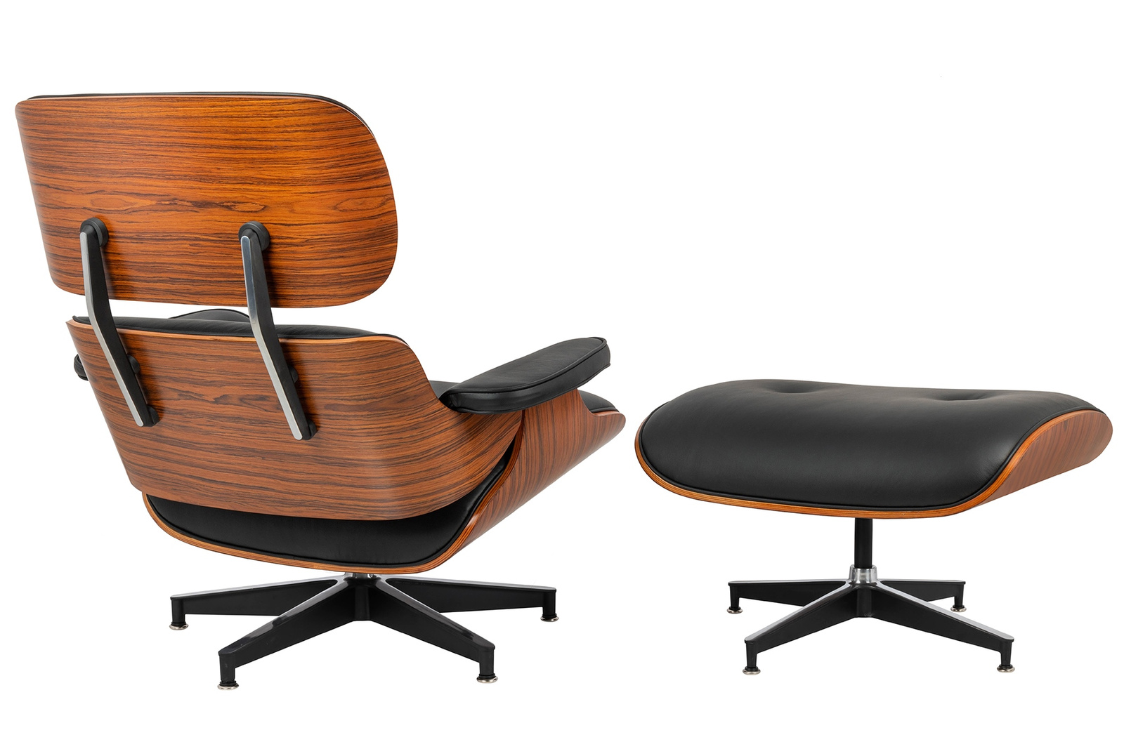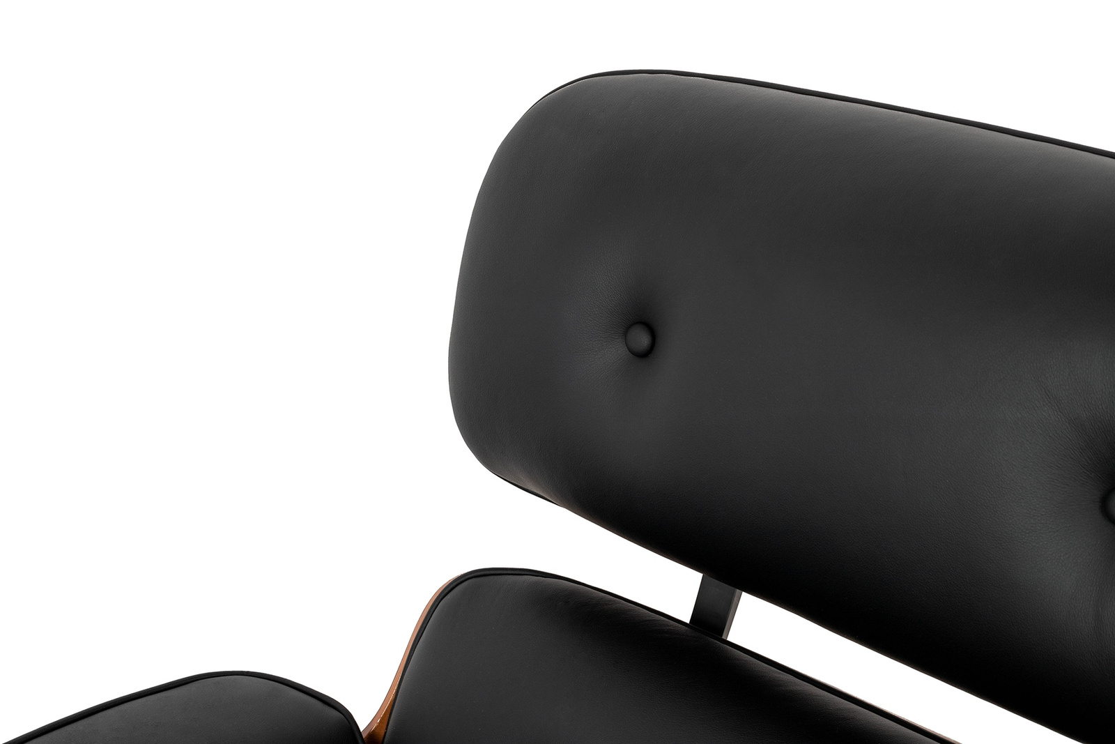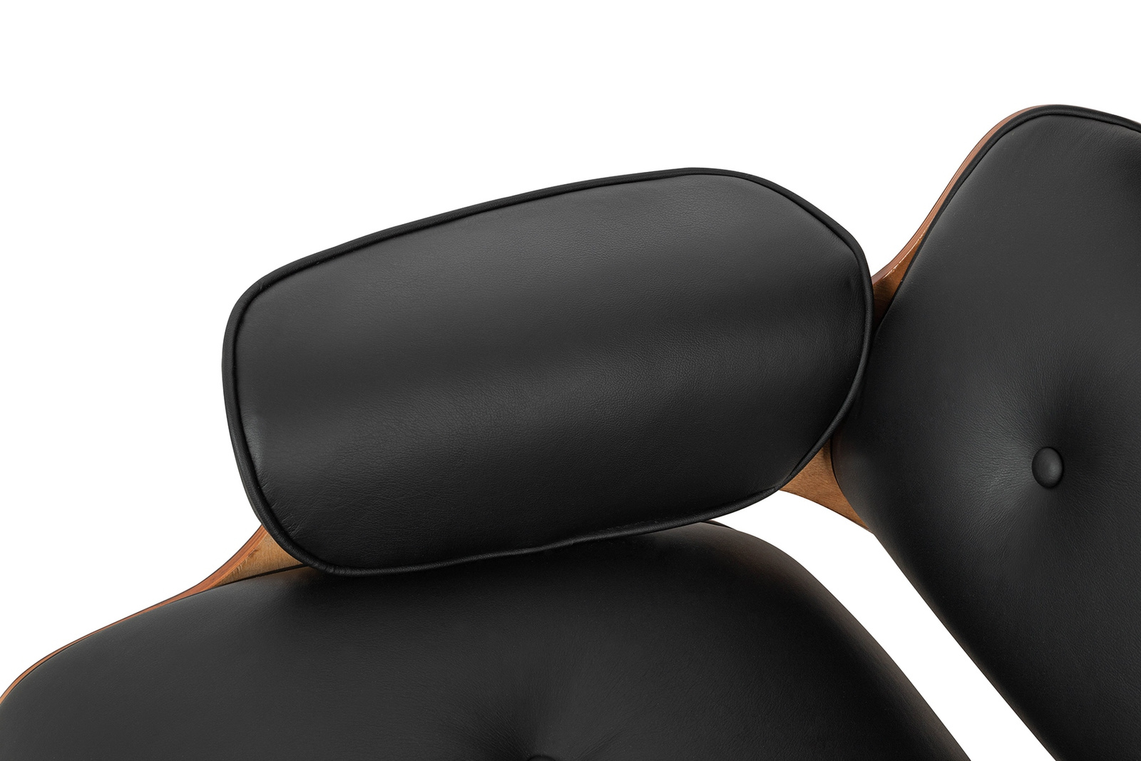 - Fotel LOUNGE HM PREMIUM SZEROKI czarny z podnóżkiem z różanym drewnem. Cały fotel wraz z podnóżkiem tapicerowane są naturalną włoską skórą w kolorze czarnym. Zarówno korpus fotela jak i podnóżka został wykonany z giętej sklejki fornirowanej drewnem różany