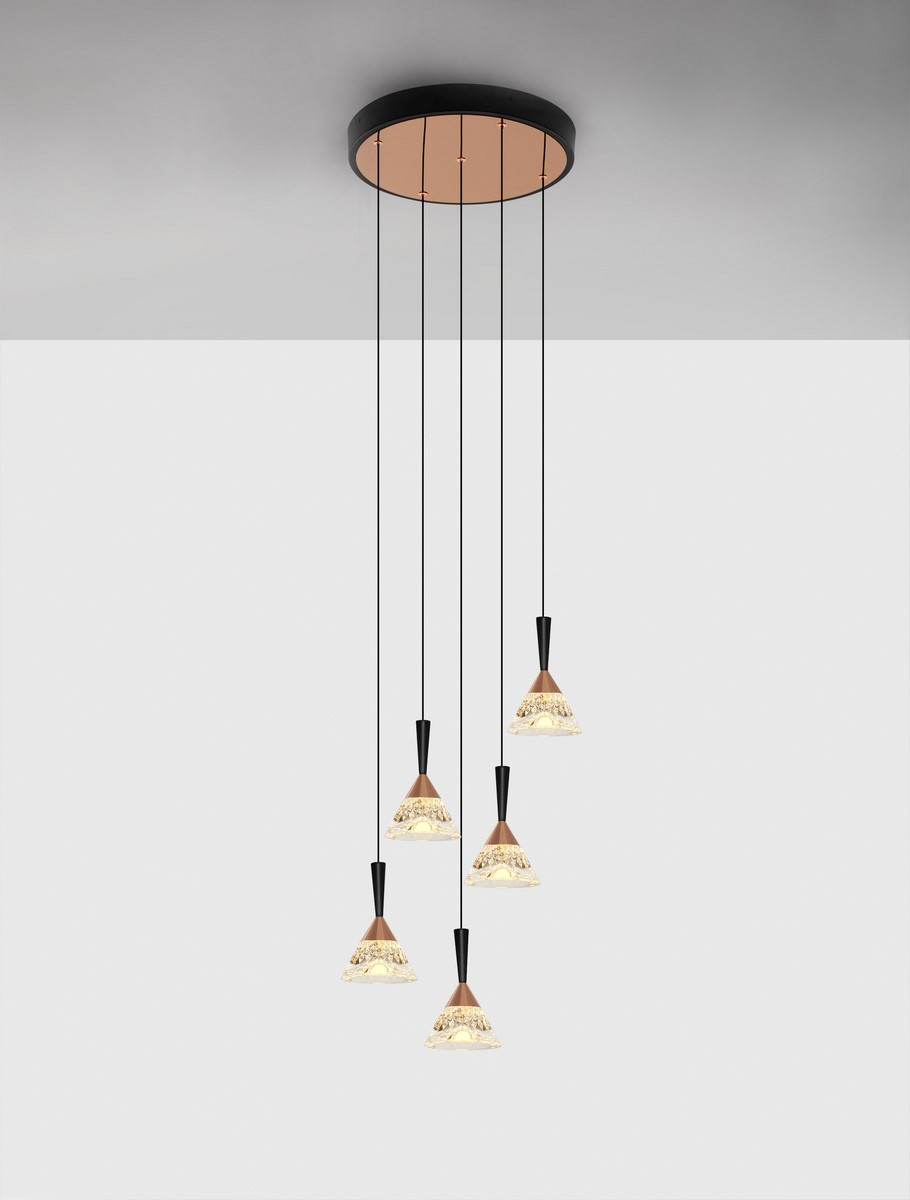 - GUAY to lampa wisząca w stylu glamour. Wykonana z najwyższej jakości materiałów takich jak metal i akryl, ma wysokość 150 cm i średnicę 32 cm. Idealnie nada się do salonu powieszona nad stołem lub kanapą. Oprawa zawiera wbudowane źródło światła o mocy 30