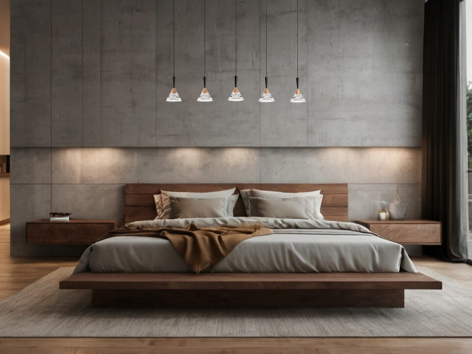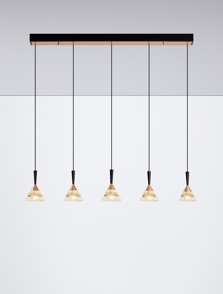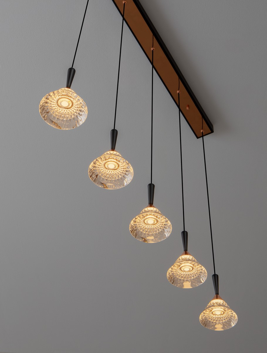 - GUAY to lampa wisząca w stylu glamour. Wykonana z najwyższej jakości materiałów takich jak metal i akryl, ma wysokość 150 cm i średnicę 32 cm. Idealnie nada się do salonu powieszona nad stołem lub wyspą kuchenną. 5 eleganckich kloszy zawieszonych na podłu