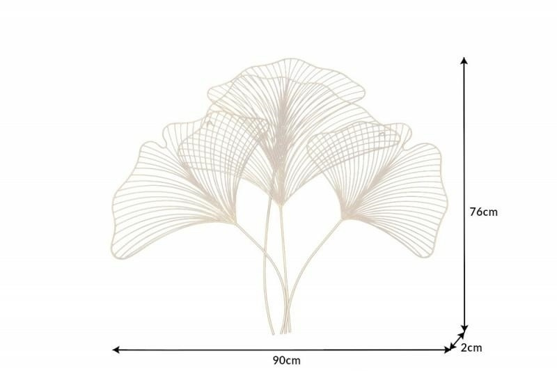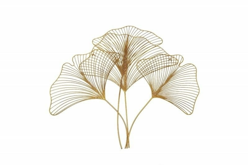 - Dekoracja ścienna GINKGO. W całości wykonana z metalu w kolorze złotym. Odwzorowuje ona cztery liście japońskiego drzewa, który pełni świetną dekorację wnętrz zarówno w salonie, sypialni czy łazience. Jej uniwersalny wygląd z pewnością przykuję uwagę Twoi