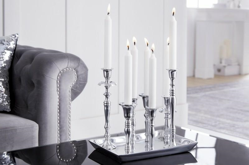 - Świecznik 7-płomieniowy to Propozycja, dla których ludzi interesują przedmioty z grup klasycznych czy barokowych. Jest to świetna ozdoba, która sprawdzi się na przykład podczas wspólnych obiadów. Została wykonana ze stopy aluminium w kolorze srebrnym. Wym