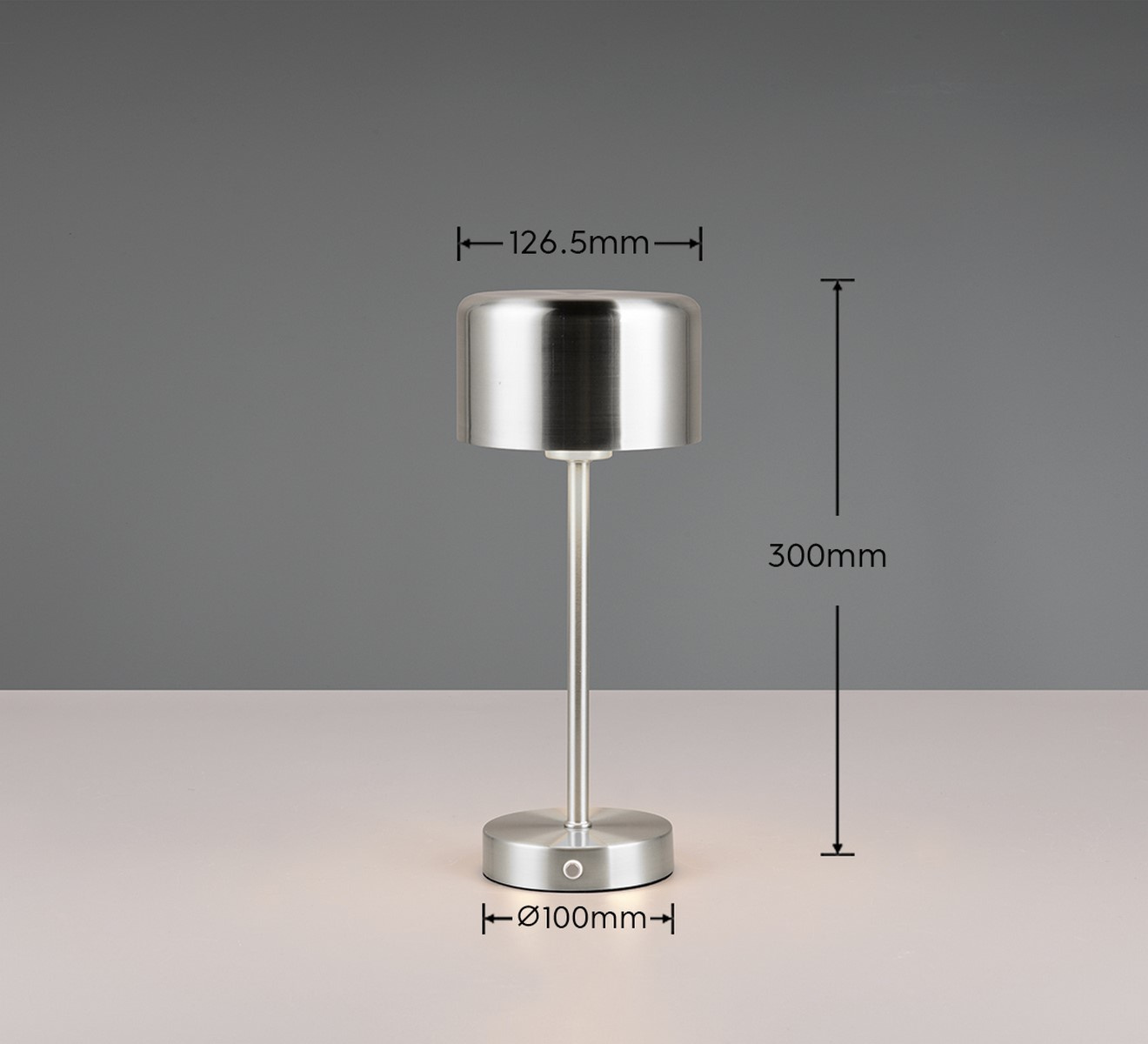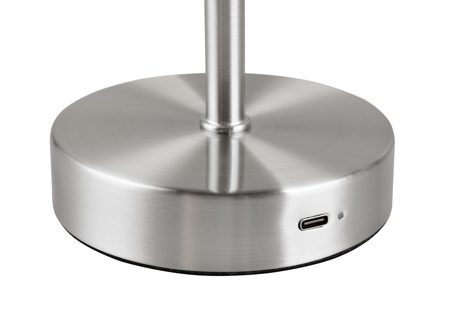 - JEFF Kolor nikiel mat. Funkcja dotykowa 4 poziomy. IP20. Akumulator ładowany przez złącze USB-C. Czas ładowania 6-8 h, czas świecenia 12h.