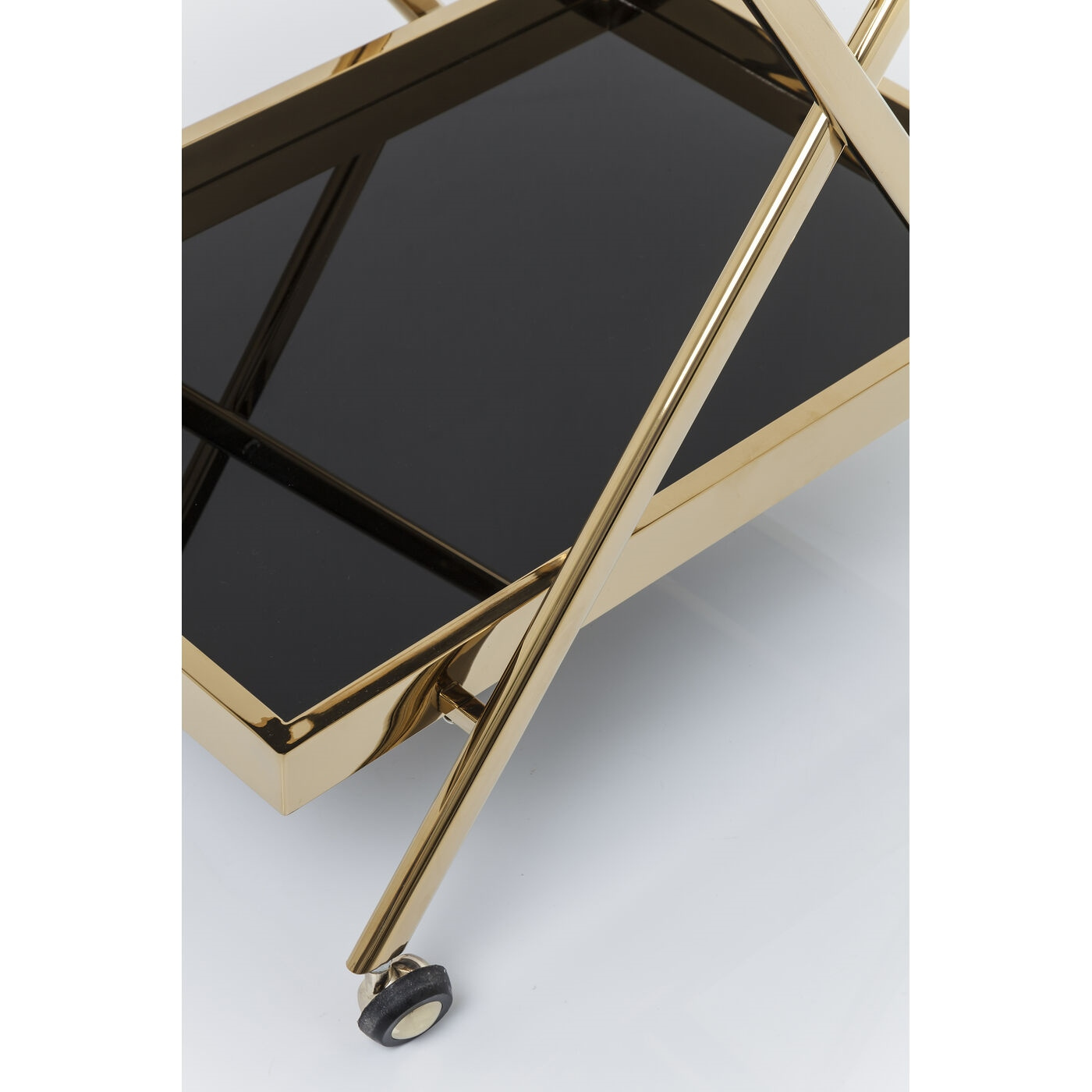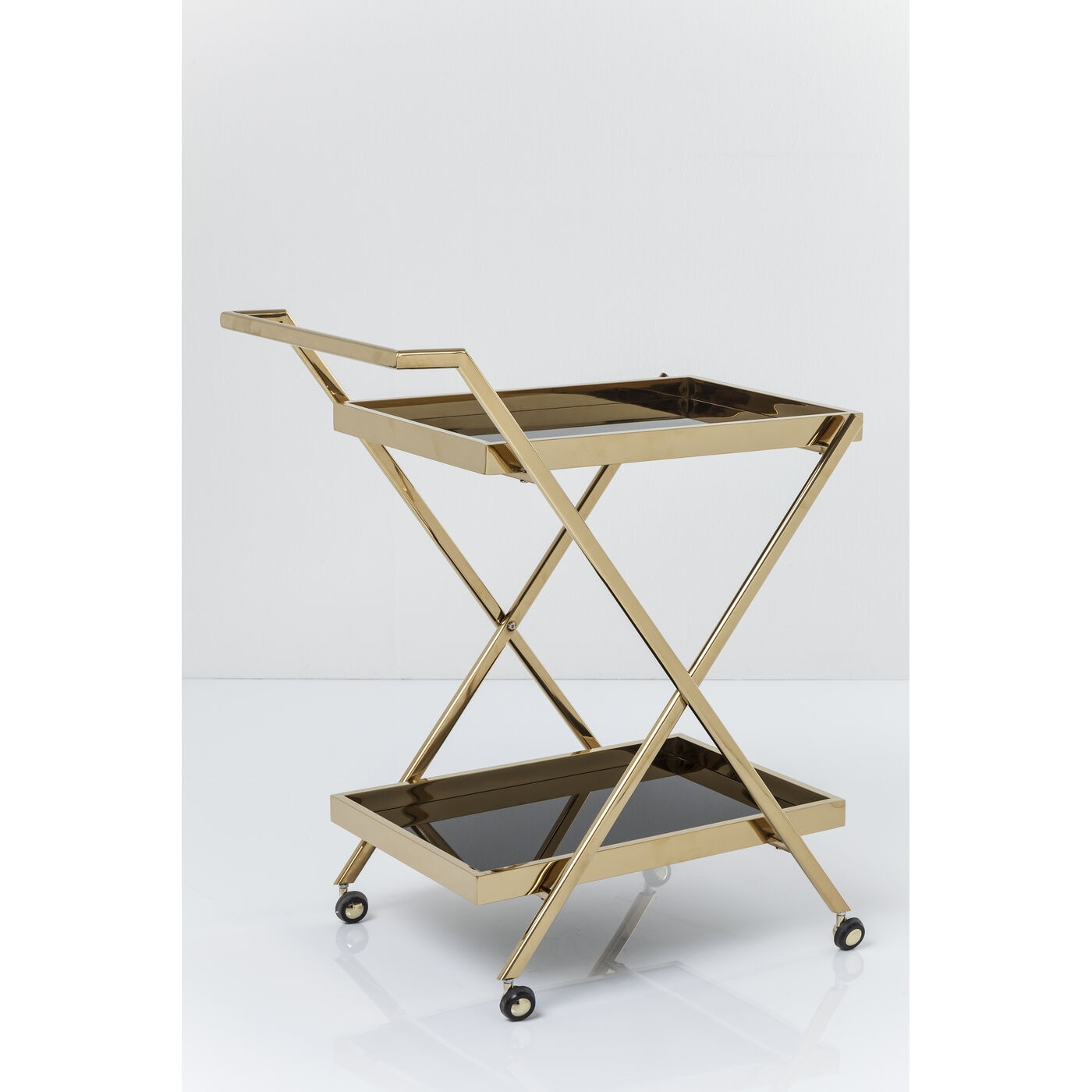 - KARE barek CASINO złoty. Elegancki, złoty wózek barowy w stylu retro, który doskonale sprawdzi się w każdym wnętrzu. Dzięki stalowej ramie pokrytej mosiądzem oraz dwóm czarnym półkom ze szkła hartowanego łączy w sobie luksus i funkcjonalność. Oferuje dwa