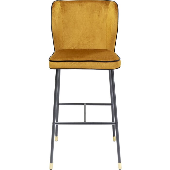 - KARE krzesło barowe IRINA. Niebywała elegancja i styl, która doskonale sprawdzi się w nie jednej kuchni. Wygodne siedzisko wykonano z aksamitnej musztardowej tkaniny poliestrowej i wzbogacono je czarnymi przeszyciami. Smukłe nóżki wykonano z czarnej stali