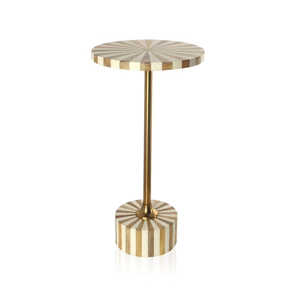 - KARE stolik DOMERO CIRQUE 25 biało-złoty. Designerski o pięknym geometrycznym wzorze stolik. Wykonany ręcznie ze stali pokrytej mosiądzem, płyty MDF oraz forniru z prawdziwego drewna mango. Elegancka kolorystyka w tonacji biało-złotej z drewnianymi detala