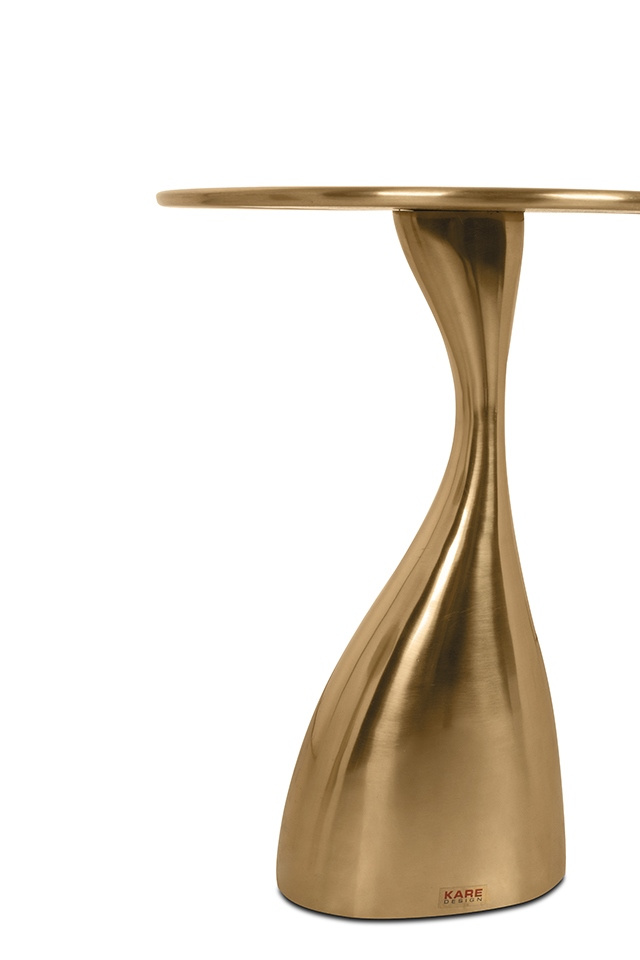 - KARE stolik SPACEY 36 złoty. Spacey to designerski oraz niezwykle praktyczny stolik. Oryginalny kształt wykonano ręcznie z aluminium w eleganckim złotym kolorze. Okrągły blat wykończono w jasnym odcieniu z delikatnym połyskiem, który dodaje całości delika