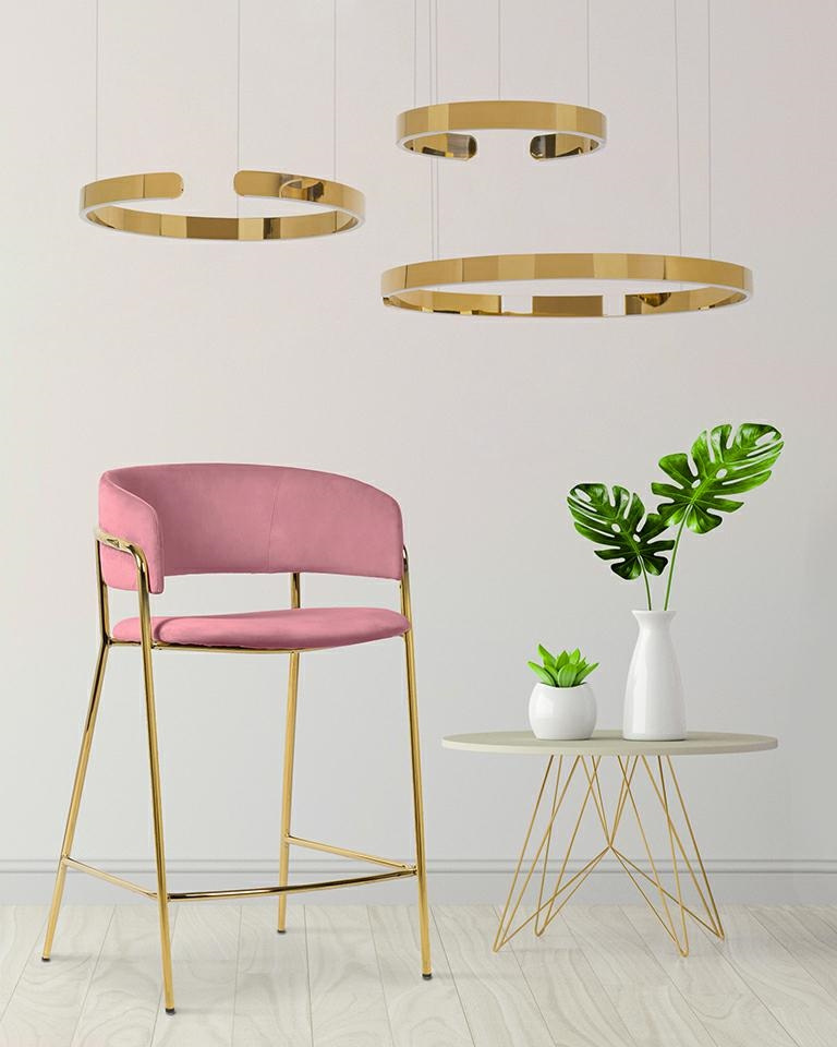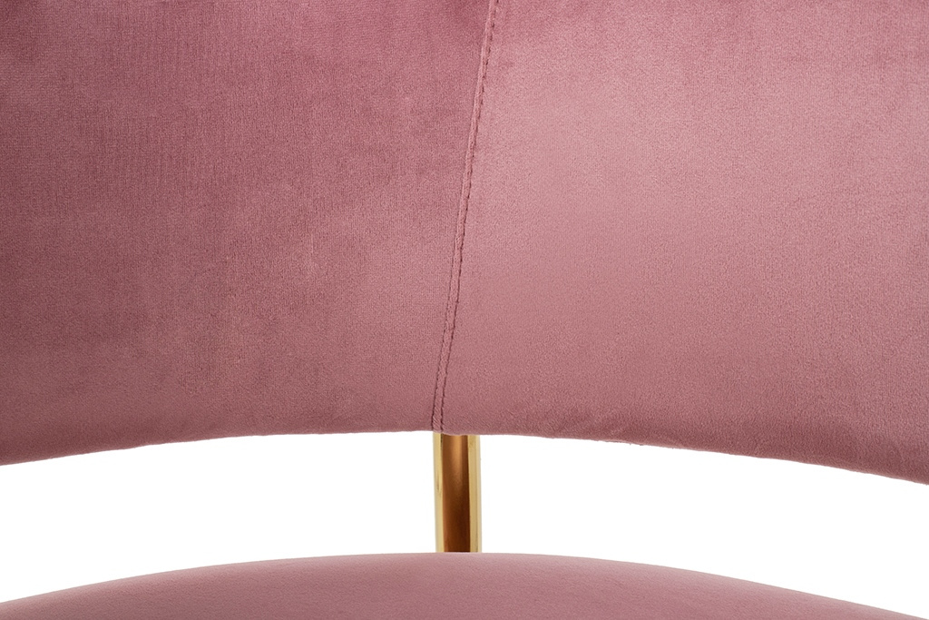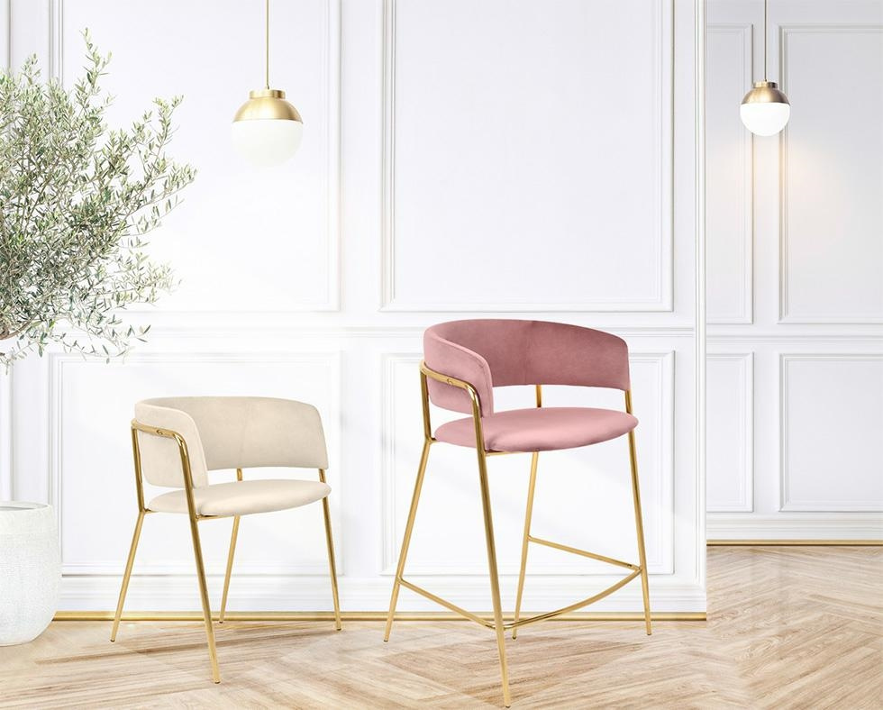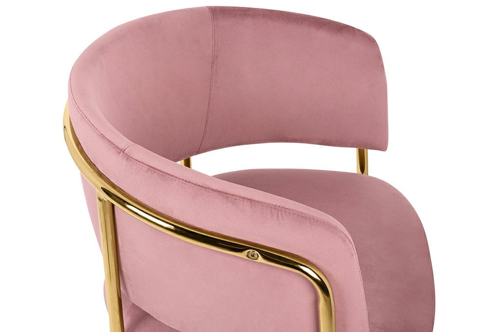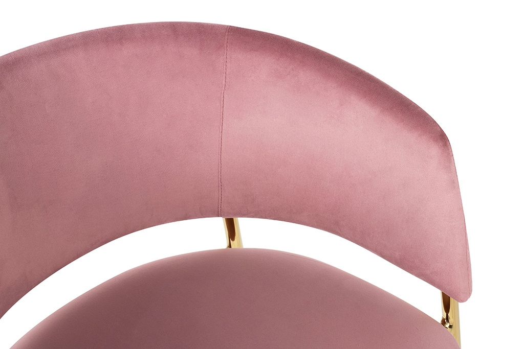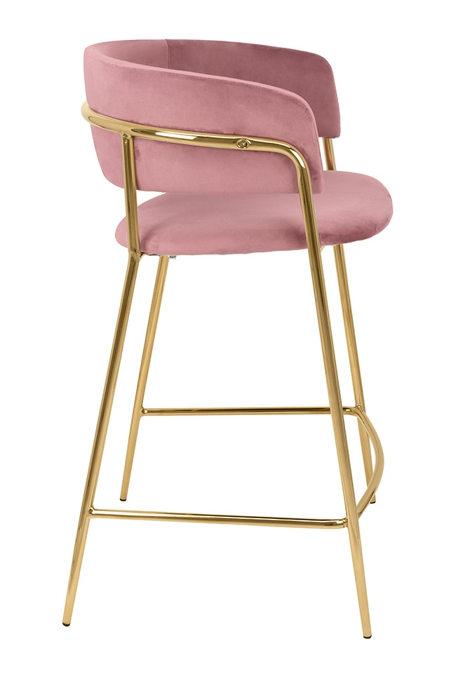 • Krzesło barowe DELTA 65 różowe. Siedzisko i oparcie tapicerowane są miękkim i przyjemnym w dotyku welurem. Mocna, stabilna konstrukcja została wykonana z metalu w złotym, błyszczącym kolorze. Gładkie oparcie w połączeniu z nowoczesną kolorystyką sprawiają