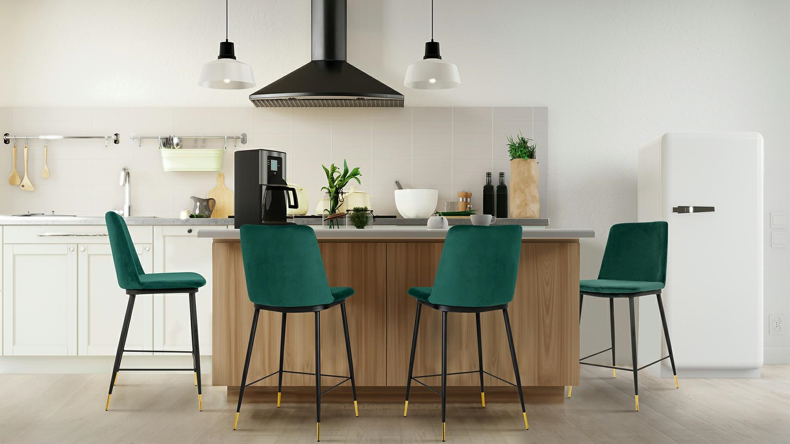 • Krzesło barowe Diego w kolorze zielonym. Siedzisko i oparcie tapicerowane miękkim i przyjemnym w dotyku welurem. Konstrukcja z metalu w kolorze czarnym z satynowym wykończeniem. Ciekawym elementem dekoracyjnym są złote zakończenia nóg. Hoker doskonale odn