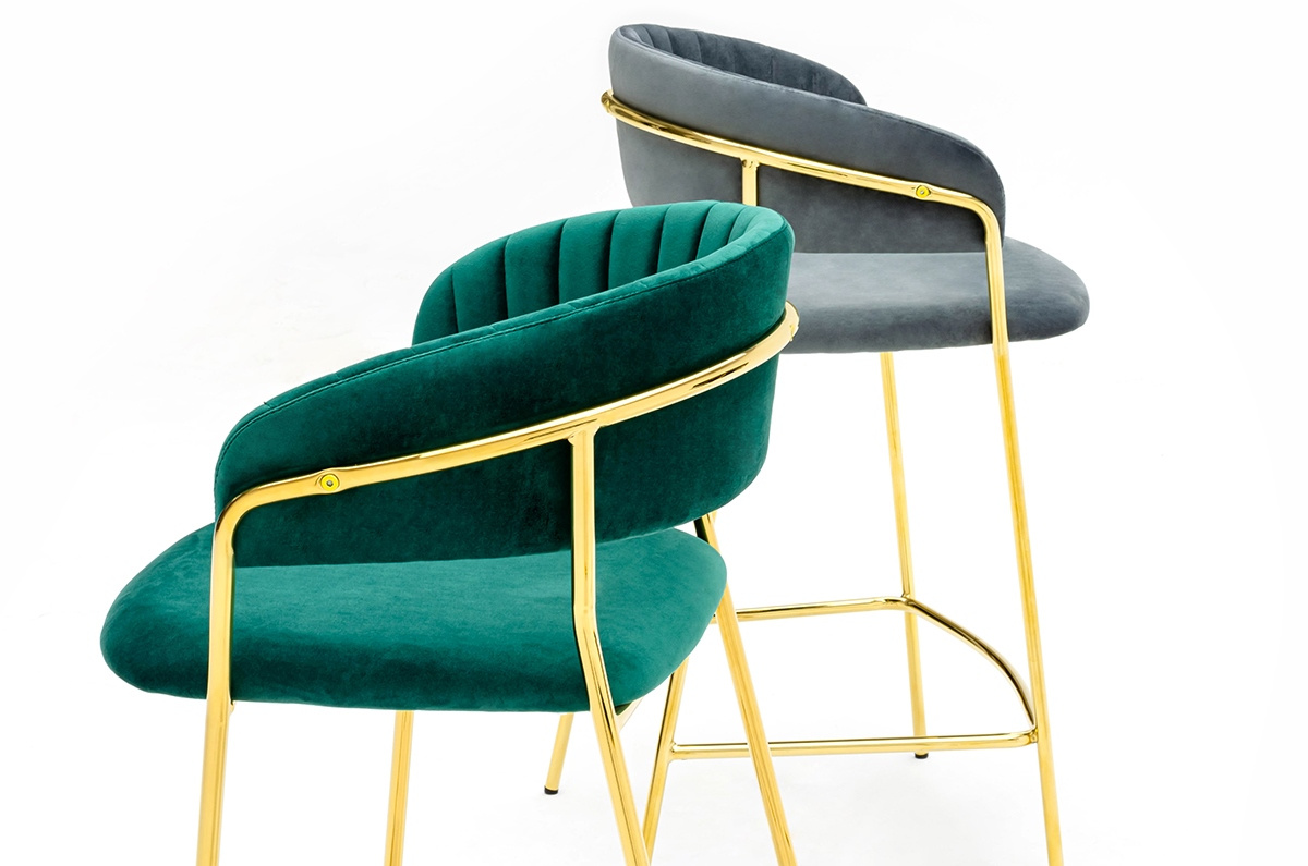 - Hoker Margo w kolorze ciemny szary. Siedzisko i oparcie tapicerowane miękkim i przyjemnym w dotyku welurem. Mocna i stabilna konstrukcja wykonana została z metalu w kolorze złotym, błyszczącym. Doskonałe połączenie modnej tkaniny i złota. Pionowe przeszyc