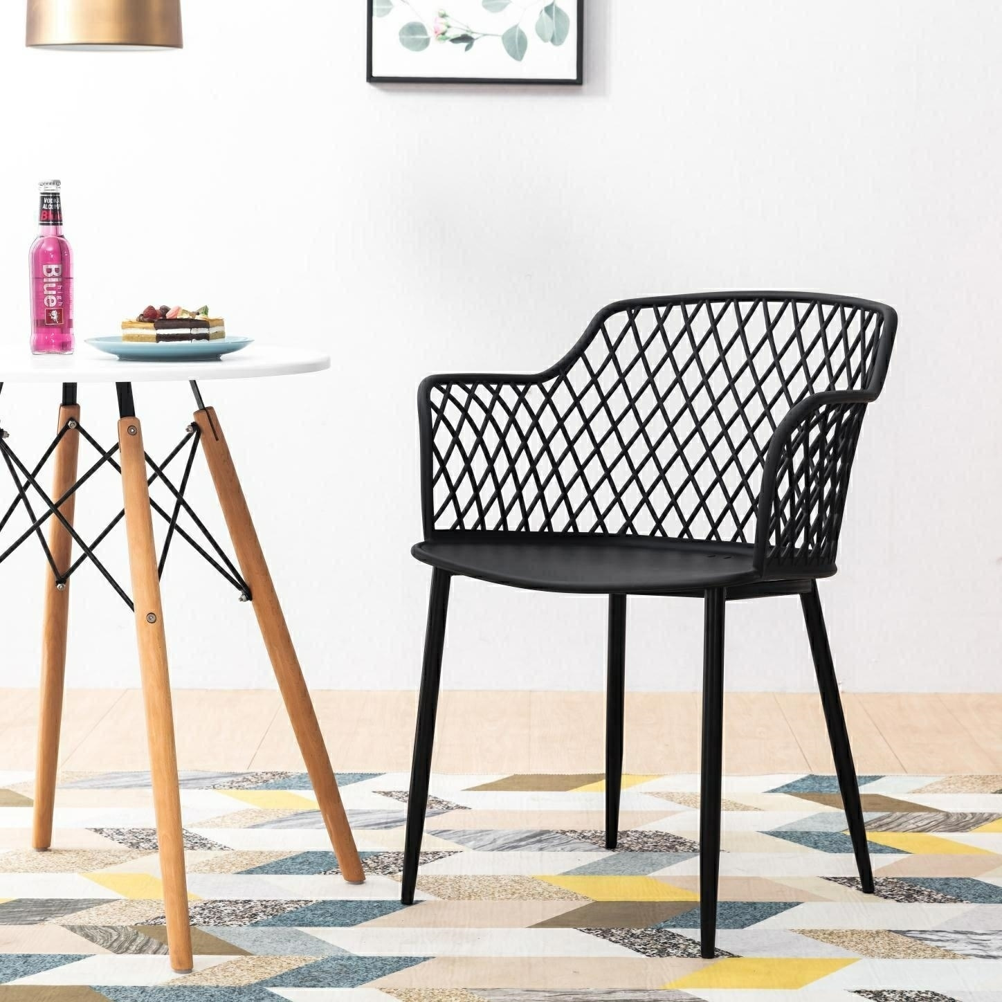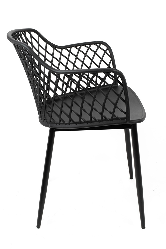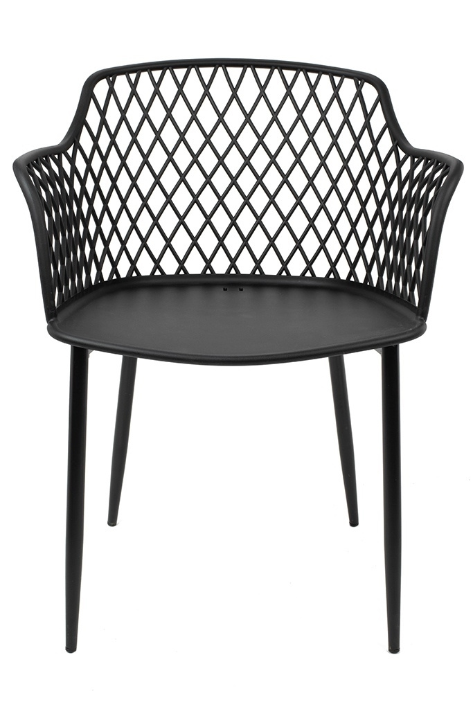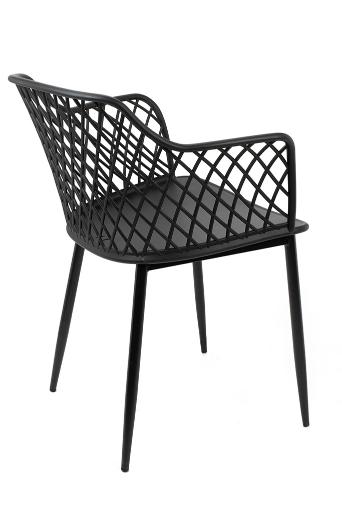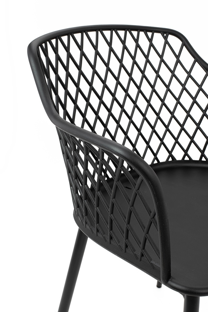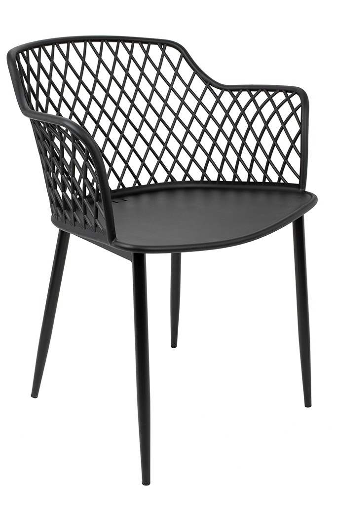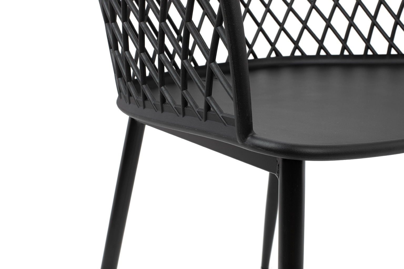 Krzesło BINN. Ciekawy, ażurowy design połączony z praktycznym zastosowaniem. Siedzisko zostało w całości wykonane z polipropylenu w czarnym matowym kolorze. Metalowa podstawa i szerokie siedzisko sprawiają, że krzesło jest stabilne i komfortowe. Wymiary: wys. 78,5 cm / szer. 62 cm / gł. 55,5 cm Wysokość do krawędzi siedziska: 45,5 cm Wysokość do podłokietników: 68,5 cm Podłokietniki: dł. 23 cm / szer. 2 cm Siedzisko: szer. 51,5 cm / gł. 44,5 cm Oparcie: wys. 37 cm / szer. 38,5 cm Rozstaw nóg: przód szer. 48 cm / tył szer. 43,5 cm / gł. 45 cm / wys. 46 cm Wymiary opakowania: 66 cm / 63 cm / 52 cm.